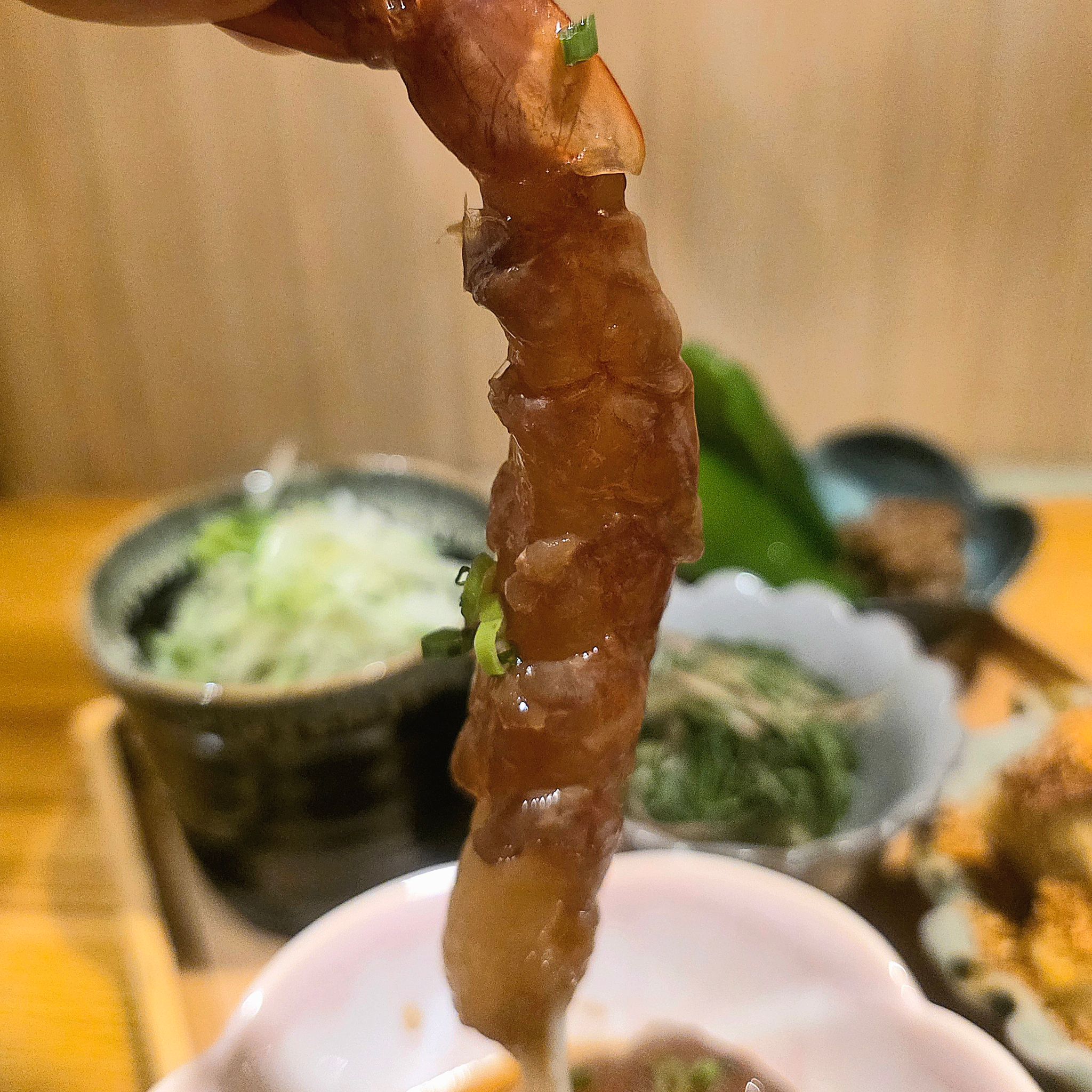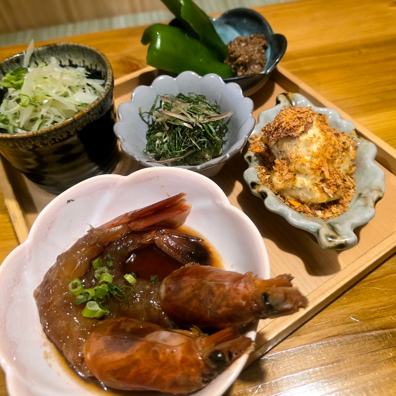 前菜盛り合わせは、酔っ払い海老、金のポテトサラダ、真蛸の山椒わさび、あそばれのよだれ鶏、鳥みそピーマンの5品が勢ぞろい。まるで小さな贅沢を詰め込んだ宝石箱のような皿です。