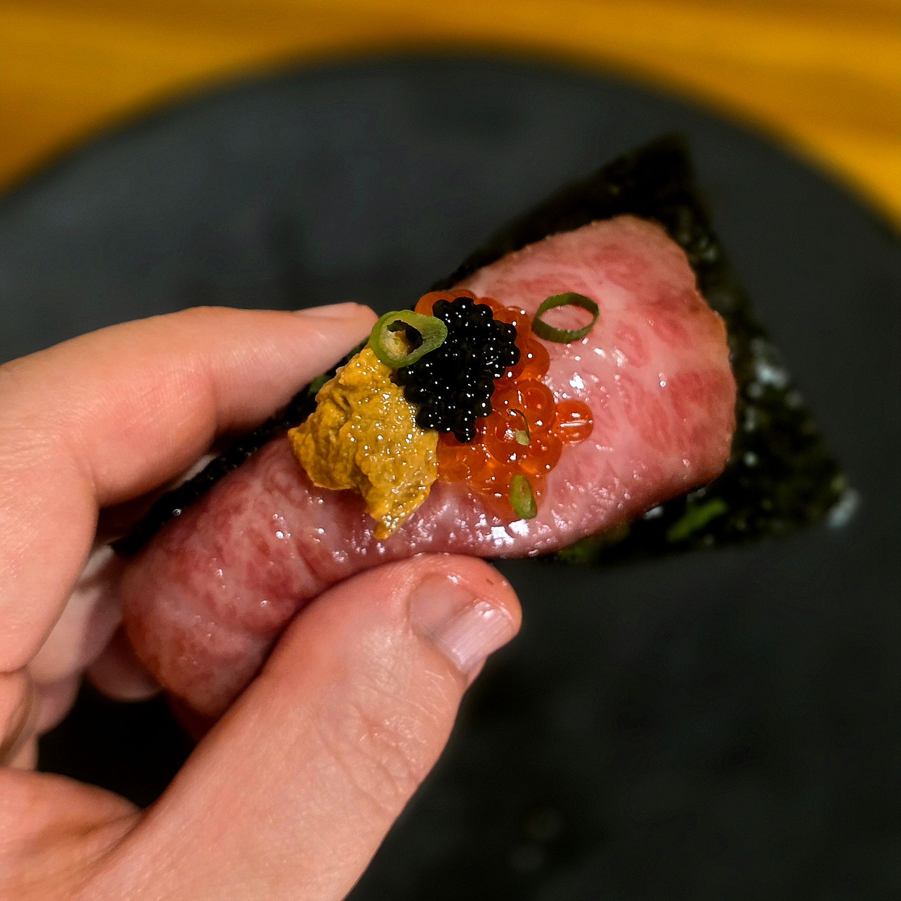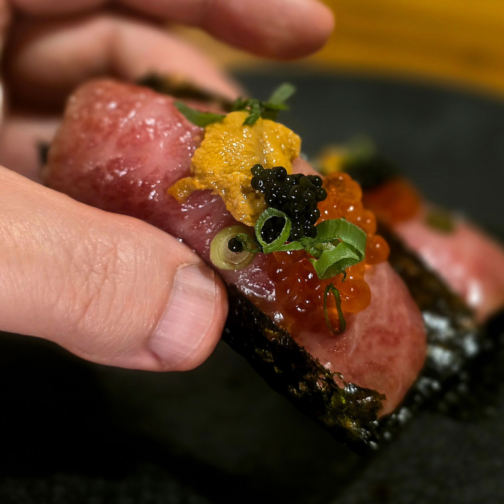 口に入れた瞬間、和牛の甘み、雲丹の濃厚なコク、いくらの塩味、キャビアの香りが同時に踊り出して、脳が追いつかないほどの多幸感。これは事件級にうまいです。