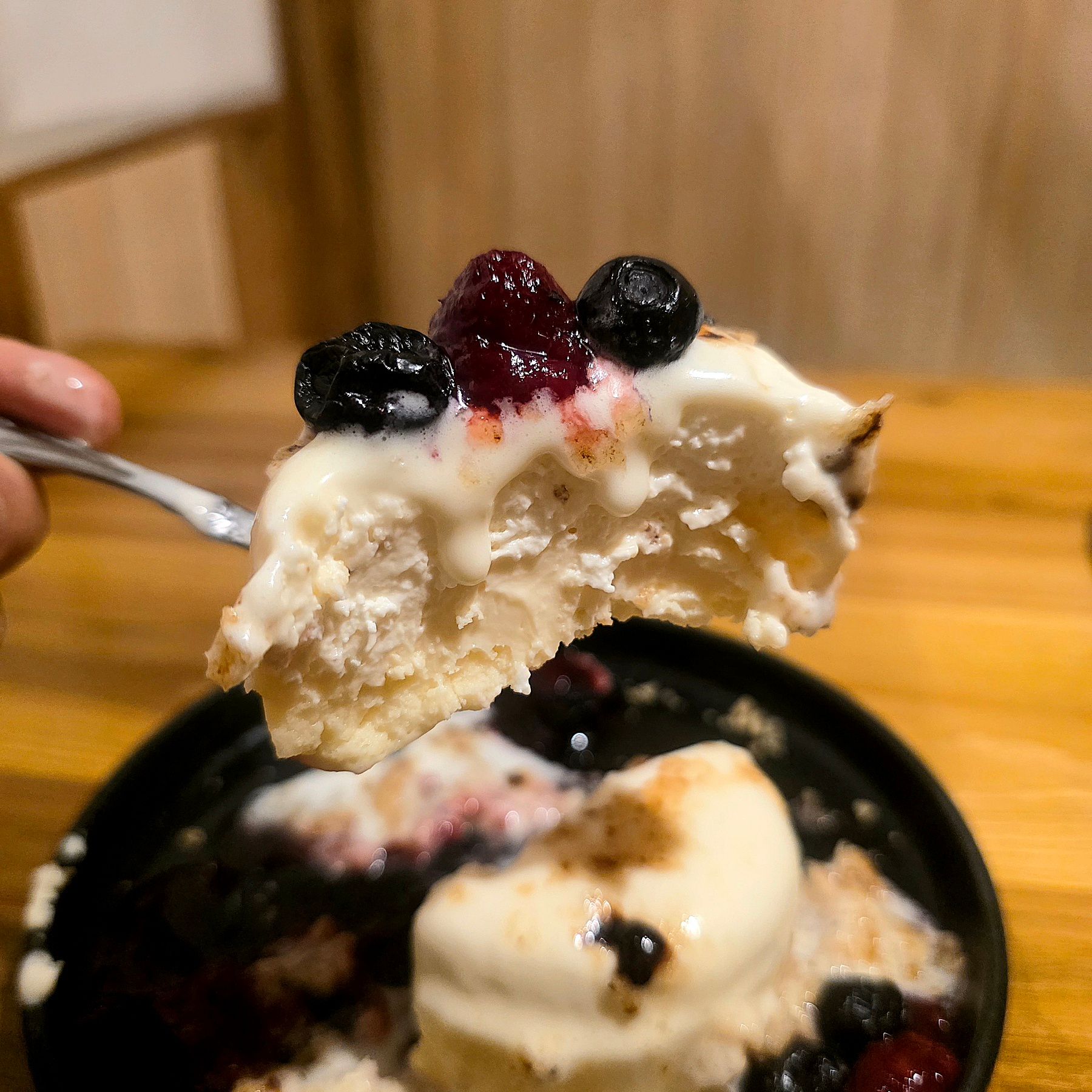 口に含むと軽やかで爽やかな甘さが広がり、ベリーソースを絡めると一気に味が跳ねる。文句なしで優勝。