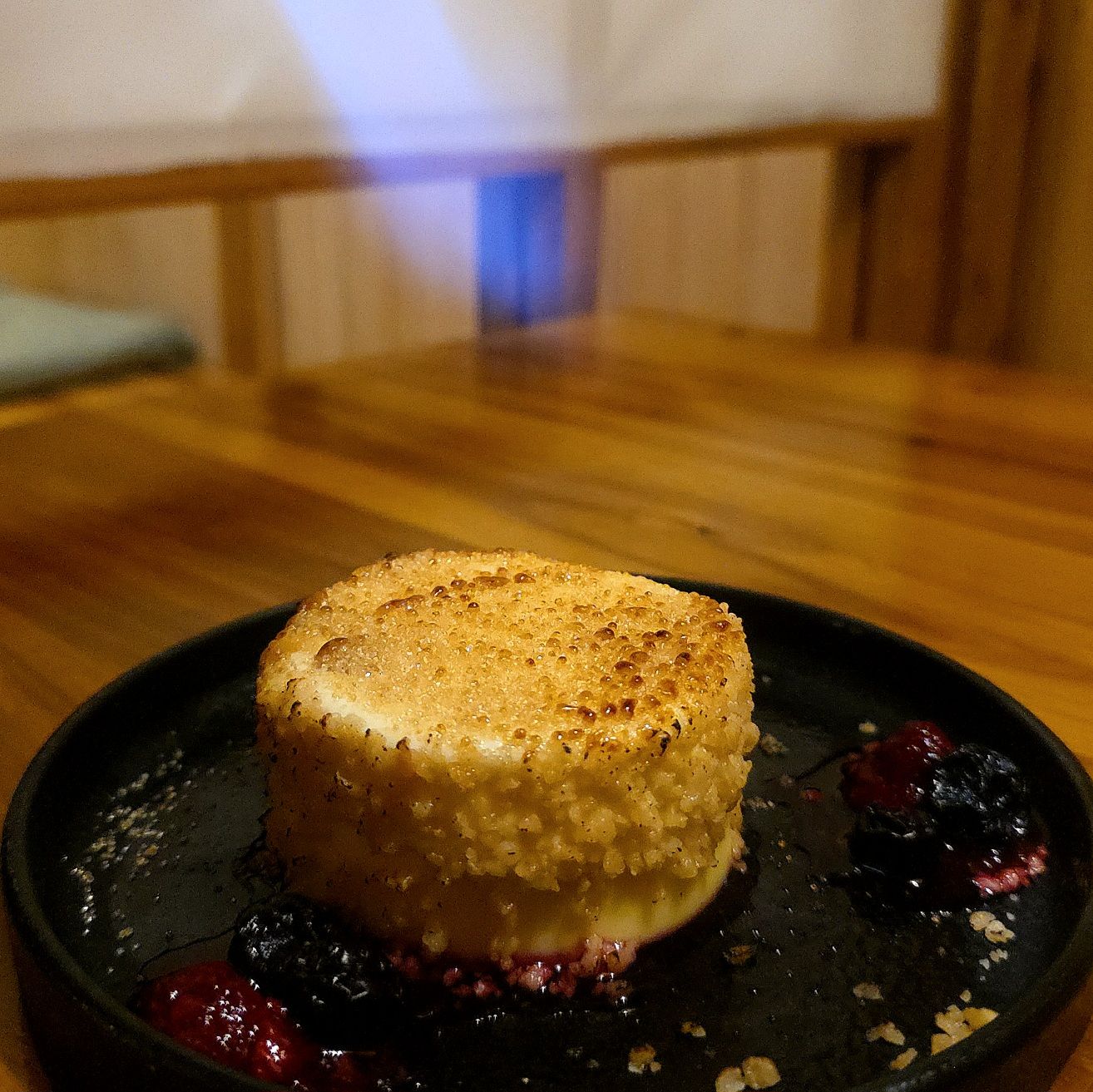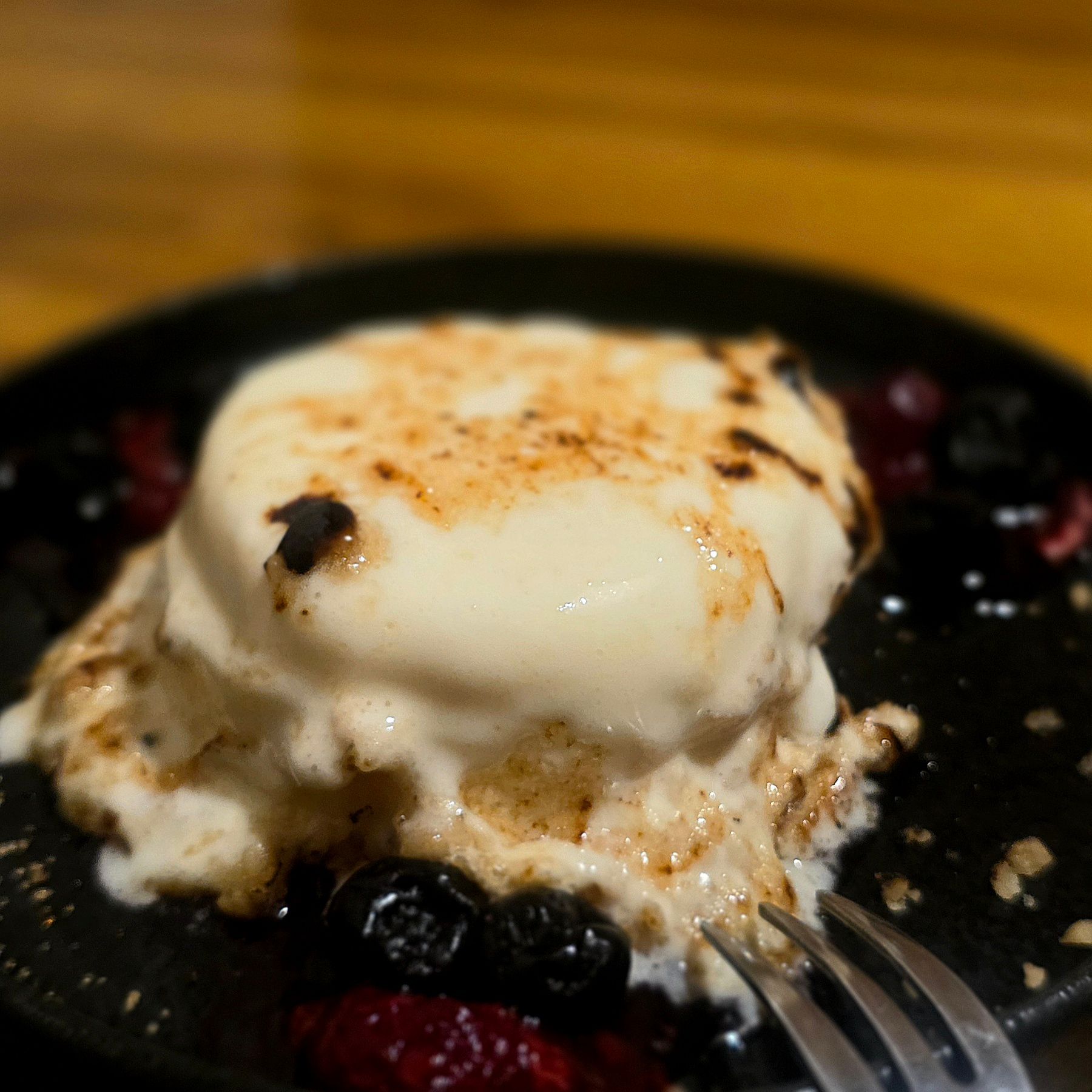 締めのデザートは「焼きレアチーズ(1,080円)」。目の前でフランベしてくれるライブ感がまた嬉しい。