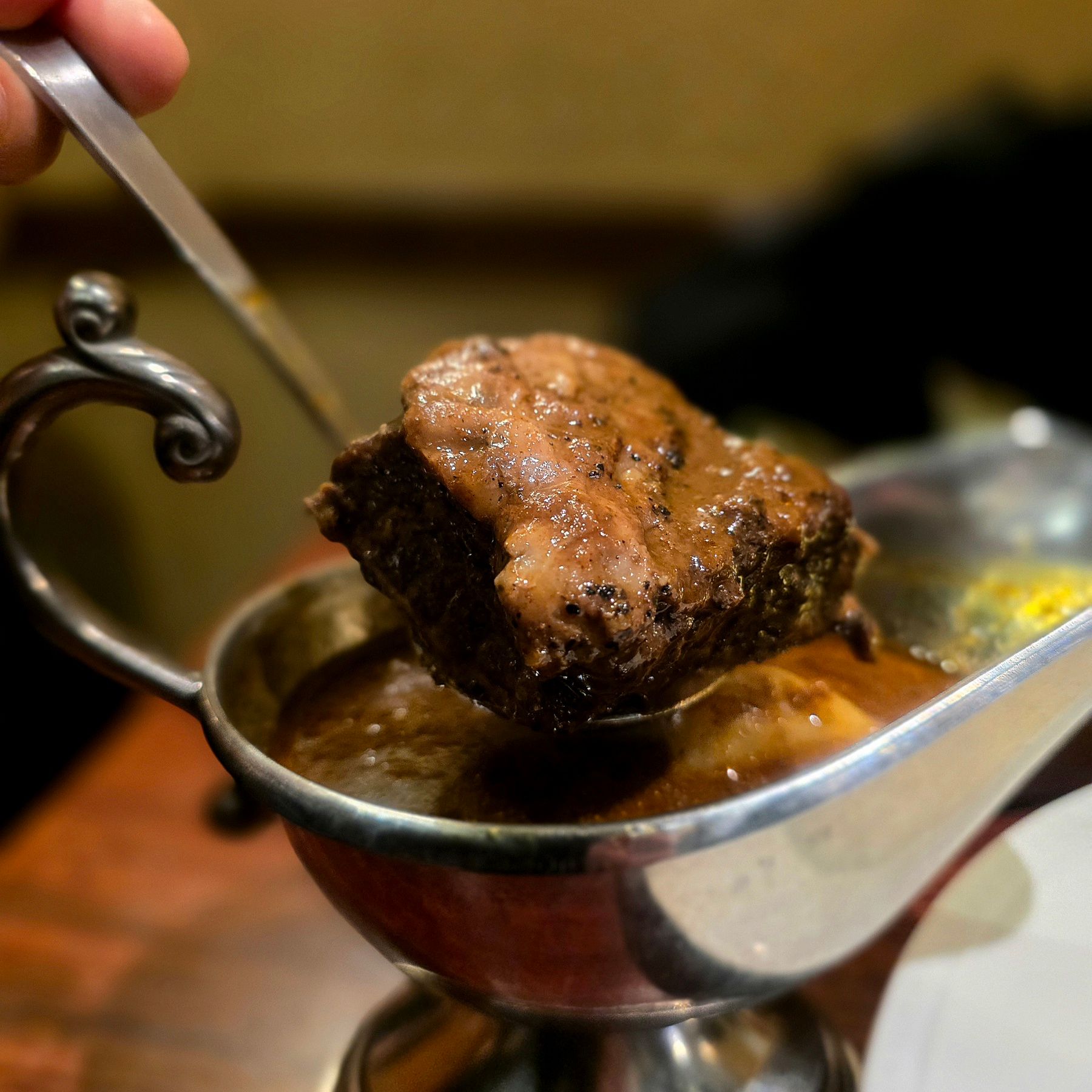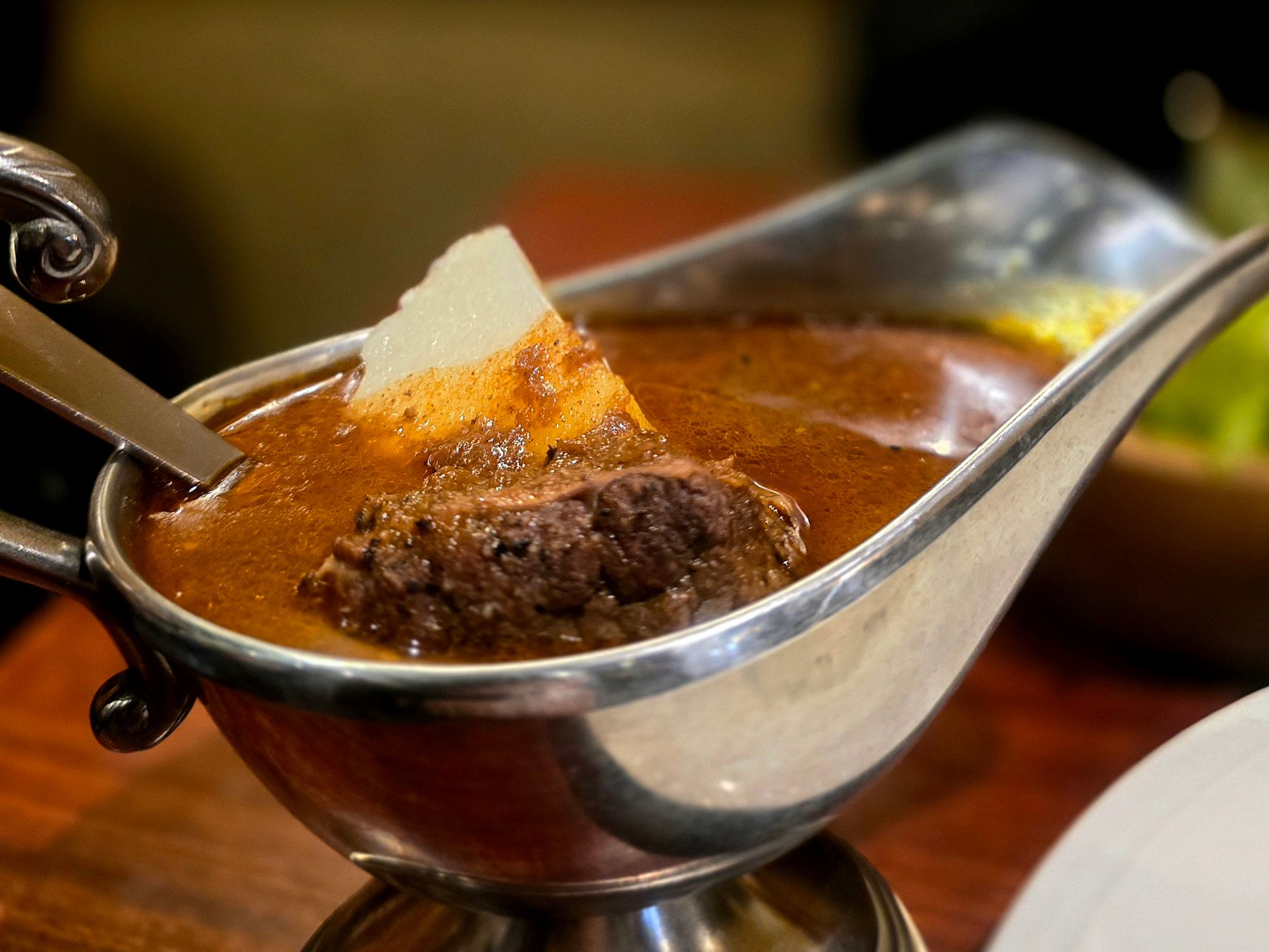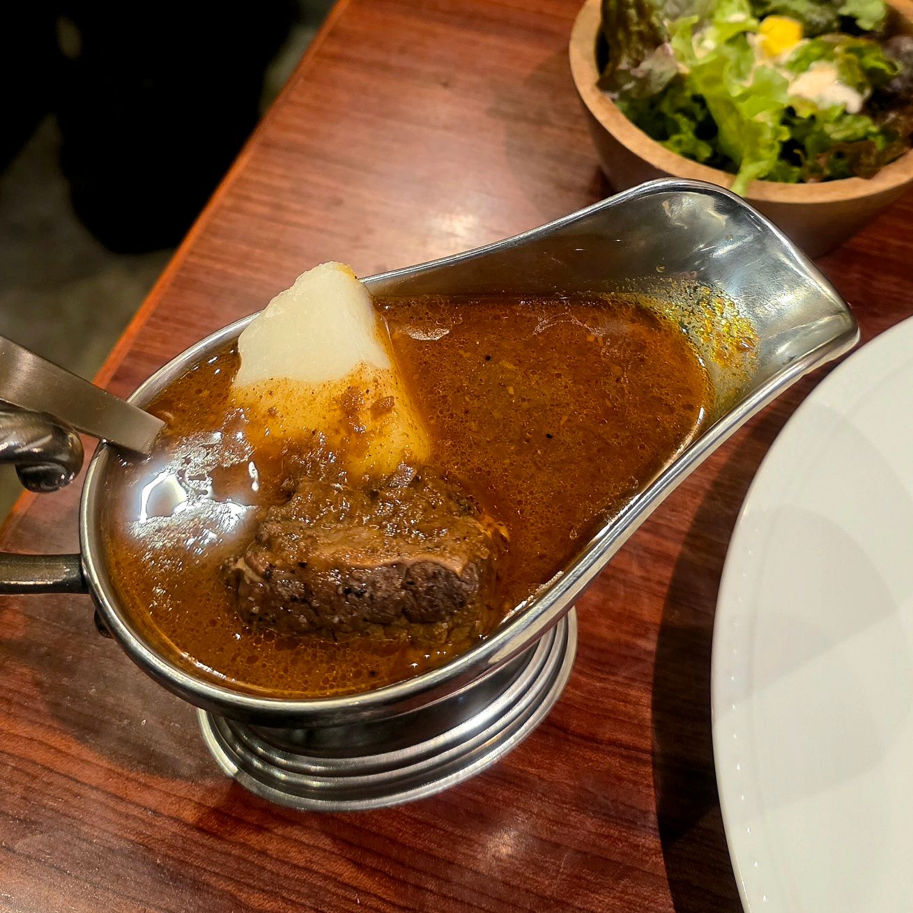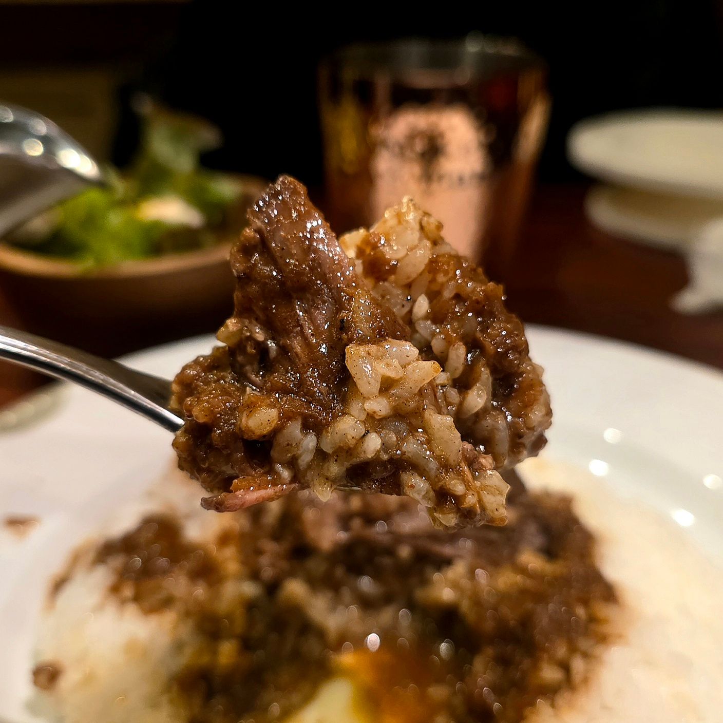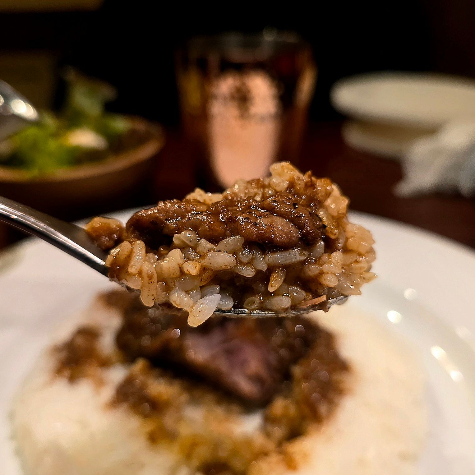 見た目はシンプルですが、香りは明らかに一味違います。ご飯に牛肉を乗せ、ルーをじゅわっとかけて一口食べると――これが驚くほどに美味い。