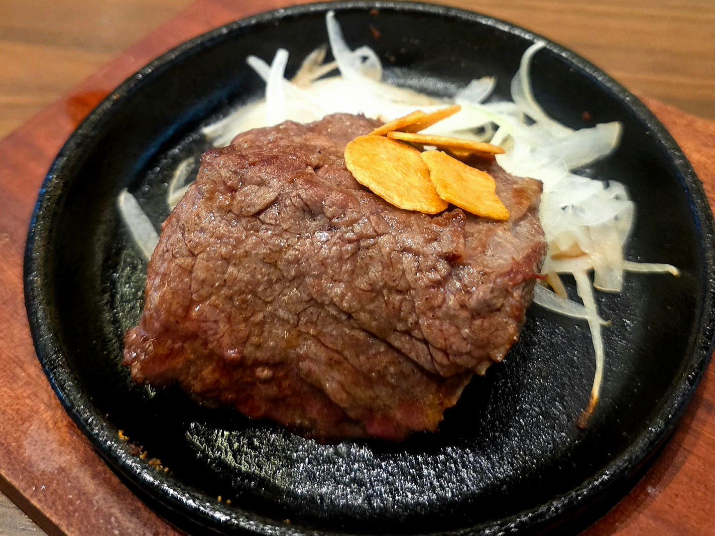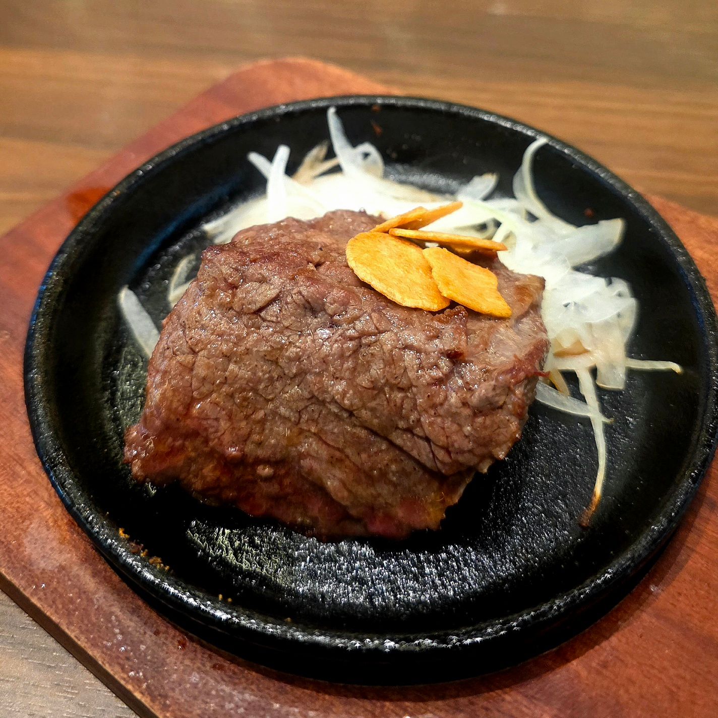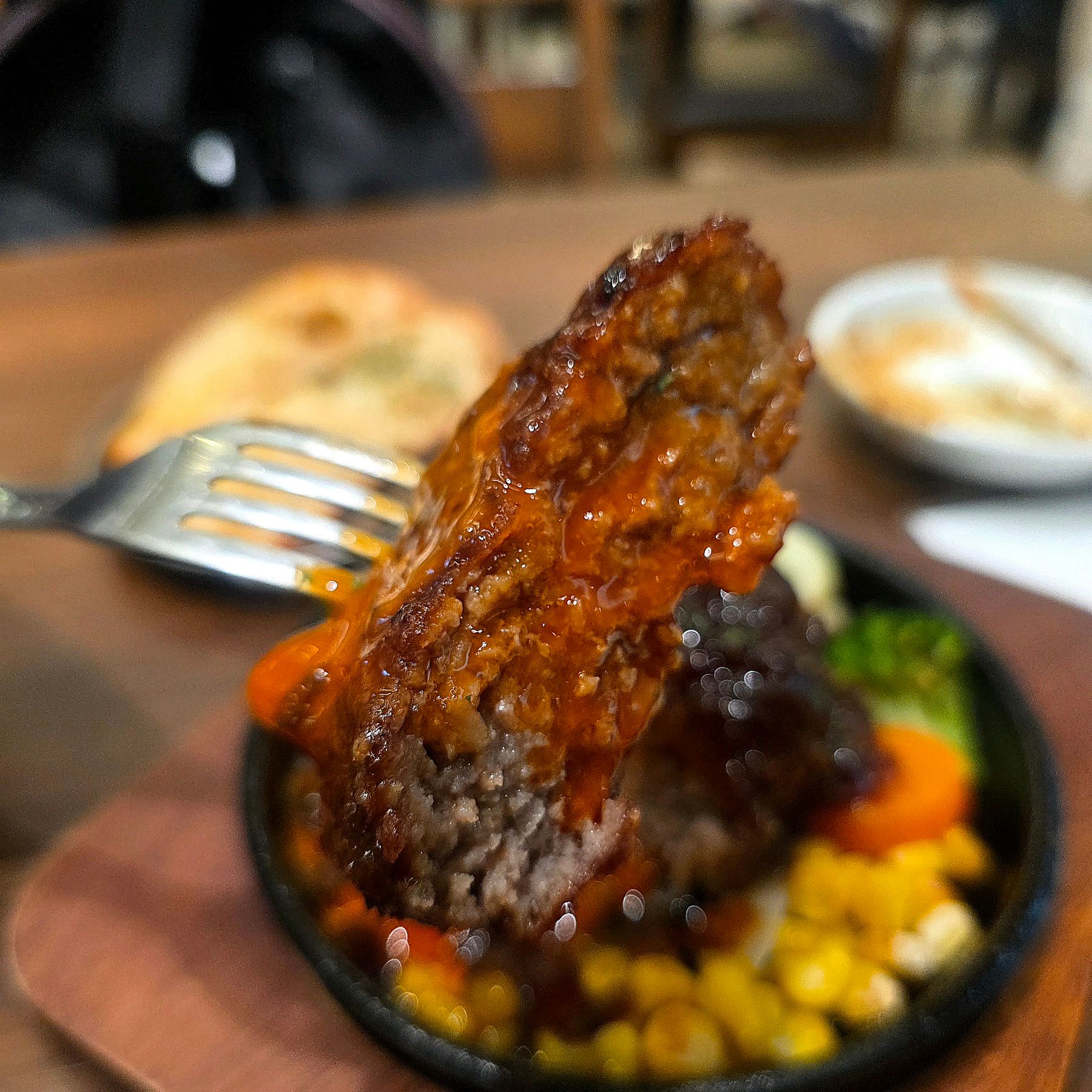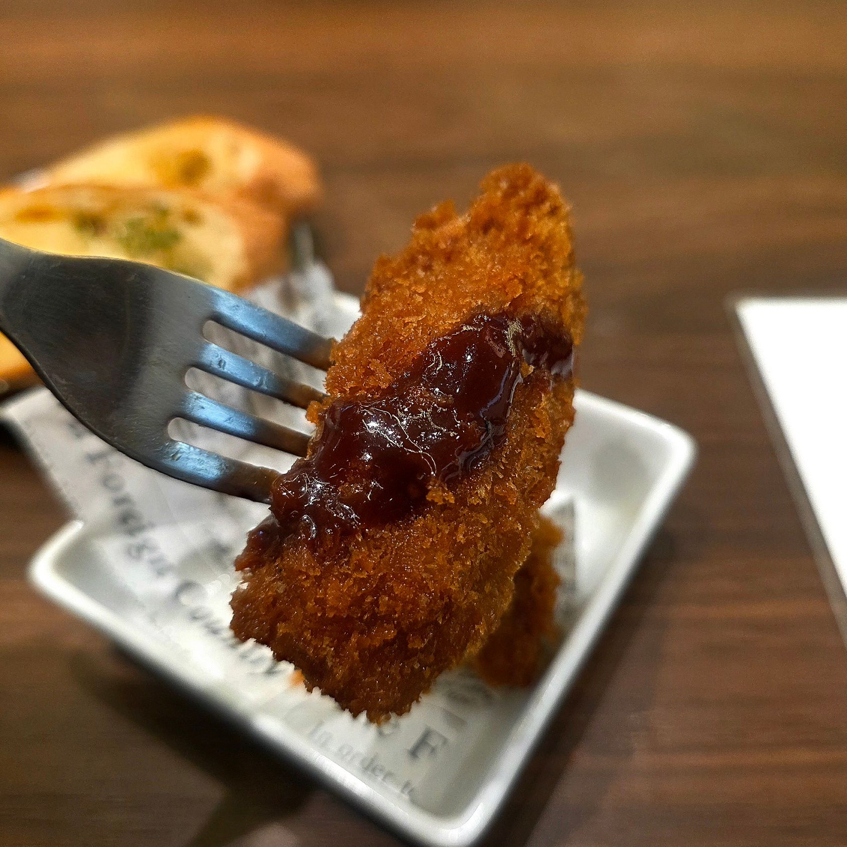 見た目はメンチカツっぽいけど、食べるとしっかり「ハンバーグ感」。中はジューシーで肉汁たっぷり、そこに黄身とオニオンソースが絡んでくる。これ、今日の中で一番“肉を食ってる”感があったかもしれない。
