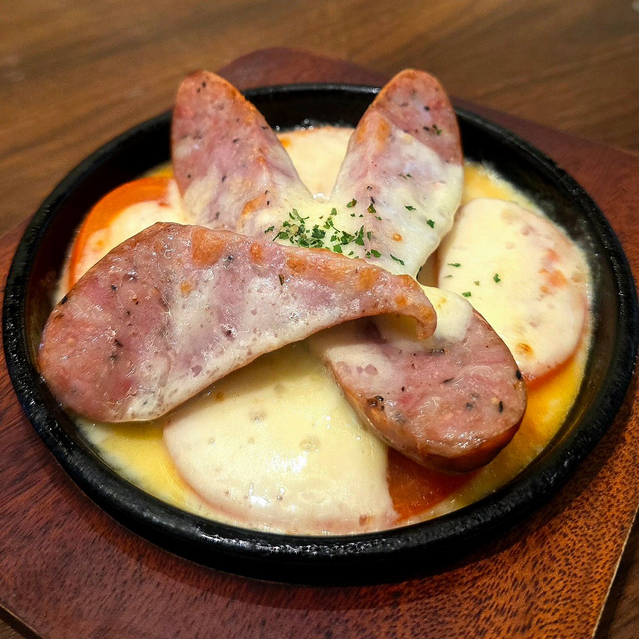 「トマトとウインナーのチーズ焼き(299円)」は、熱々トロトロ系の一皿。