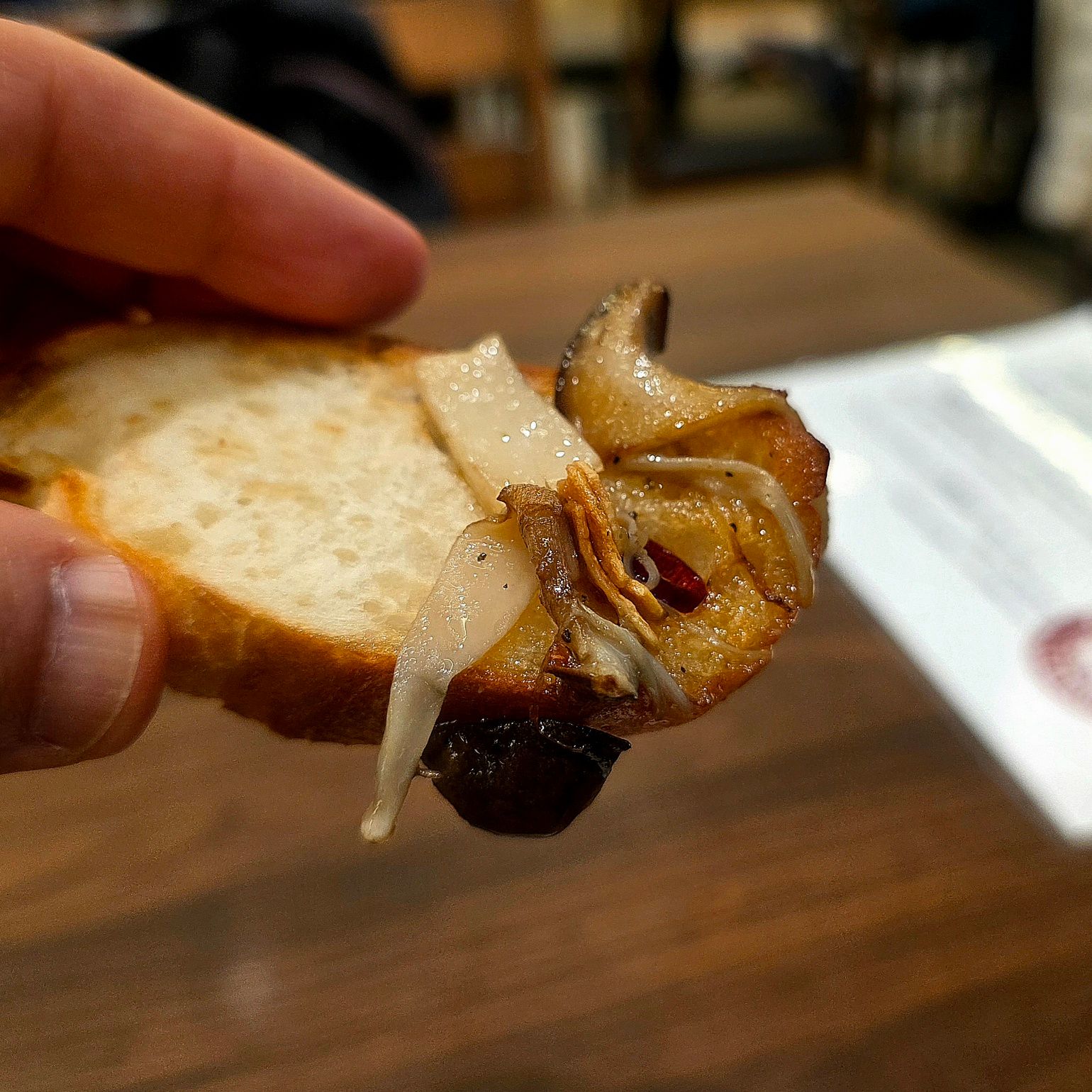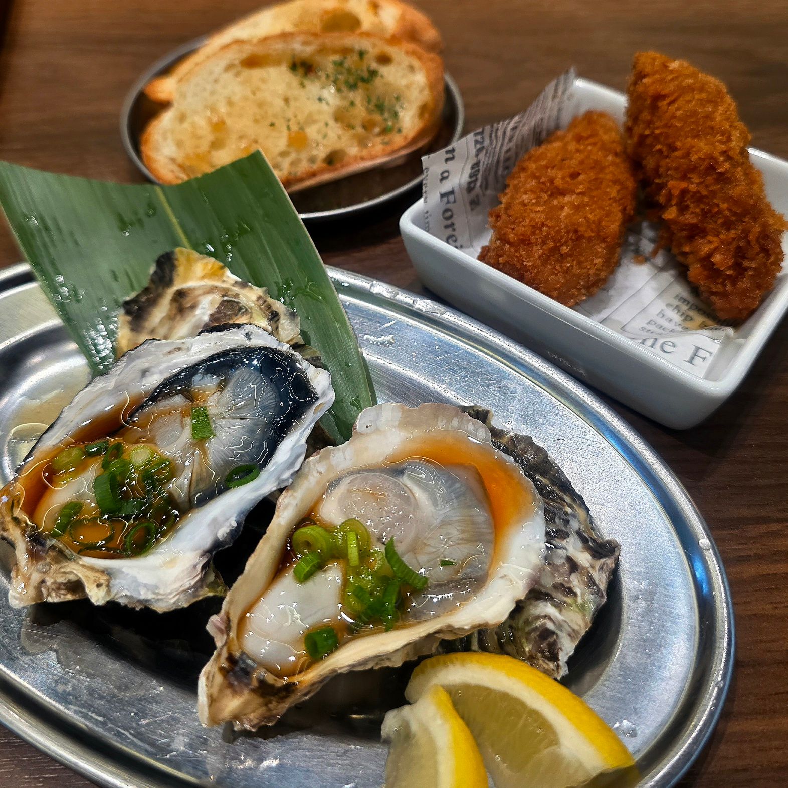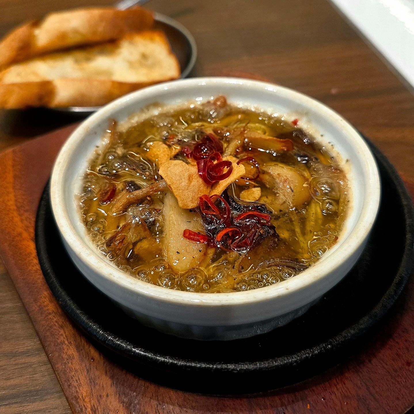 「ガーリックトースト(139円)」は、想像通りの安定の味。バターとにんにくの香りがしっかり効いていて、アヒージョの残りオイルとも相性抜群。