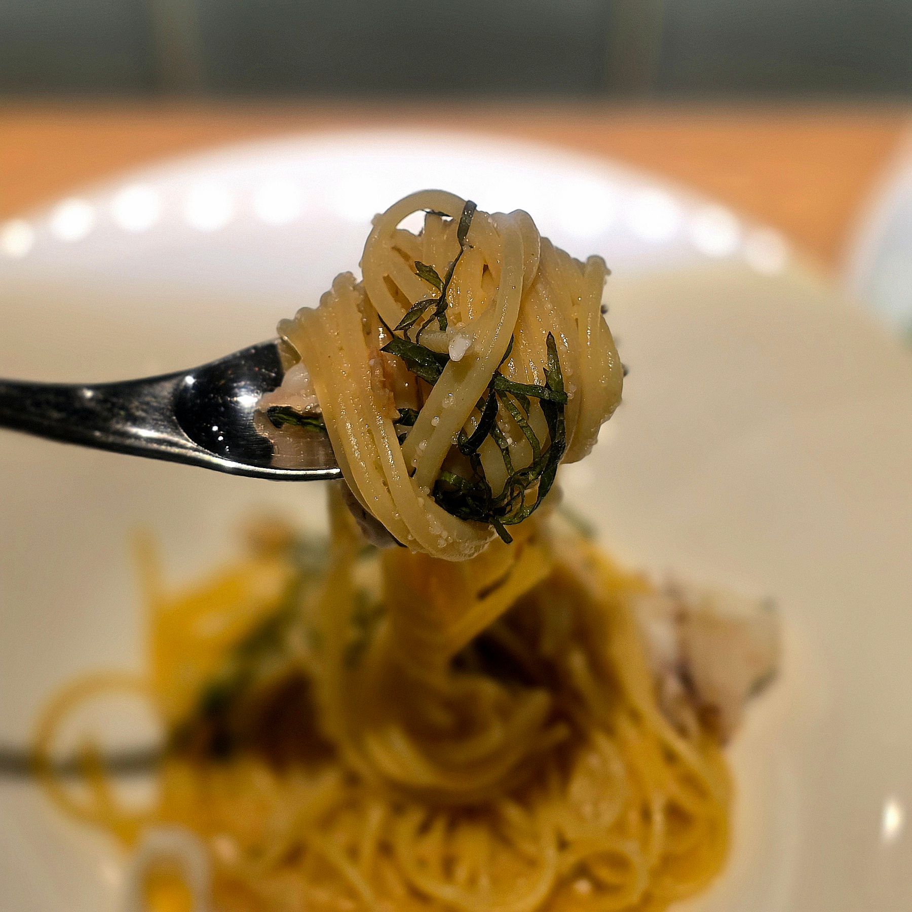 生パスタを使っているとのことで、ひと口噛むと、ちょっとした弾力を感じます。そしてゆっくりほぐれて広がる食感が広がります。