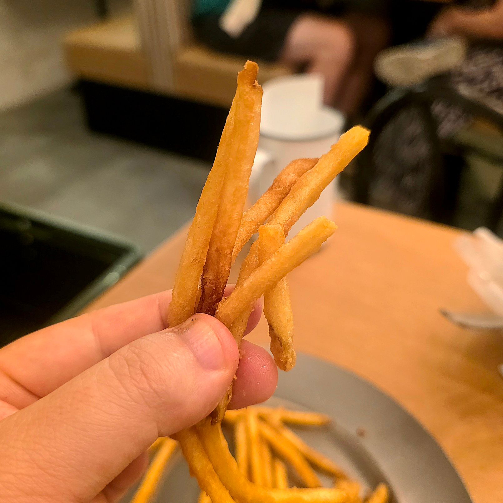 付け合わせのポテトは細めカットで、揚げたてアツアツ。外はカリッと、中はホクっとしていて、熱さと香ばしさが口の中で弾けます。塩加減も程よく、バーガーとの相性も抜群。