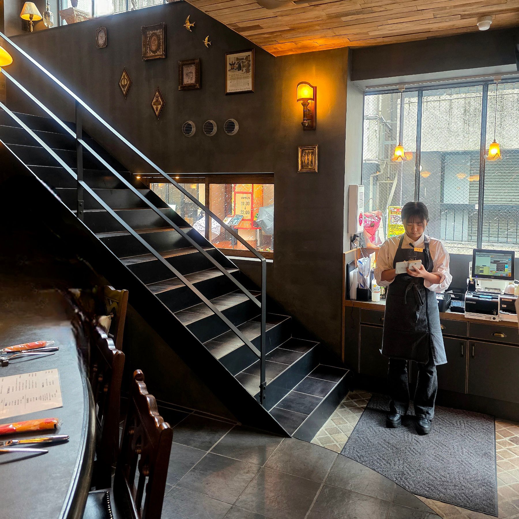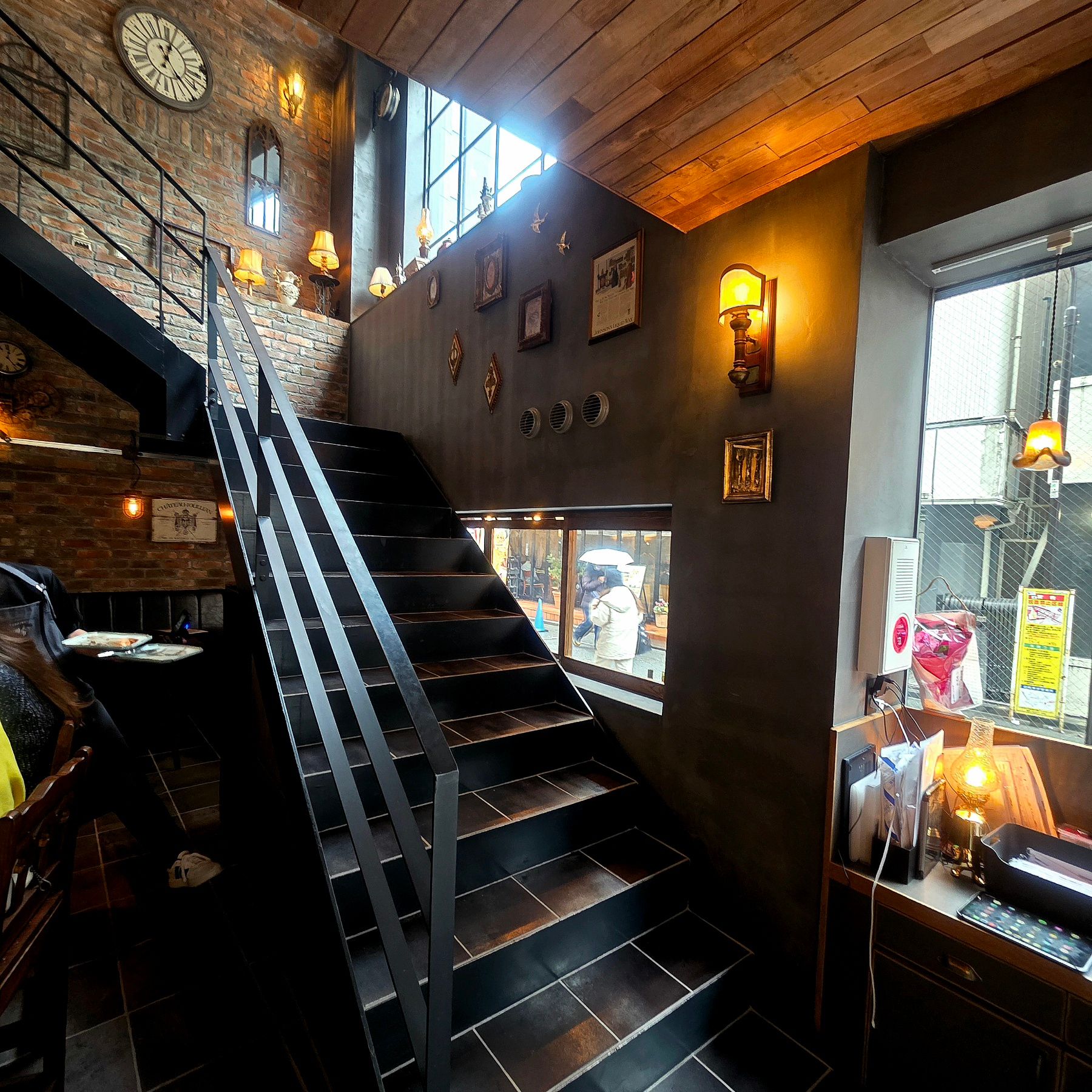 店内はアンティーク調の落ち着いた空間で、螺旋階段が印象的な造り。
