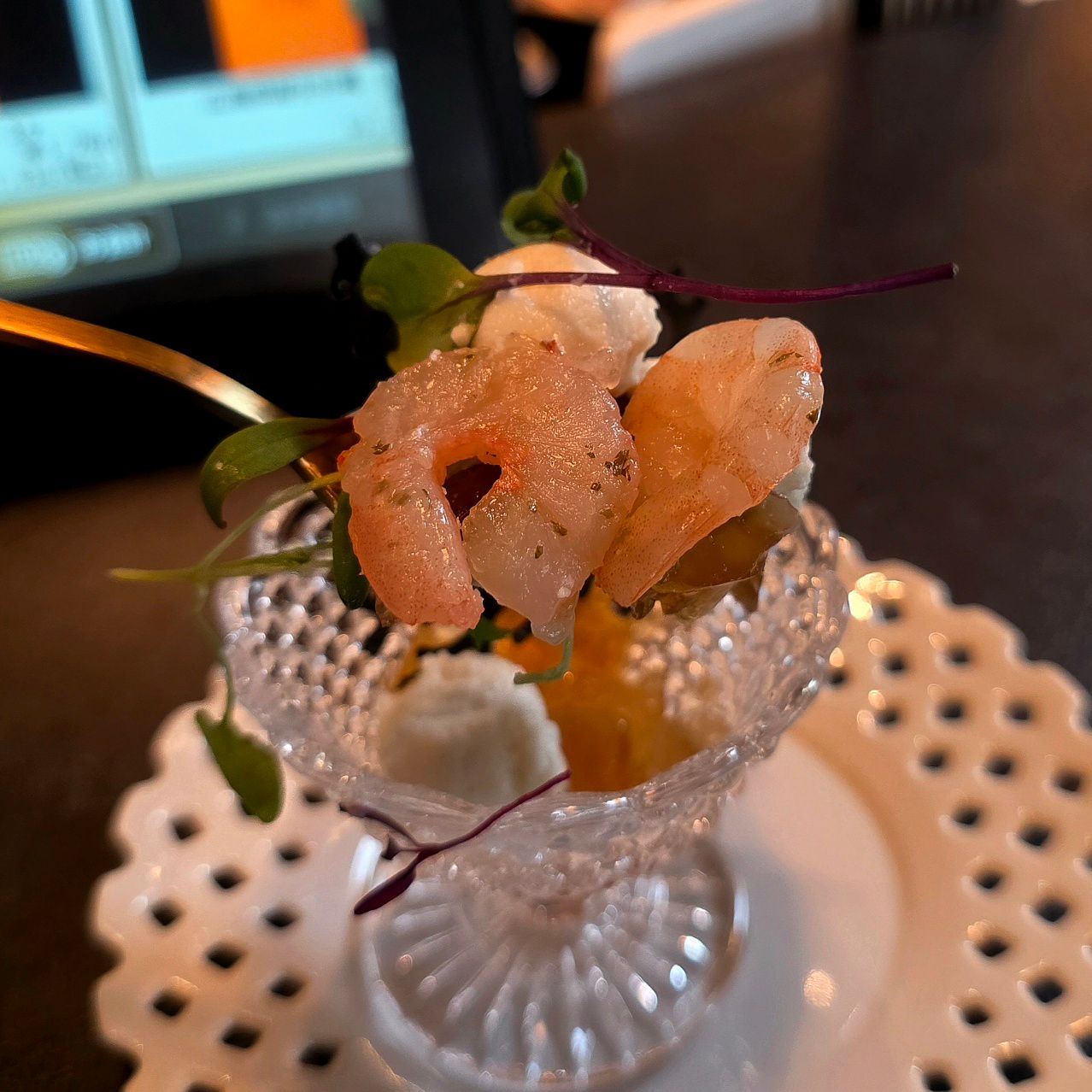 皿の底のジュレと軽く混ぜていただくと、口当たりはとてもなめらかで上品。カリフラワーの優しい甘みの奥から、エビの旨みがじんわり広がります。