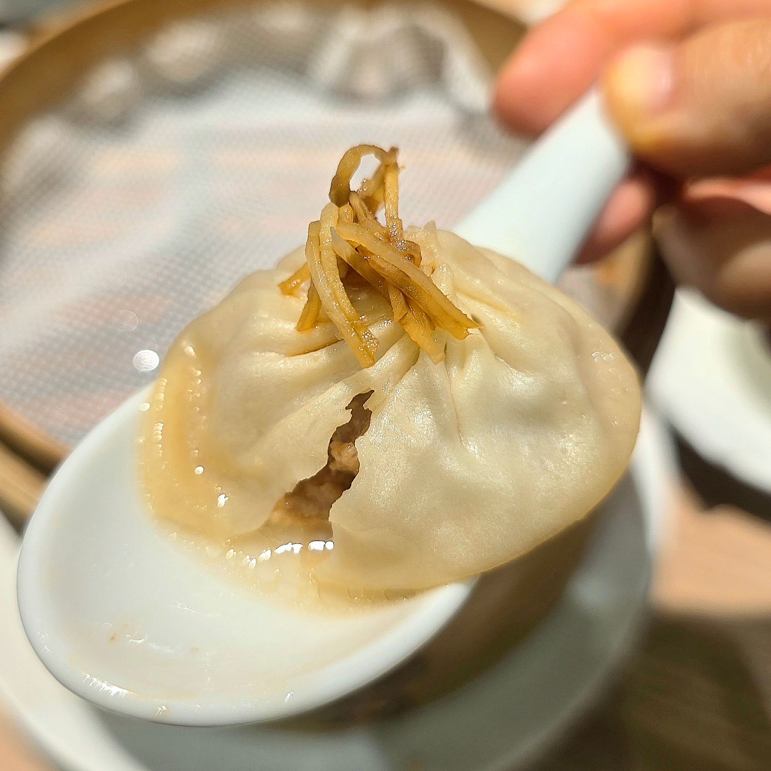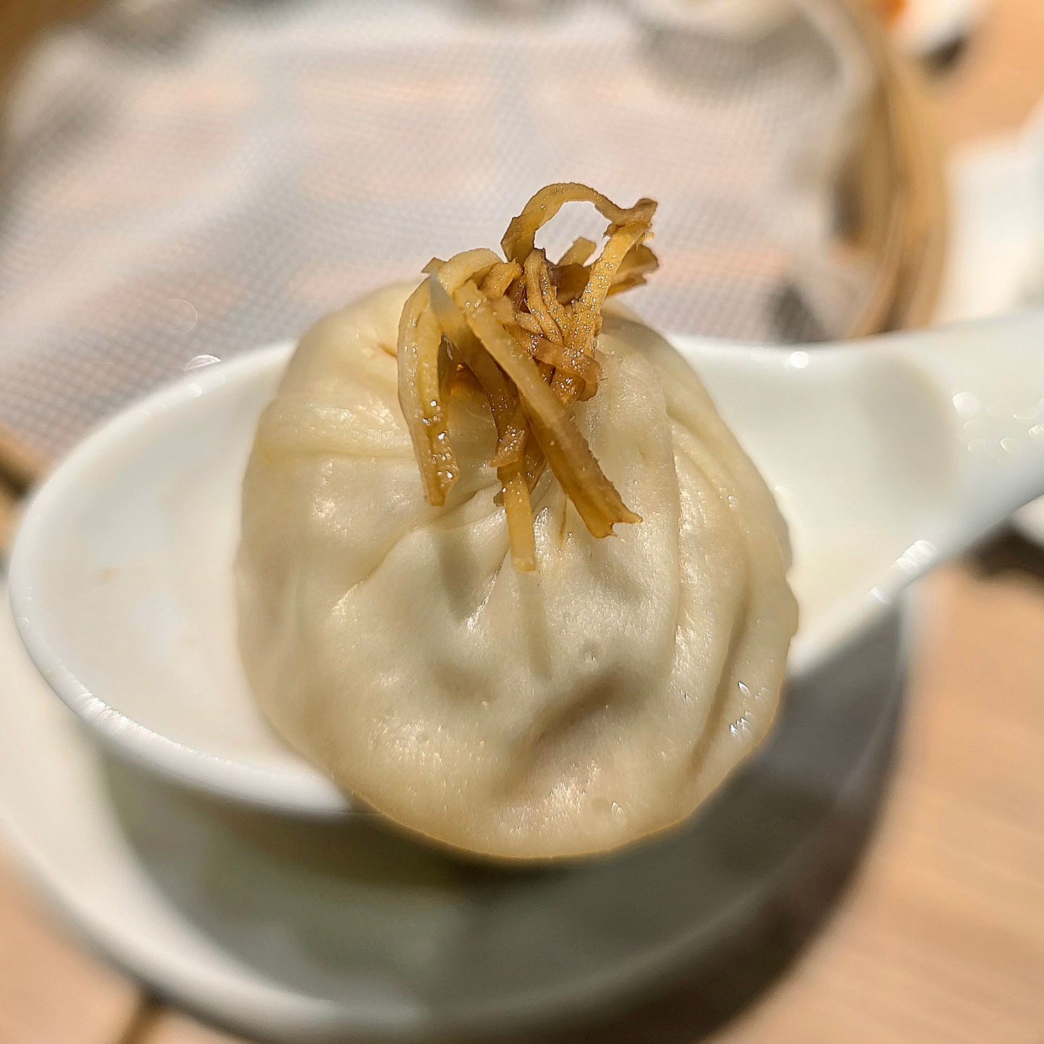 そして小籠包。これがまた絶品。薄皮を箸で優しく割ると、熱々のスープが溢れだし、湯気とともに肉の香りが立ち上る。