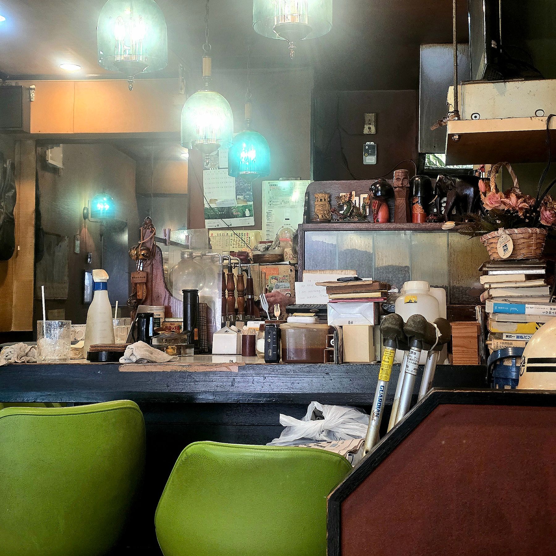 店内に入るとまず目に入るのは、レトロな空間に包まれた、黄緑色のビニールレザーの椅子たち。