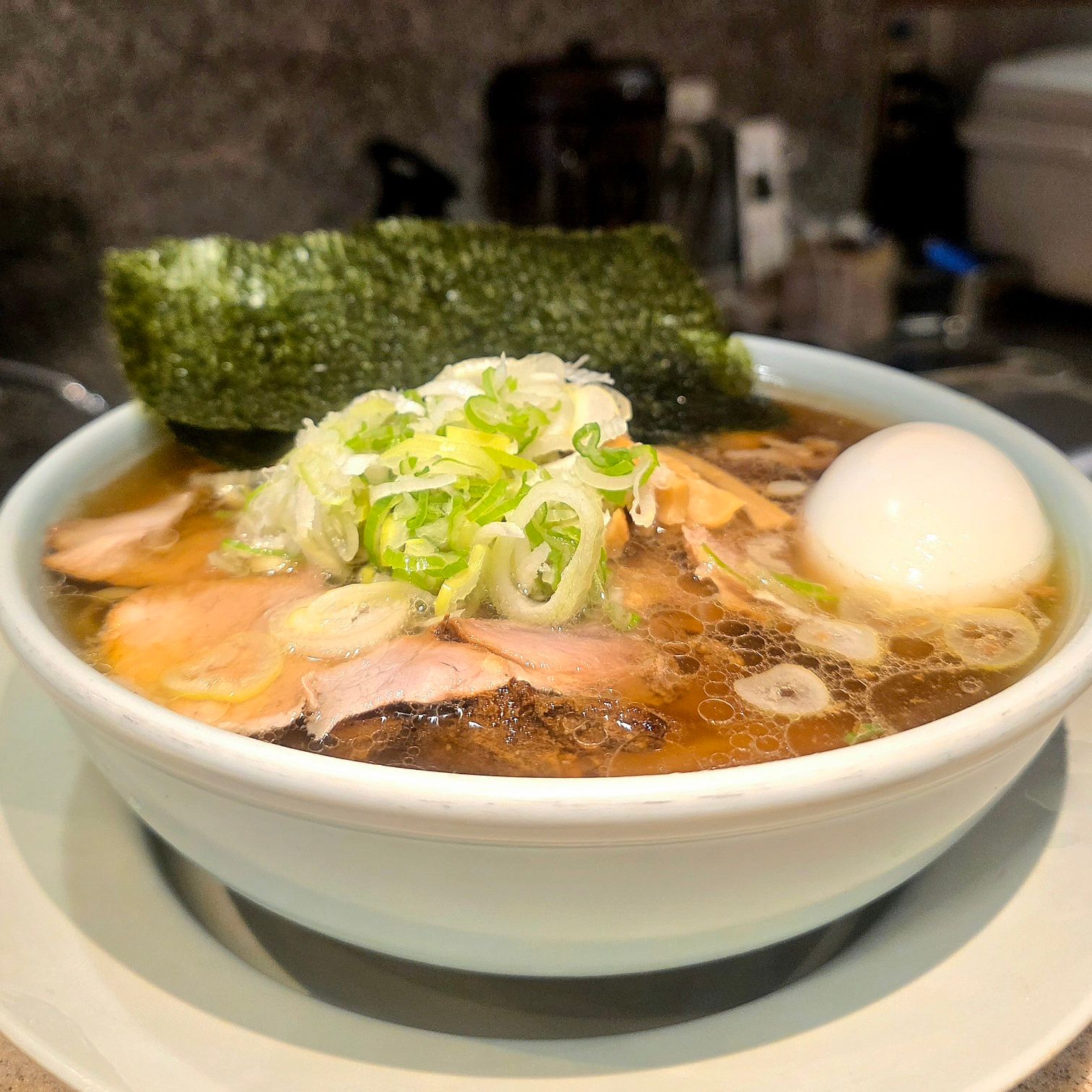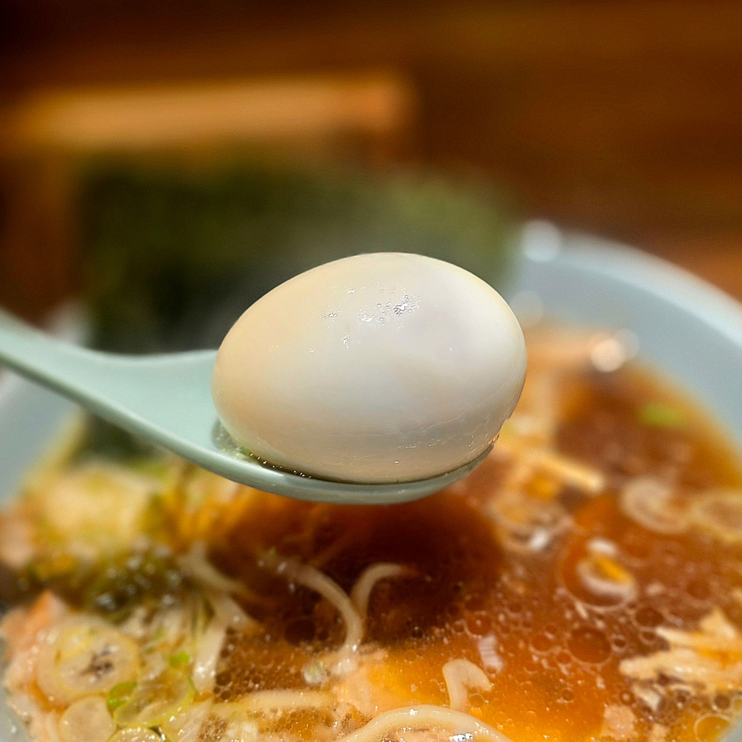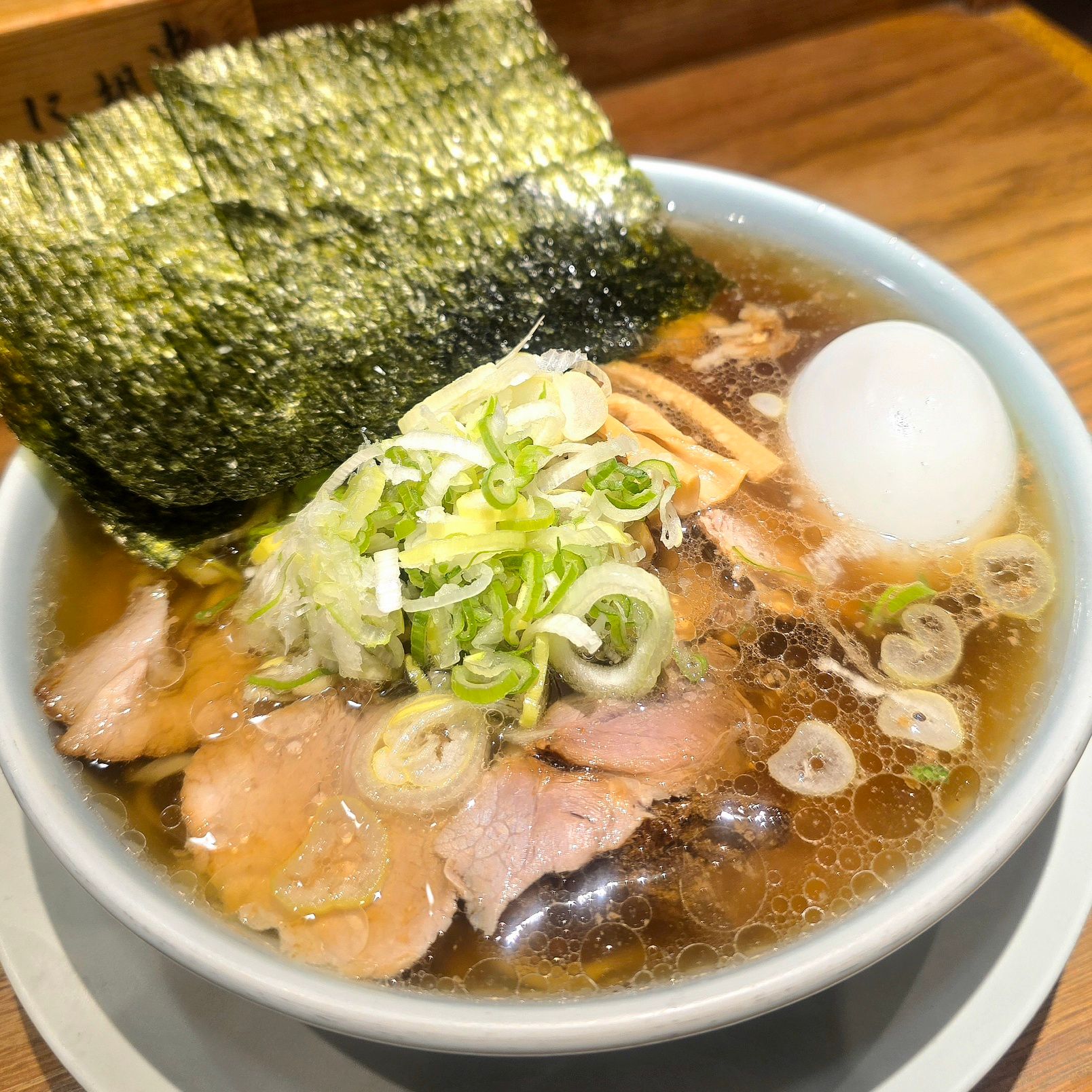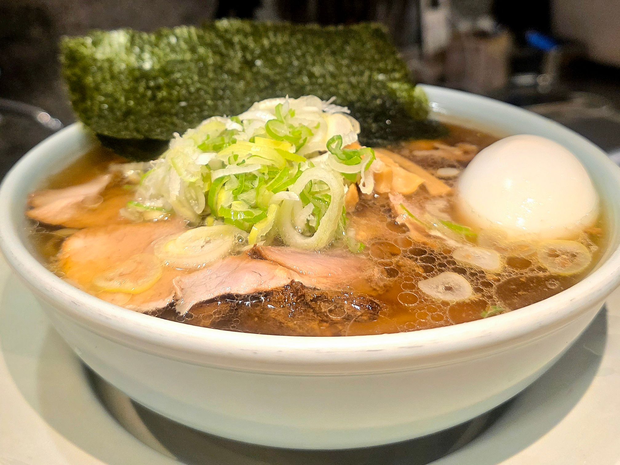 丼の縁を囲むチャーシューの迫力、油膜が光る澄んだ豚清湯スープ、そして鎮座するゆで卵、見た瞬間からテンションが上がります。