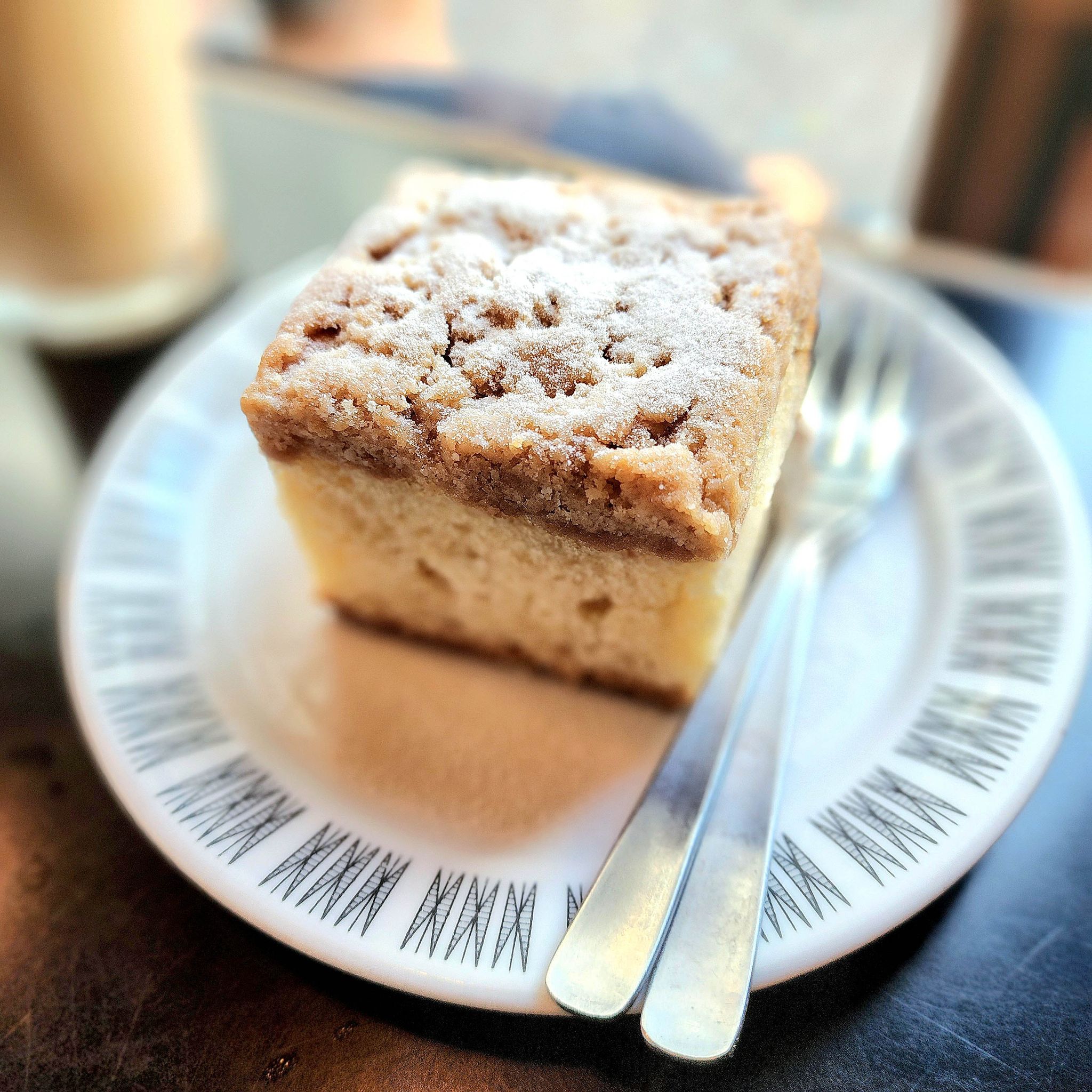 バターをたっぷり使ったふんわりとしたケーキの上に、甘くてカリカリのクラム(パン屑や小麦粉、砂糖、バターを混ぜて作るトッピング)がたっぷりと乗っています。
