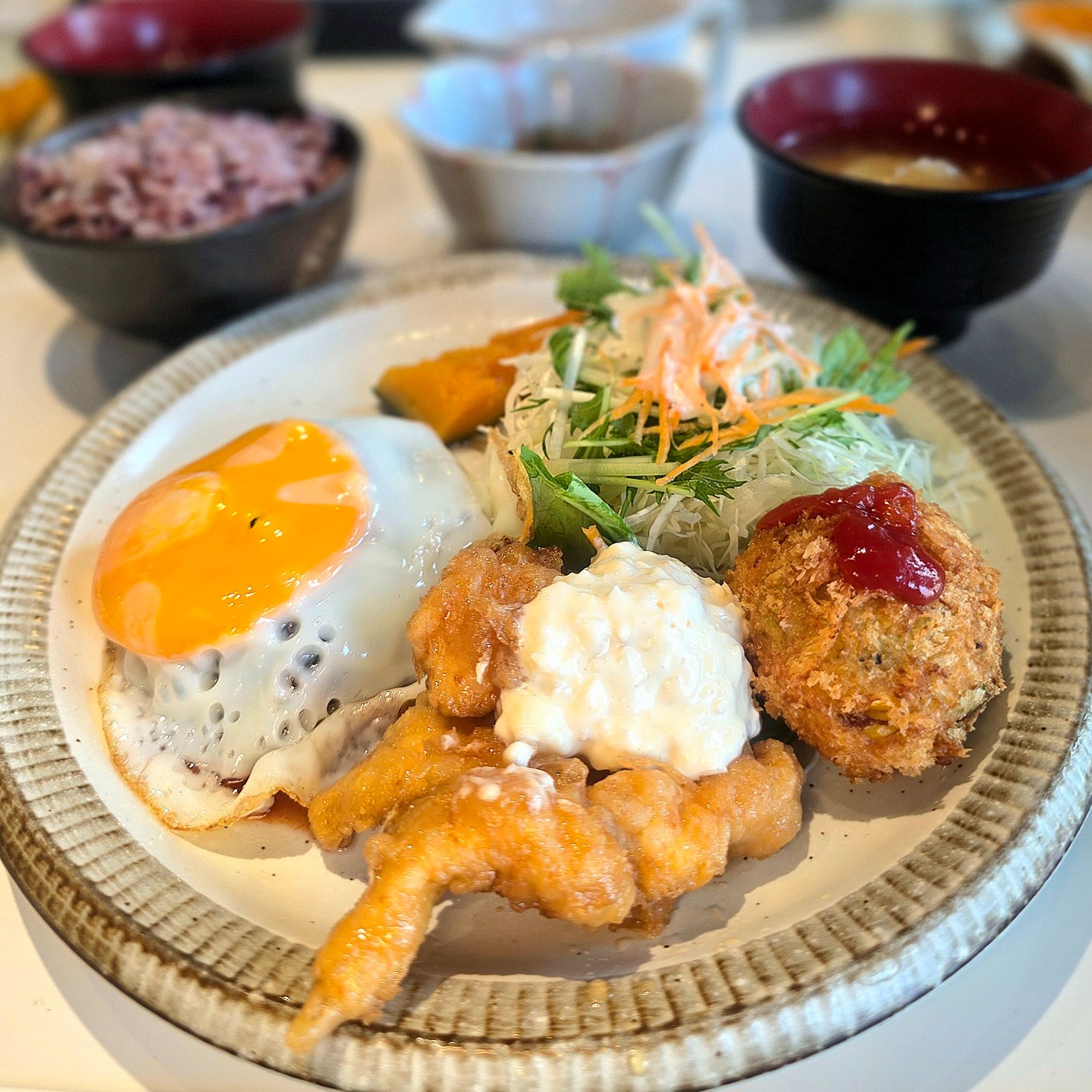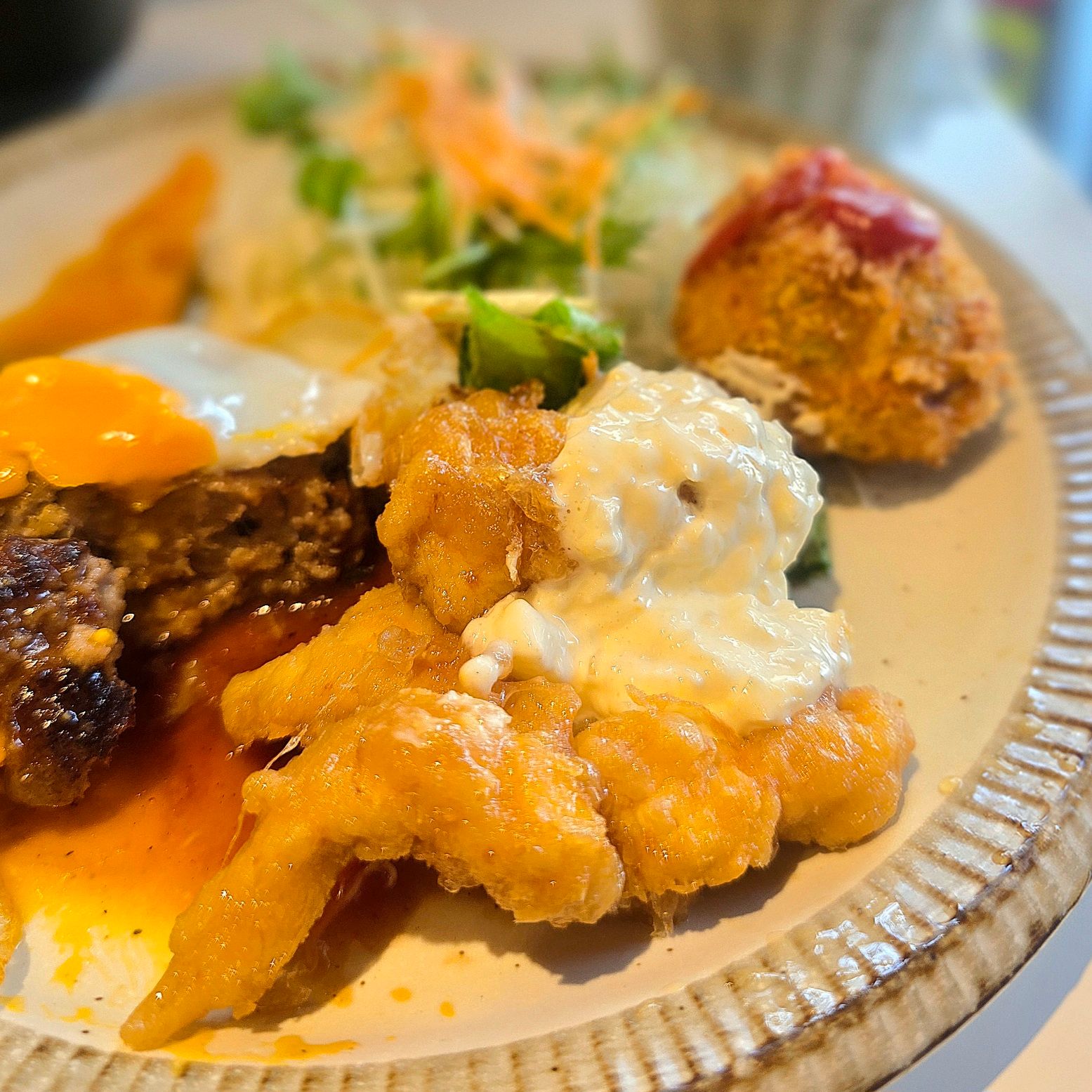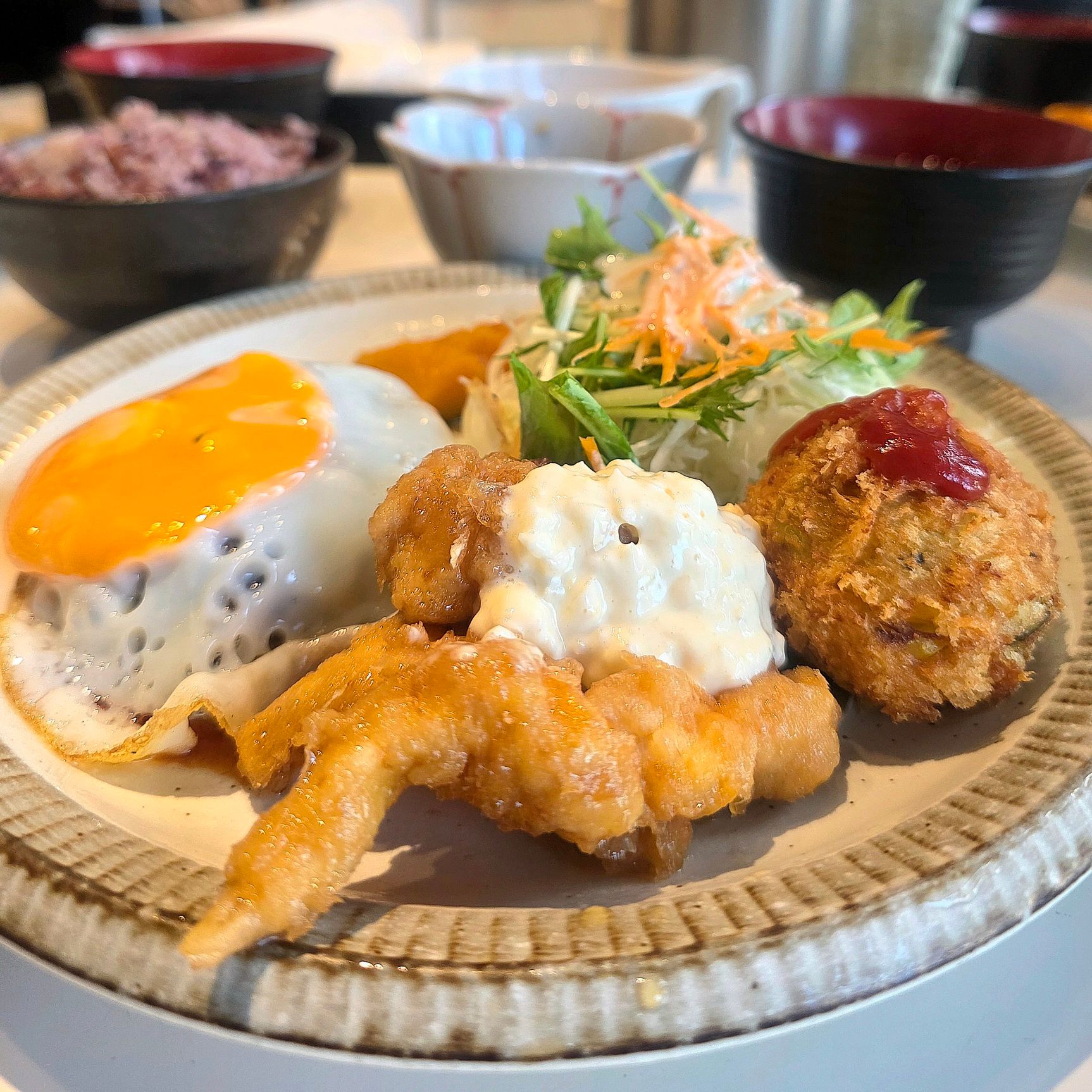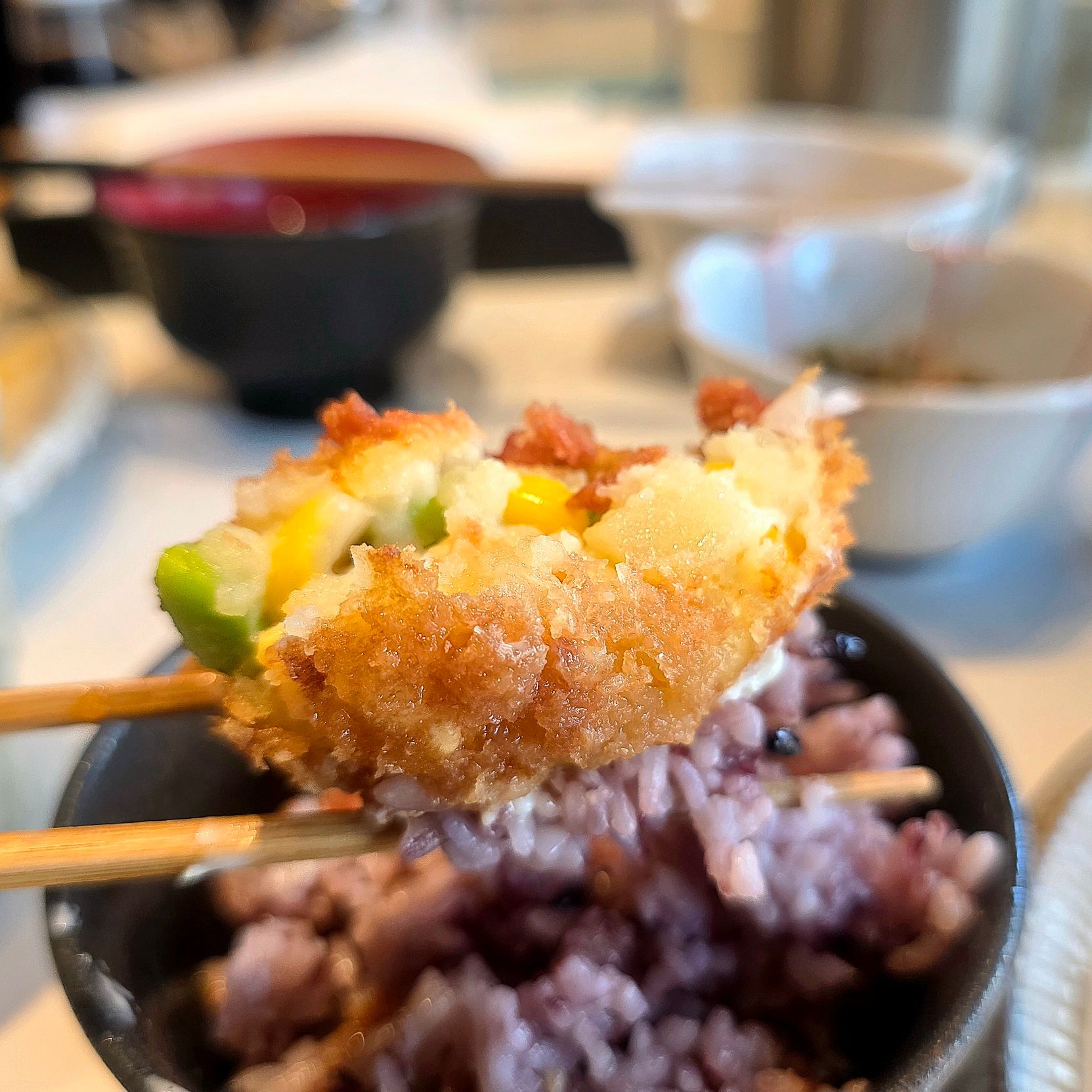 季節のコロッケには枝豆やコーンがふんだんに使われていて、衣は程よくサクッと、中はほくほく。豆の自然な甘さが効いていて、おかずにもそのままご飯にもぴったり。