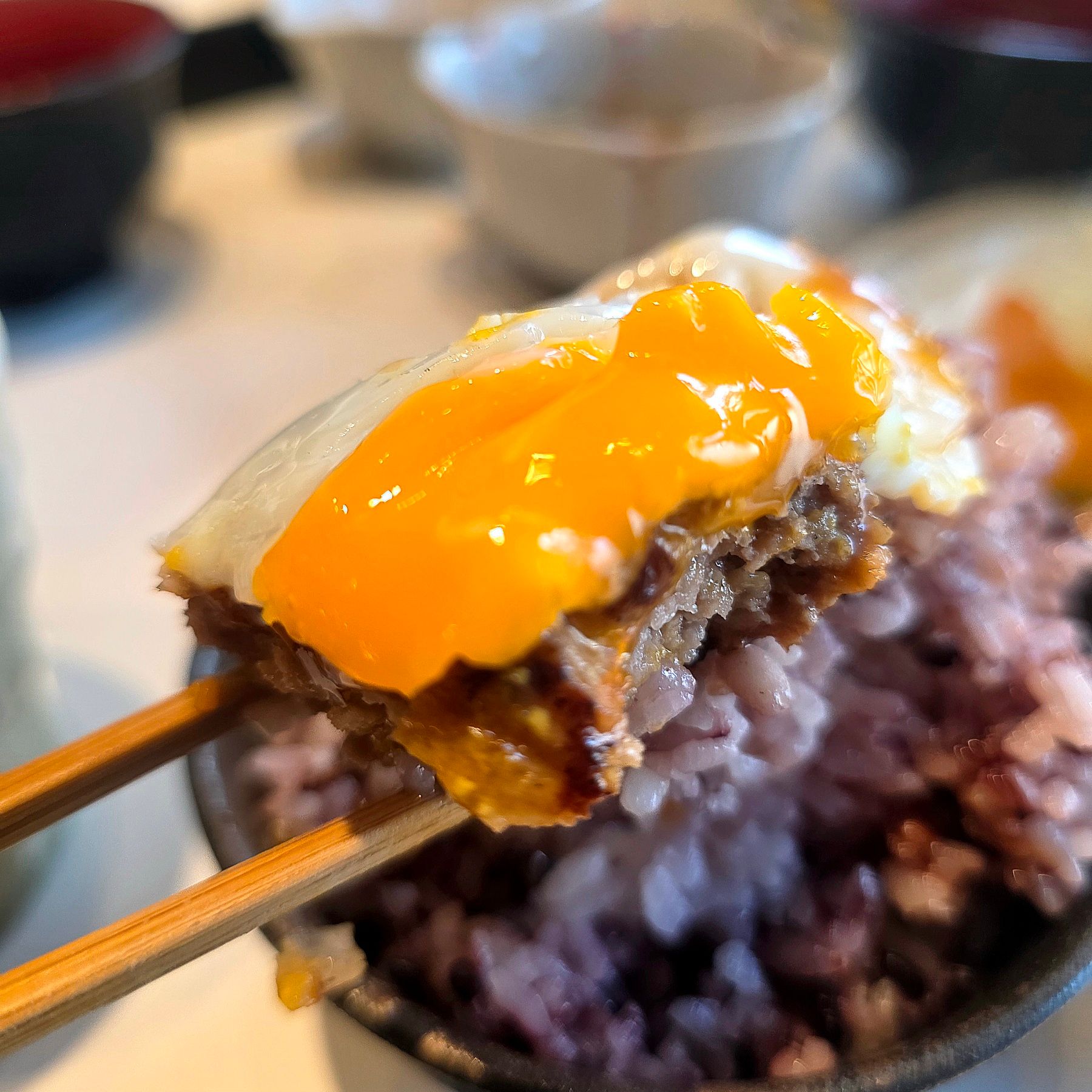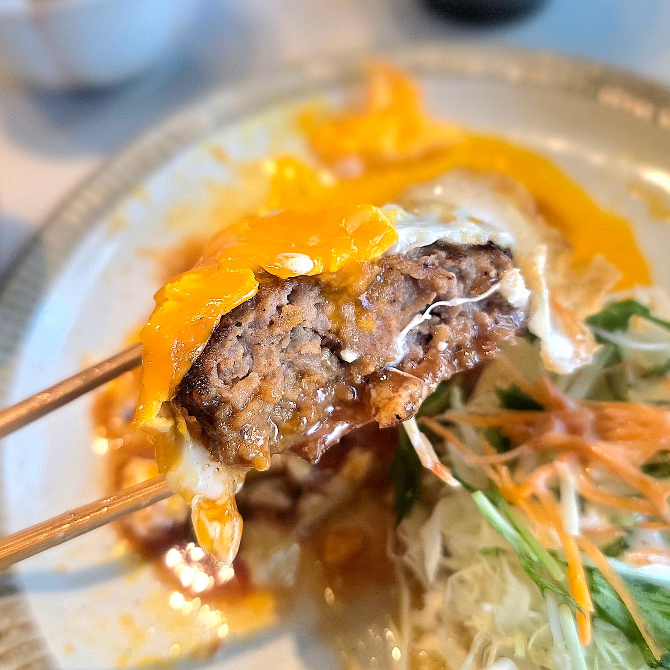 目玉焼きハンバーグは、美しく黄金の黄身がとろりと流れ出して、ハンバーグに絡むたびにジュワッと旨味が広がります。