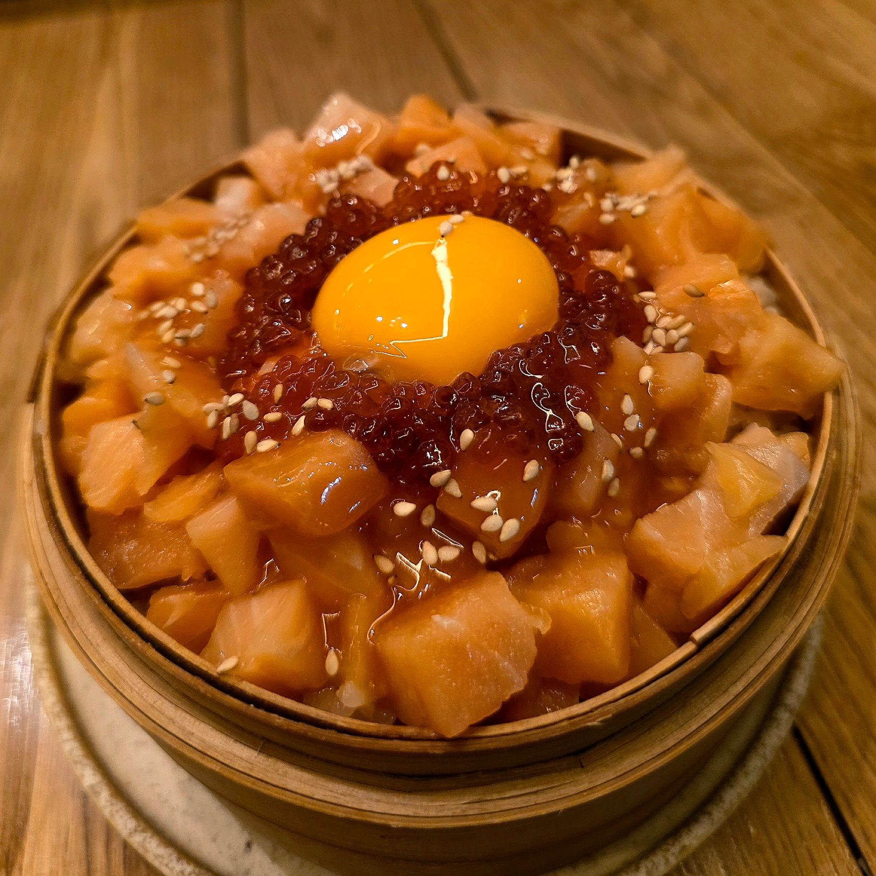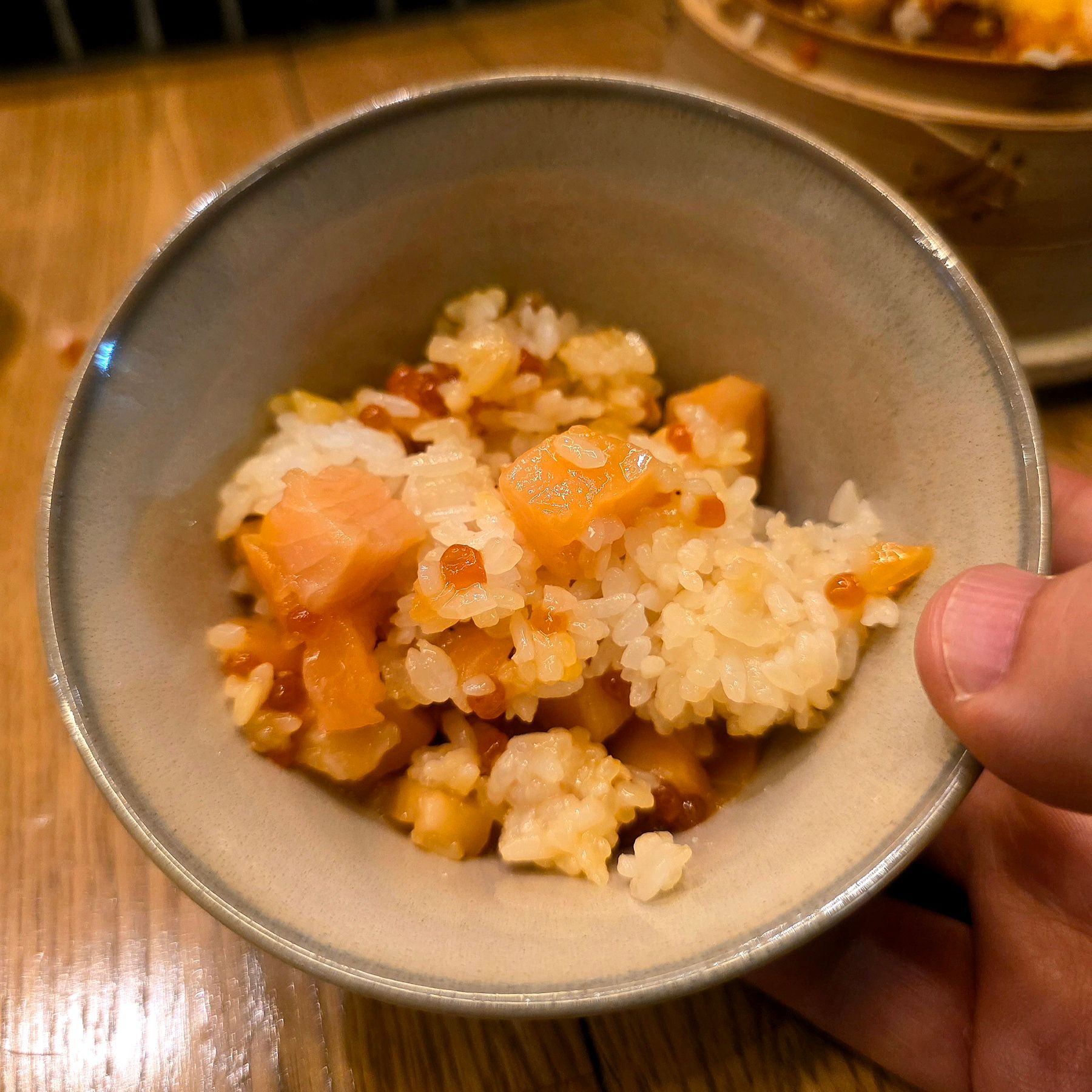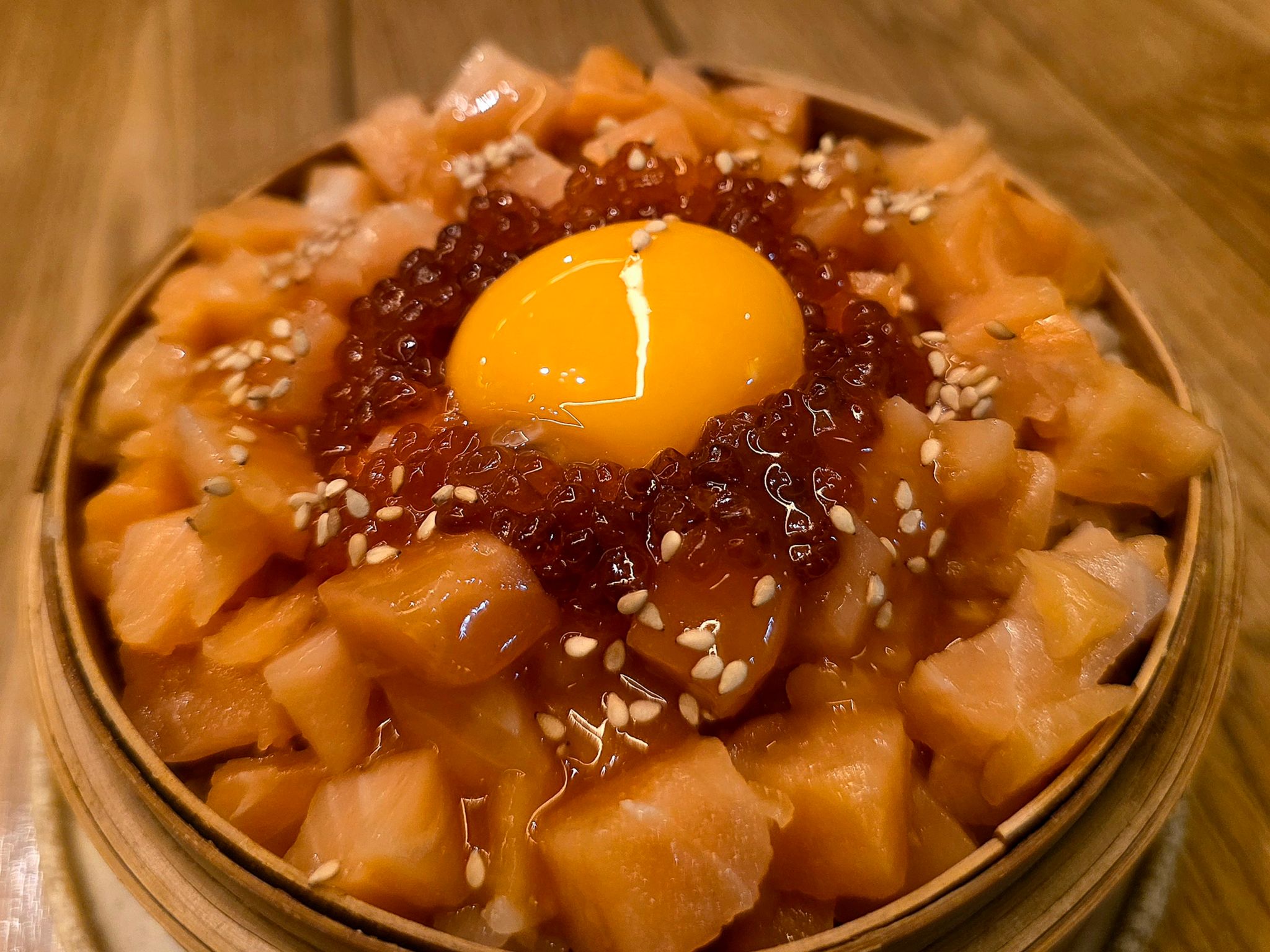 蒸されたご飯はふっくらしっとり、サーモンがご飯を覆い隠すほどたっぷり乗っていて、そこにいくらと卵黄が絡みます。