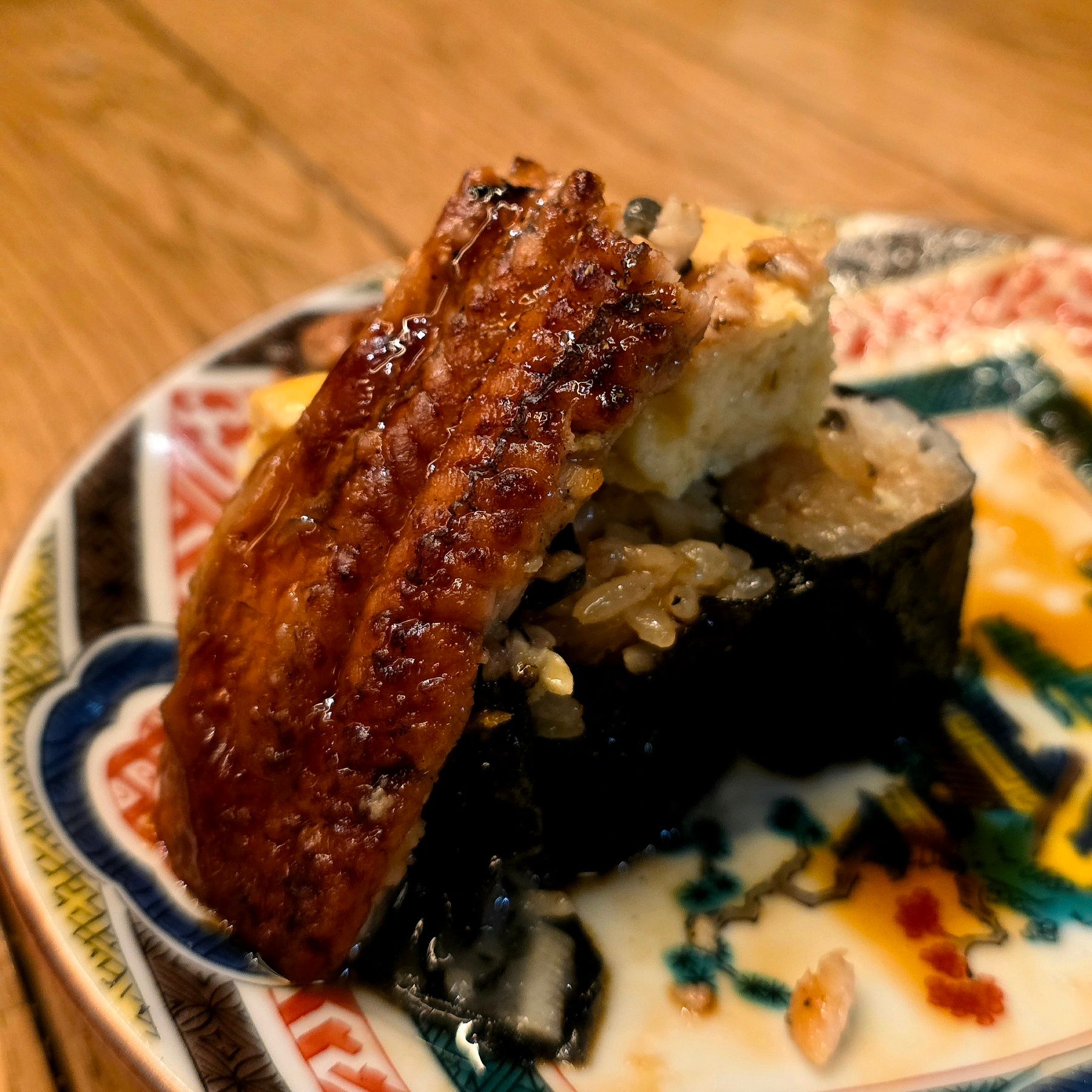 海苔巻きの上に出汁巻き玉子と鰻がドーンと乗っていて、ビジュアルもインパクト大。
