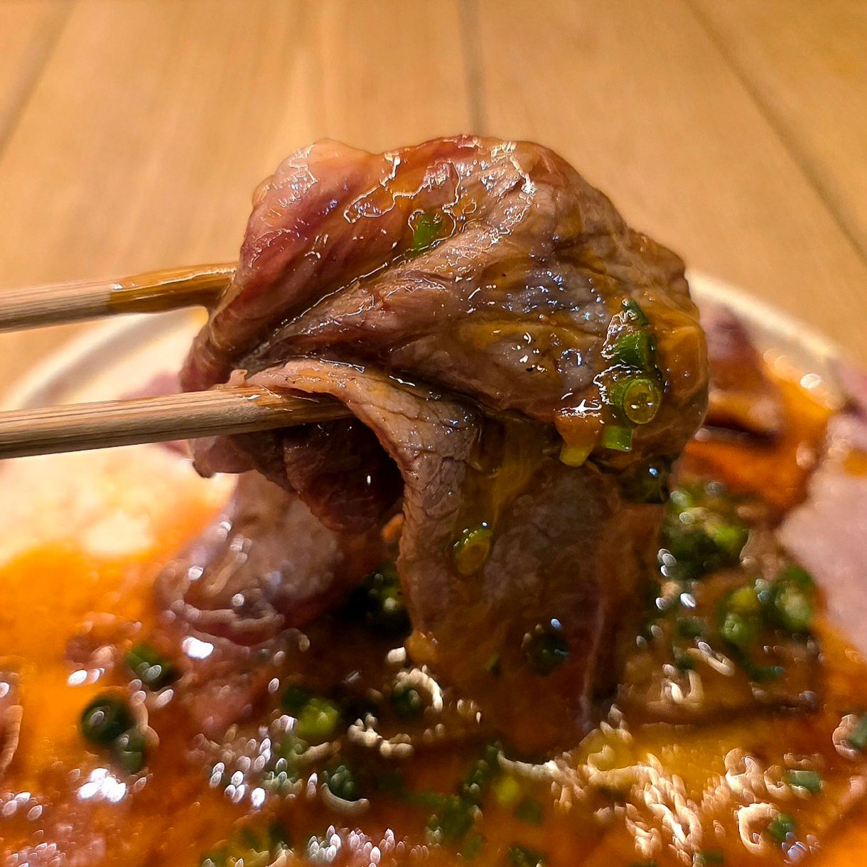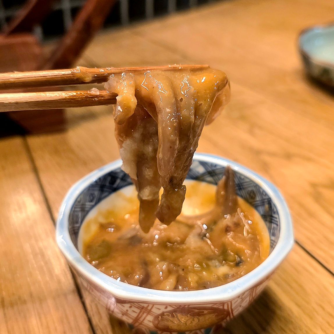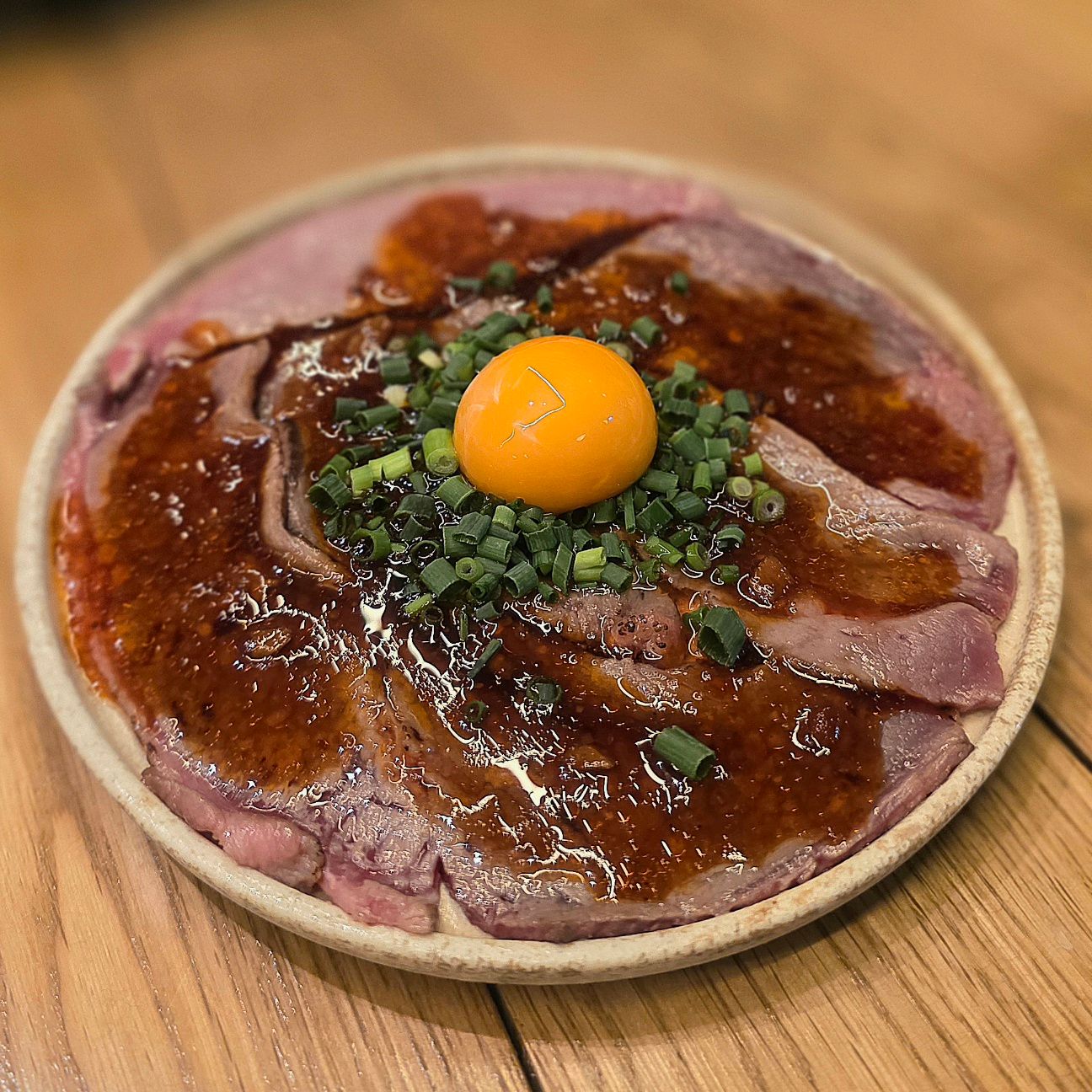 卵黄を崩して黄身をとろりとユッケに絡めると……和牛の旨みと卵のコクが一体となって濃厚。トロッとした食感で、思わず日本酒を合わせたくなる一品です。