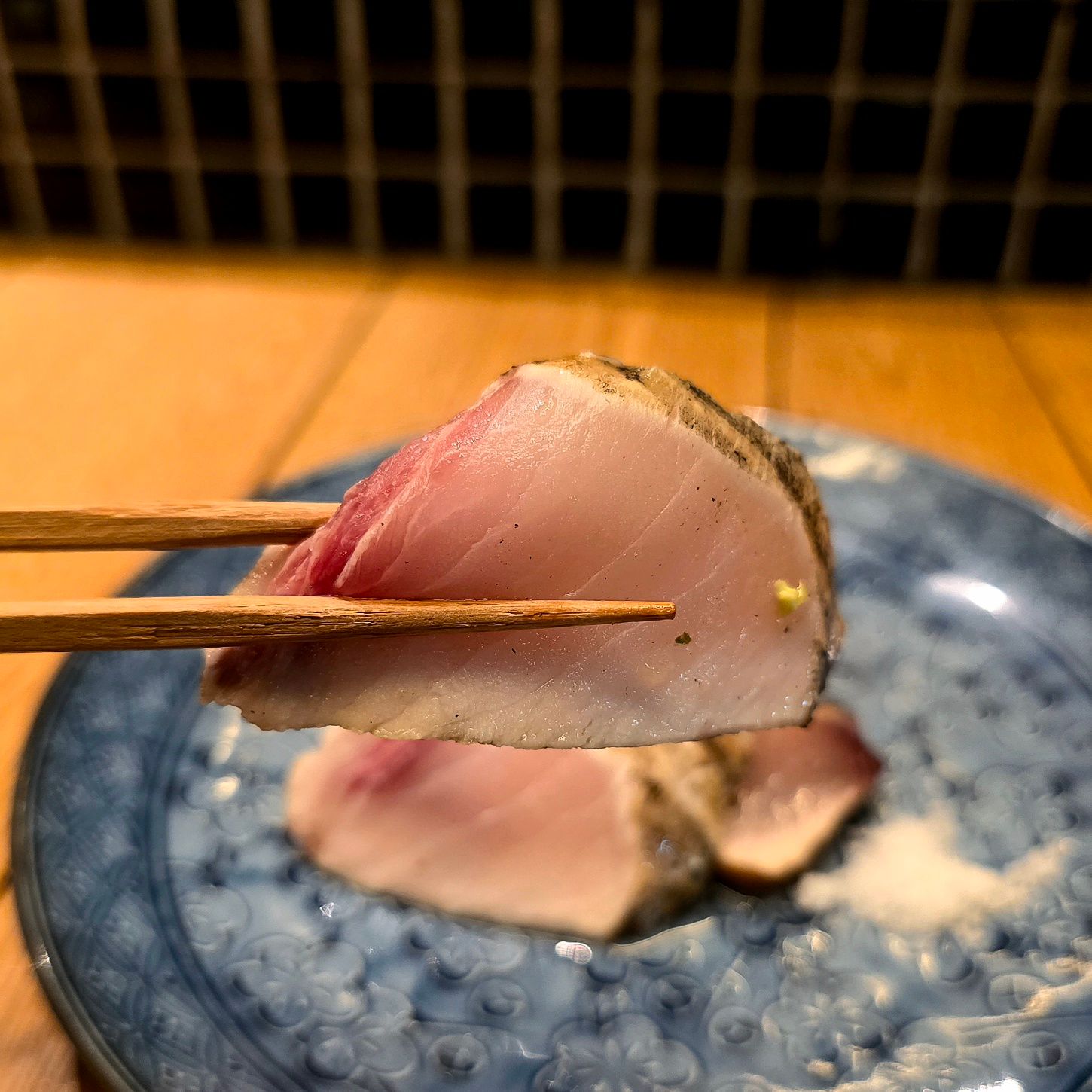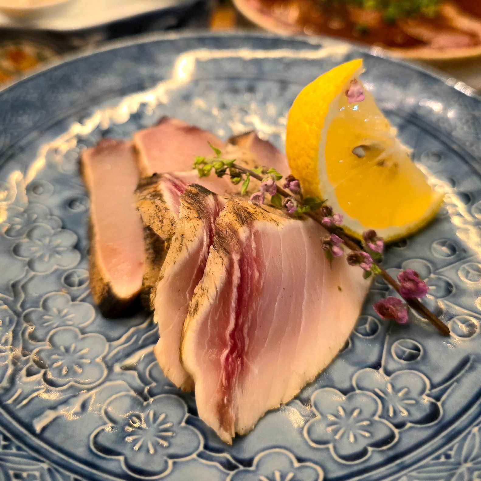 「メカジキの燻製藁焼き(1,078円)」は、藁の香ばしいスモークが香り立ち、魚の旨みがギュッと凝縮された感じです。