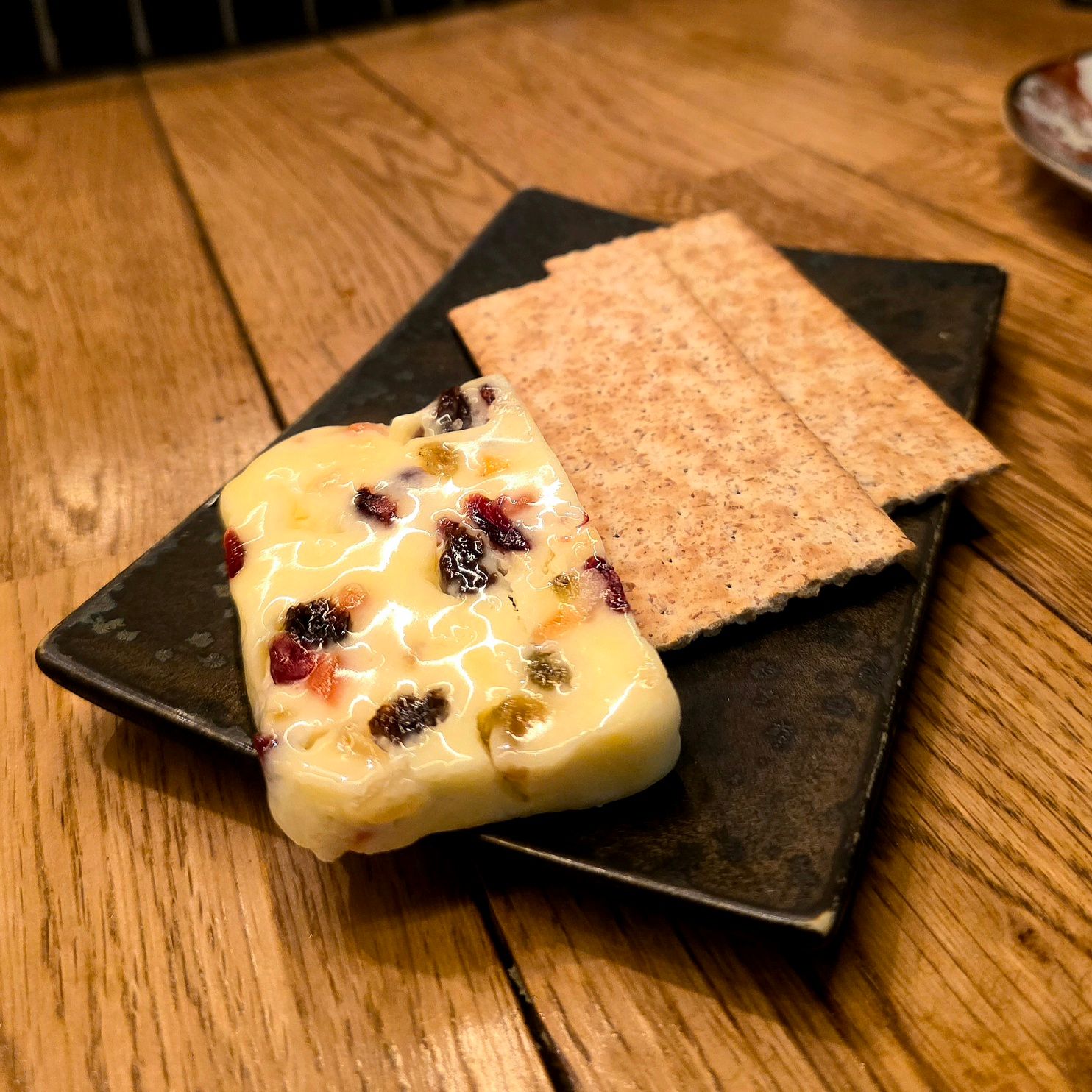 レーズンなどのドライフルーツと、濃厚なバターの塩気が合わさって、クラッカーに乗せたら立派なおつまみに。味の濃い料理の合間の「箸休め」ならぬ「酒休め」としてじんわり良かったです。