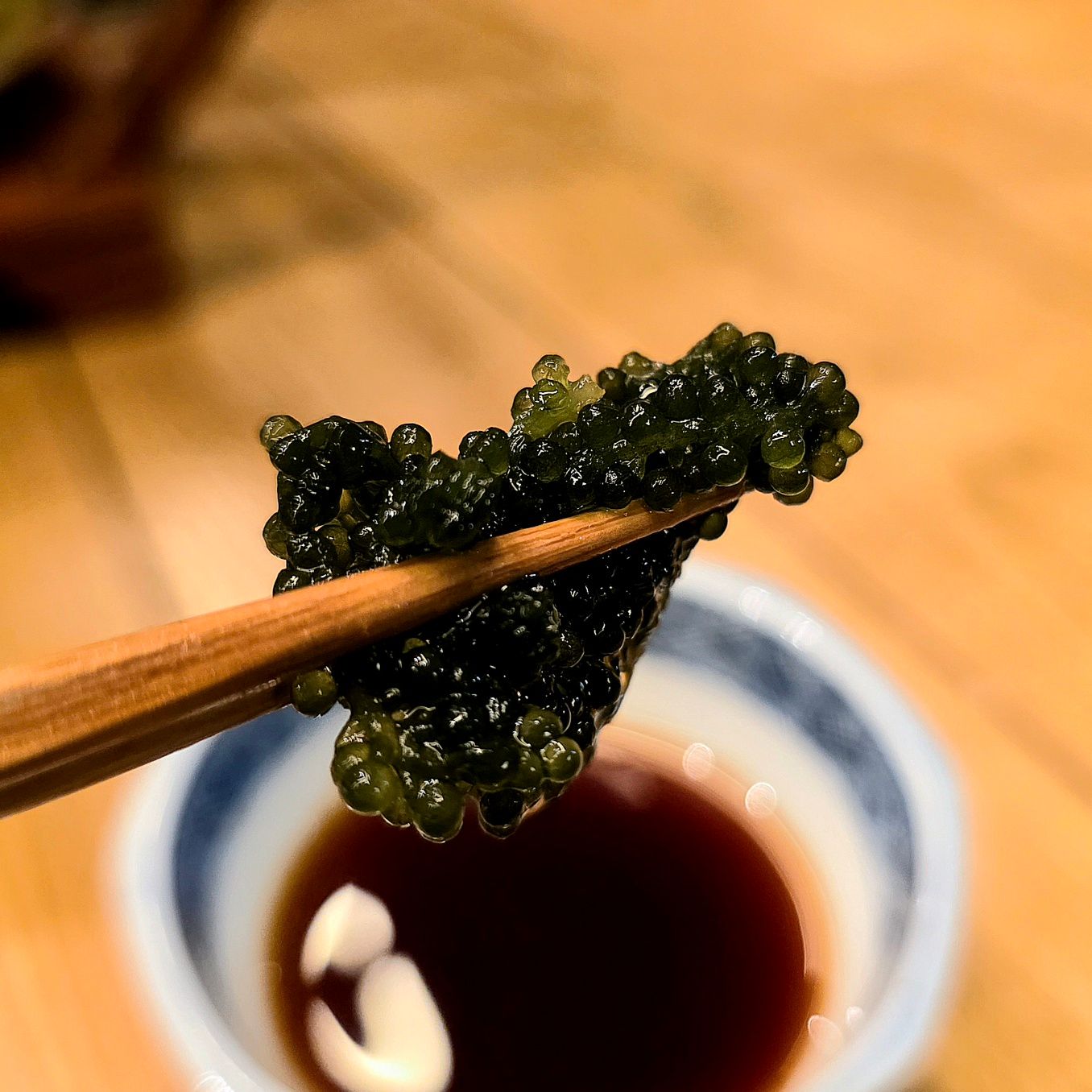 生シラスの沖漬け、イカと雲丹の酒盗、クリームチーズの醤油漬け、海ぶどう、蟹味噌なめろう――どれも日本酒に合いそうな、濃くしっかりしたおつまみばかり。