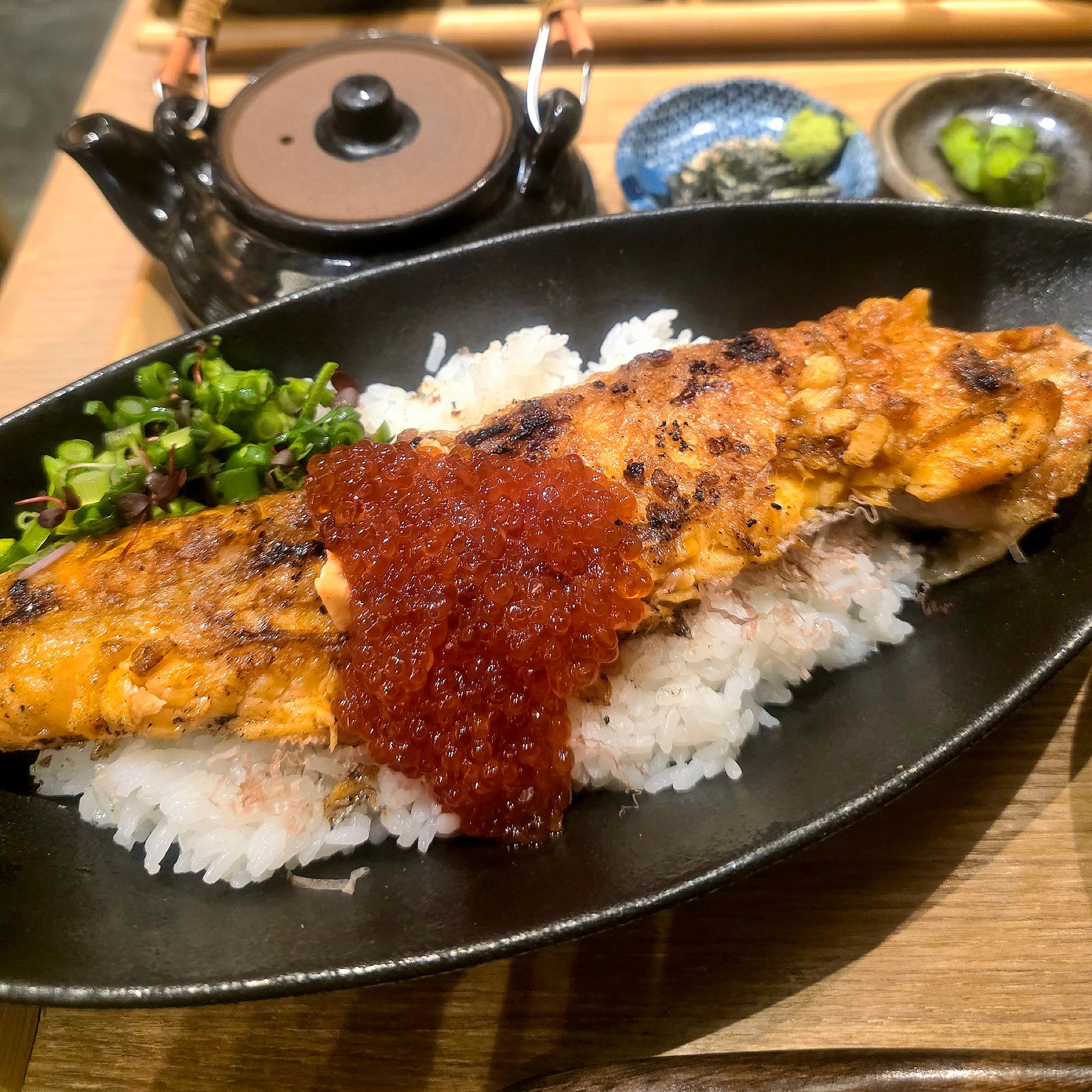 まずはそのまま一口。炭火で丁寧に焼かれた鮭ハラスは、皮はパリッと、身はふっくら。脂がじゅわっと広がりながらも、しつこさを感じさせない絶妙な火入れ具合です。