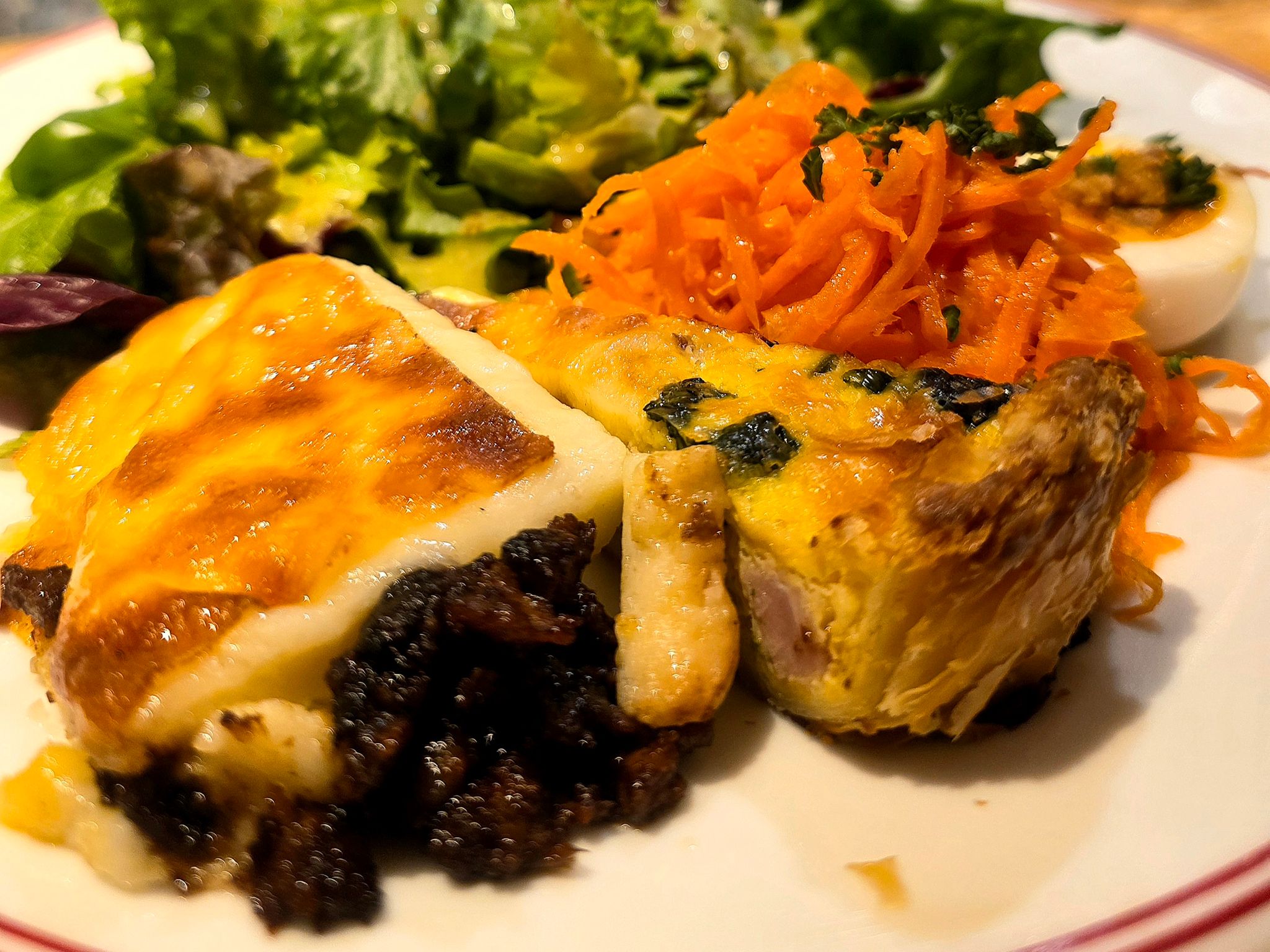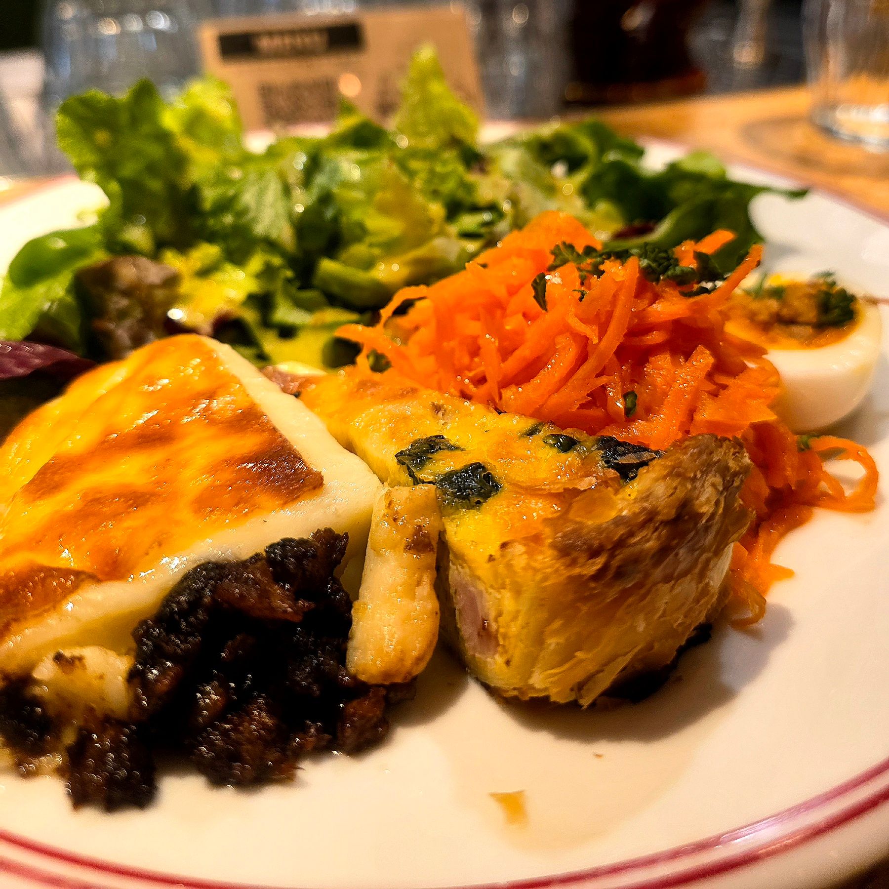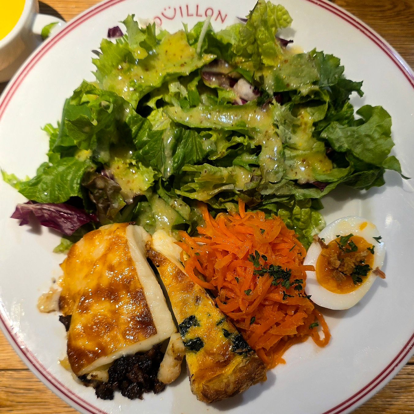 ワンプレートにはグラタン、キッシュ、ウフマヨ、キャロットラペ、そしてシャキッとフレッシュなサラダが彩り良く並んでいます。日替わりスープもセットです。今日のスープは人参のポタージュ。