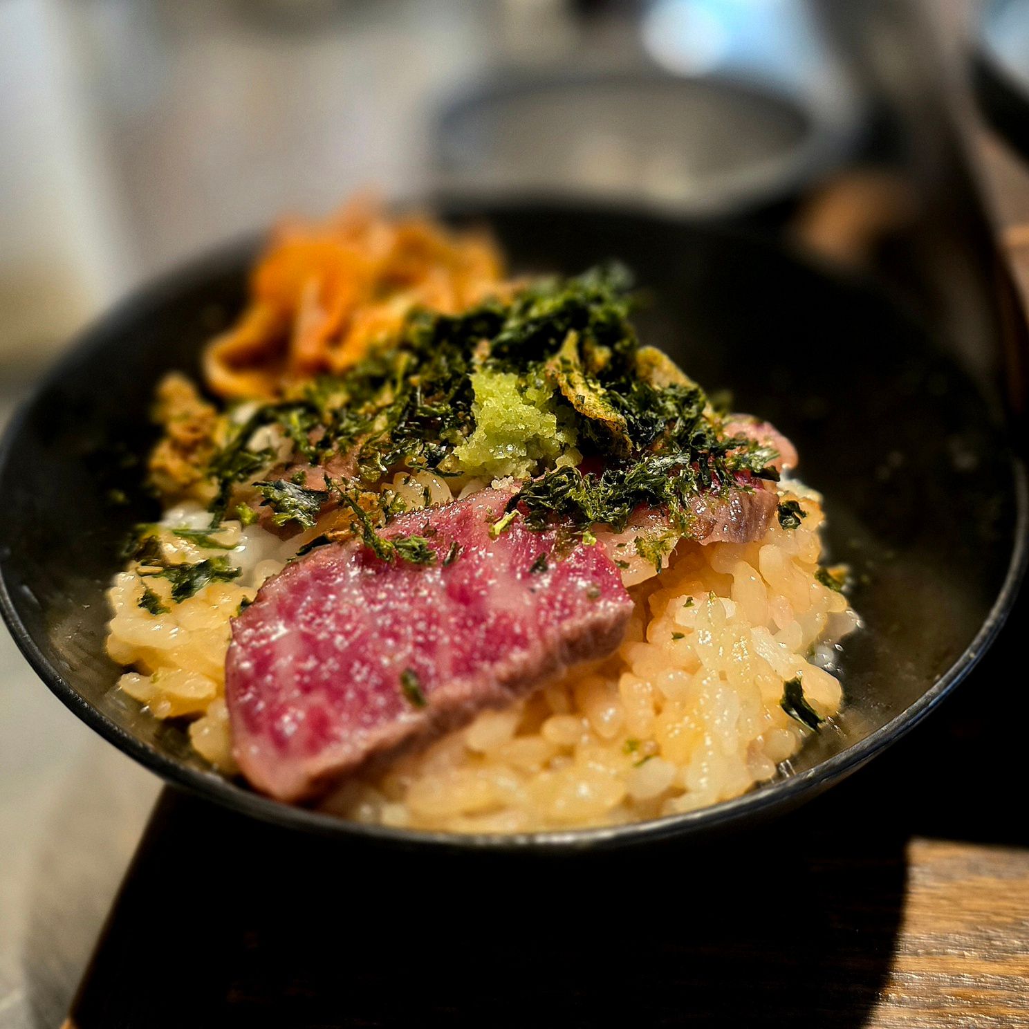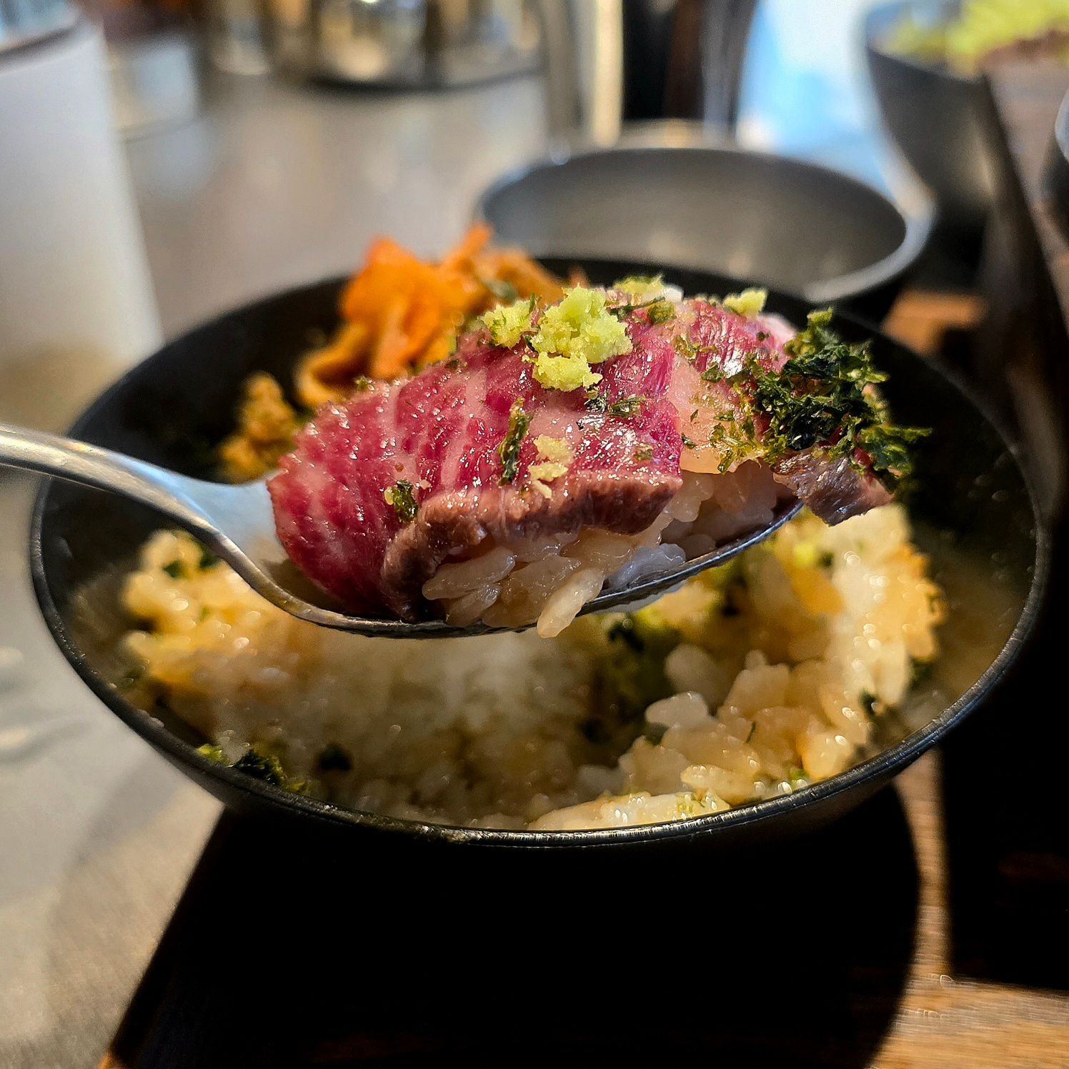 これが…最強!牛骨の深いうまみ、ご飯とお肉の一体感、キムチやふりかけのアクセント、わさびの軽い刺激。ひとくちごとに「これが締めか…!」と思わせる満足感。