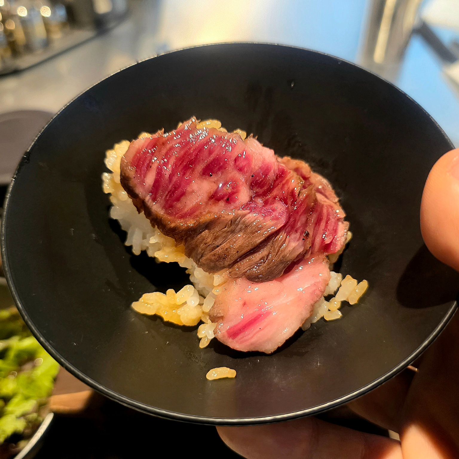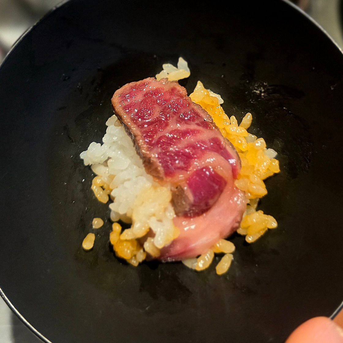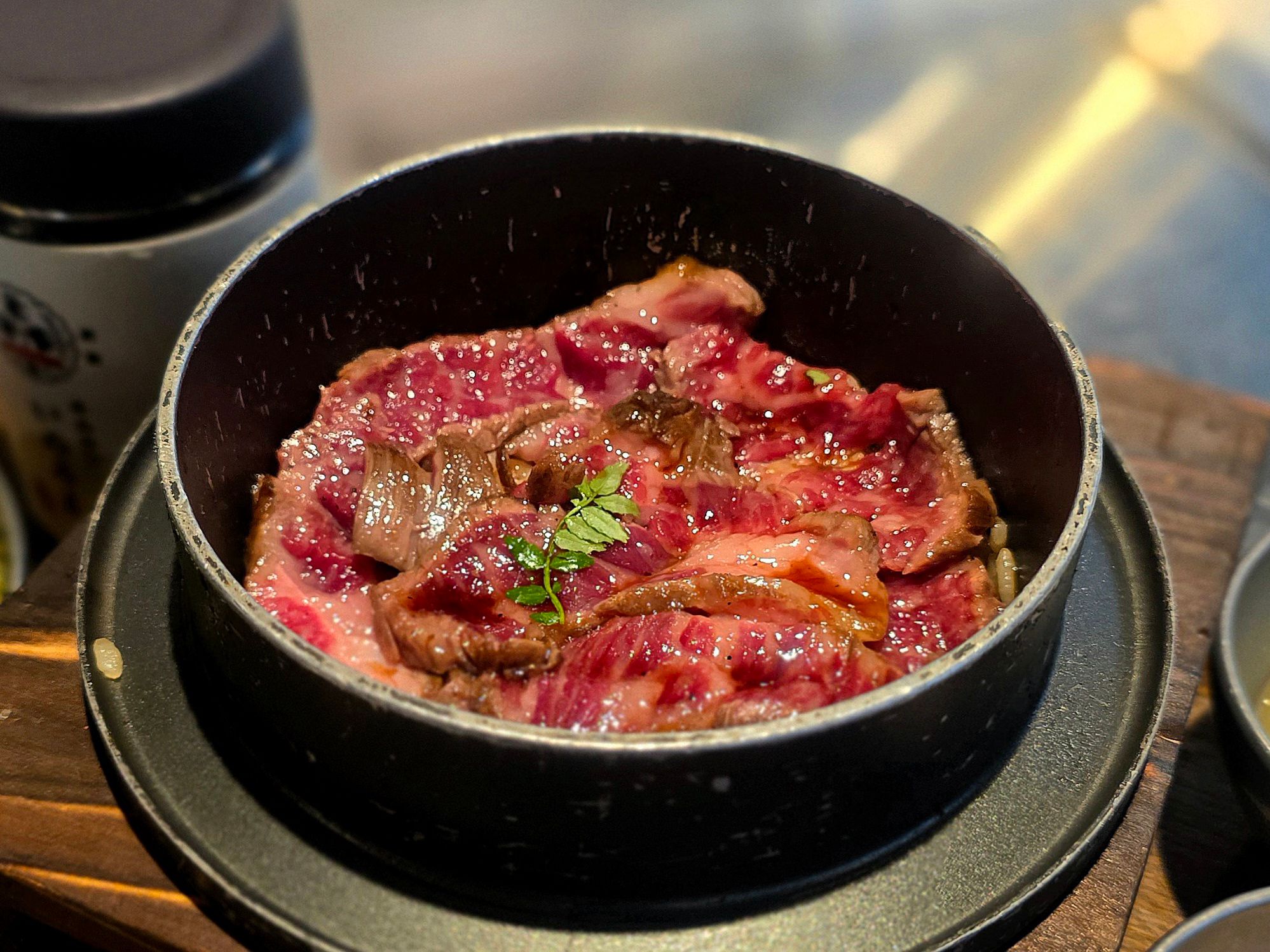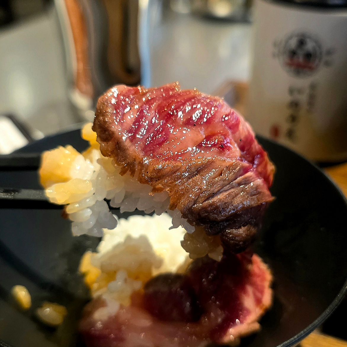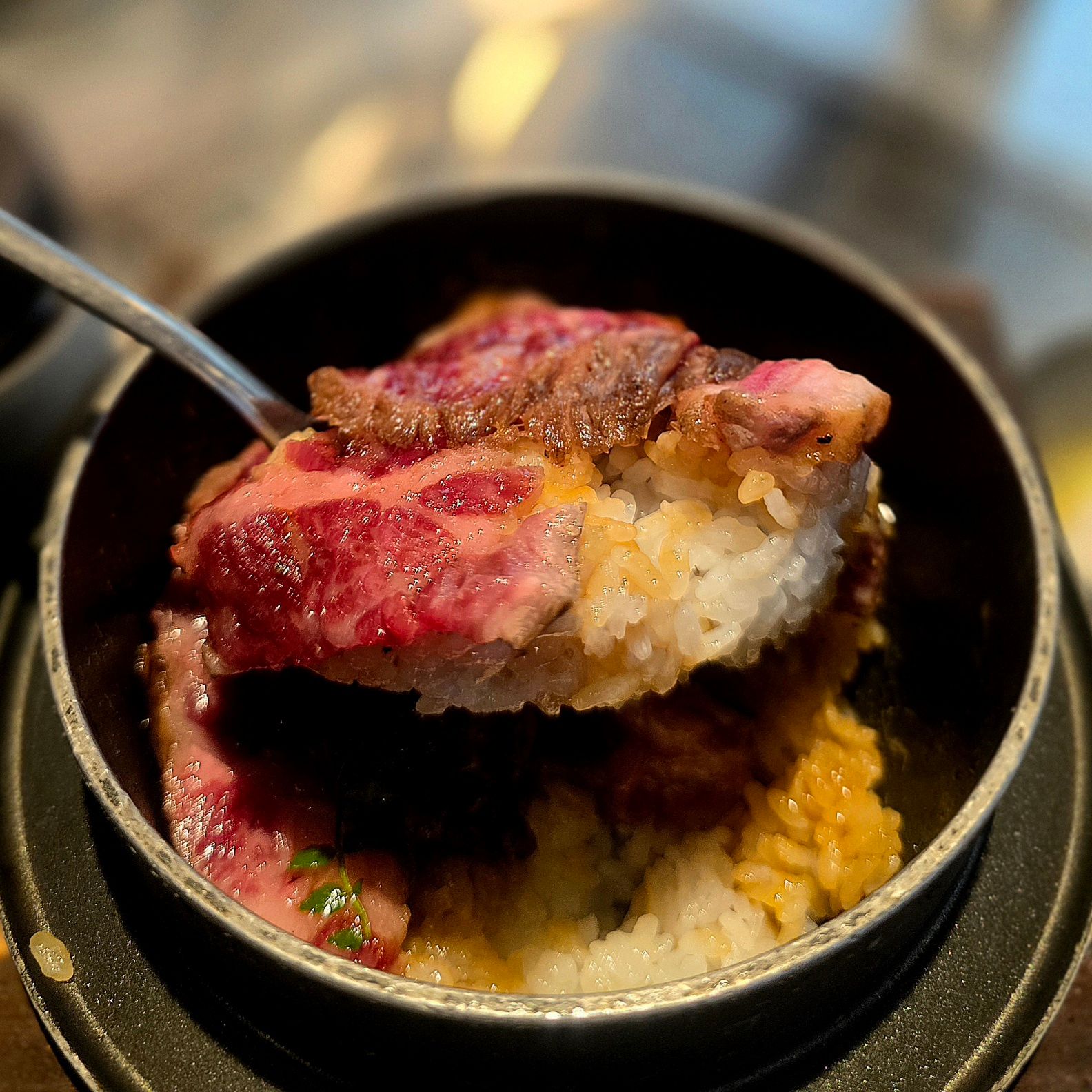 まず運ばれてきたときの第一印象は、羽釜で炊いたお米の上に、鮮やかな赤身肉の和牛がたっぷり。フォトジェニックで、思わず写真を撮りたくなるビジュアル。