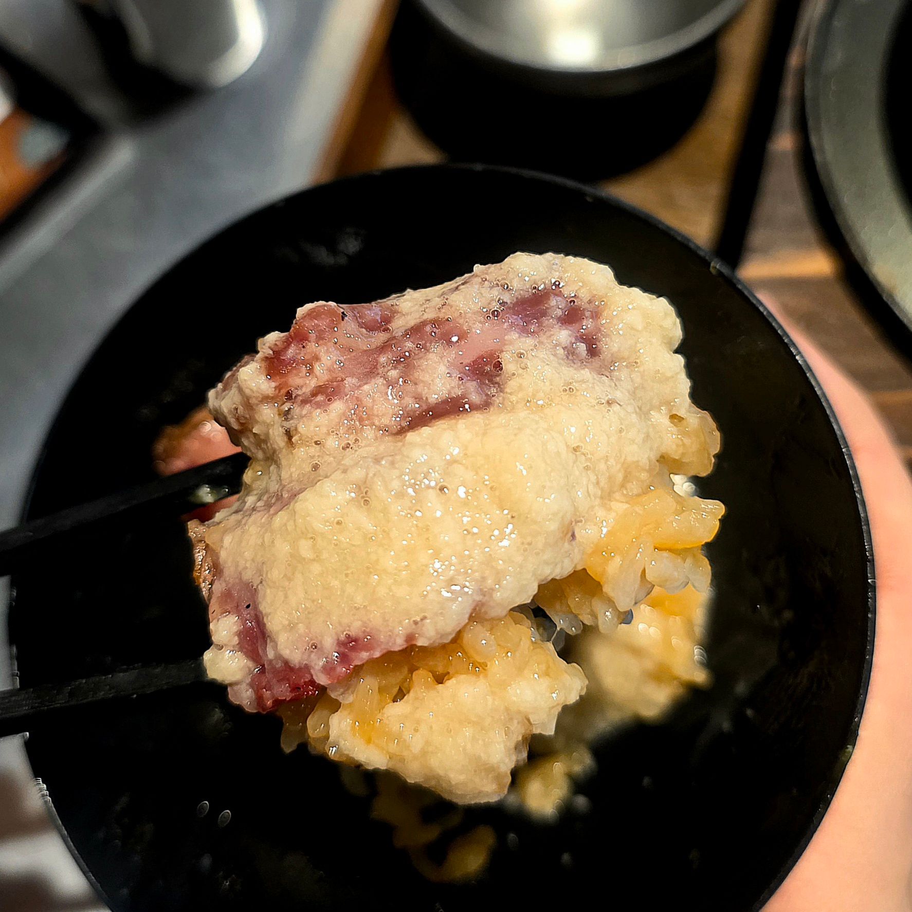 さらにとろろをかけてみると、トロッとした粘り気とお肉の旨みが相性抜群。とろろのねっとり感が、ご飯とお肉を包み込み、これはまさに「ご飯泥棒」。濃いタレがとろろで中和され、まるで別物の一膳になった感じです。