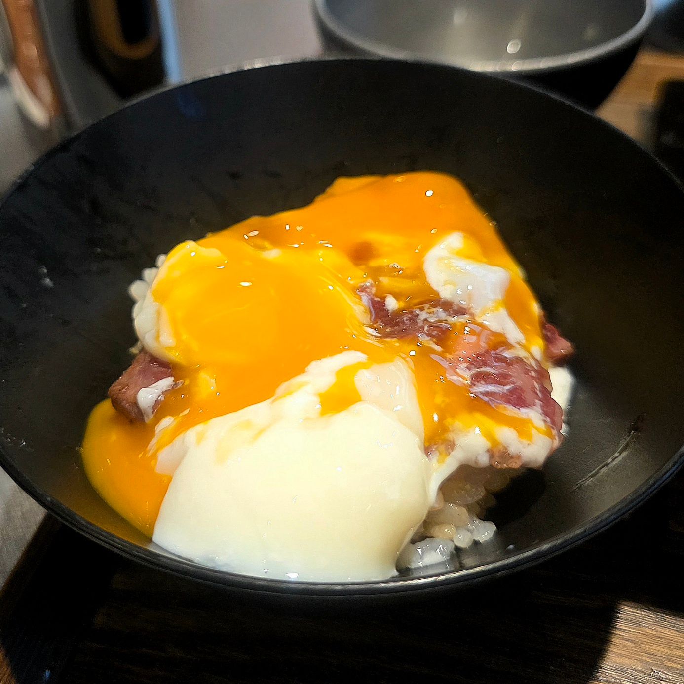 次に温泉卵を乗せてみると、まろやかさが加わってまた別の深み。卵の黄身が肉とご飯と絡み合って、何もかもがまろやかで、思わず「おかわり…!」と言いたくなるほど。