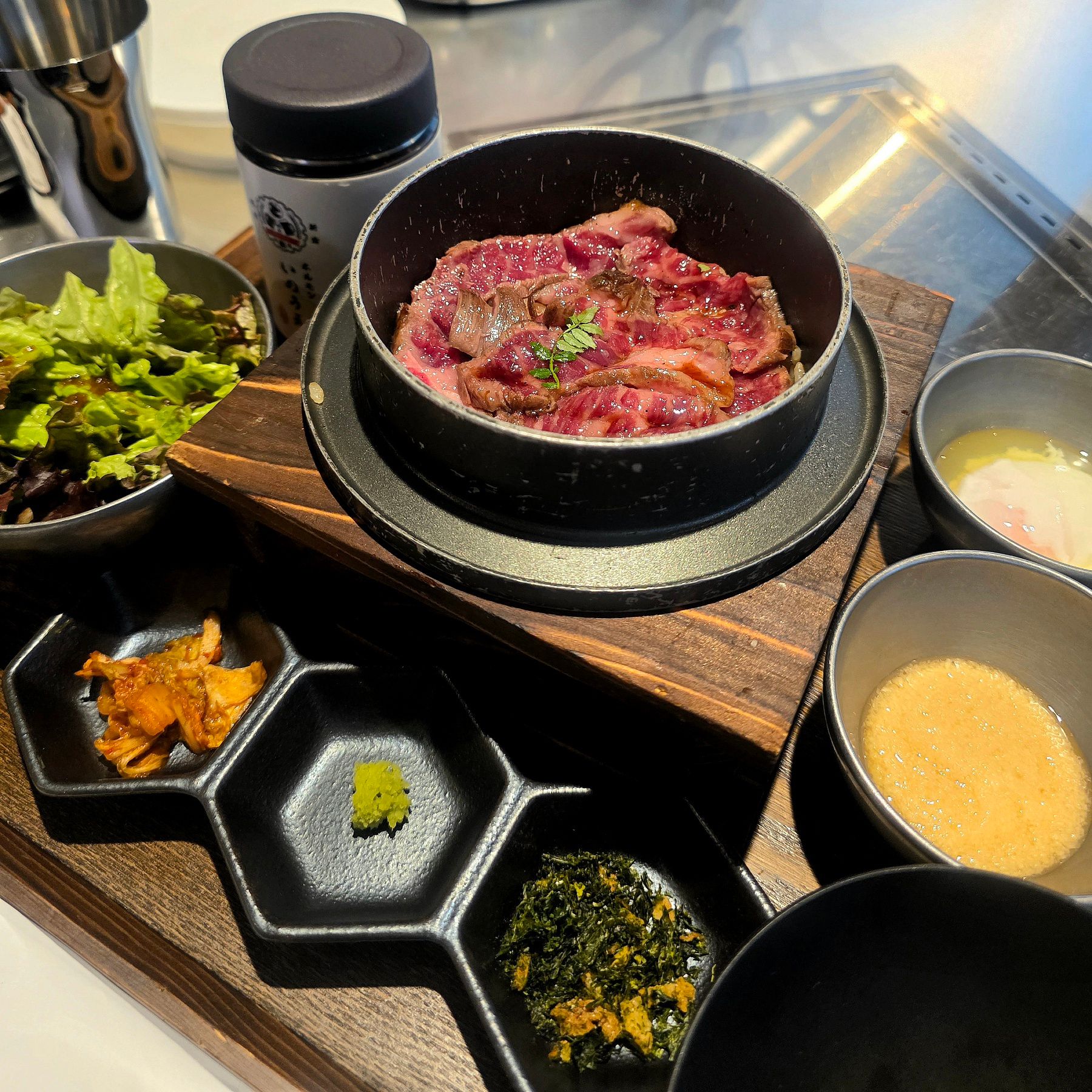 サラダに、温泉卵、とろろ、キムチ、わさび、テールスープ、ふりかけがセットされていて、「味変前提」の演出にもワクワクします。