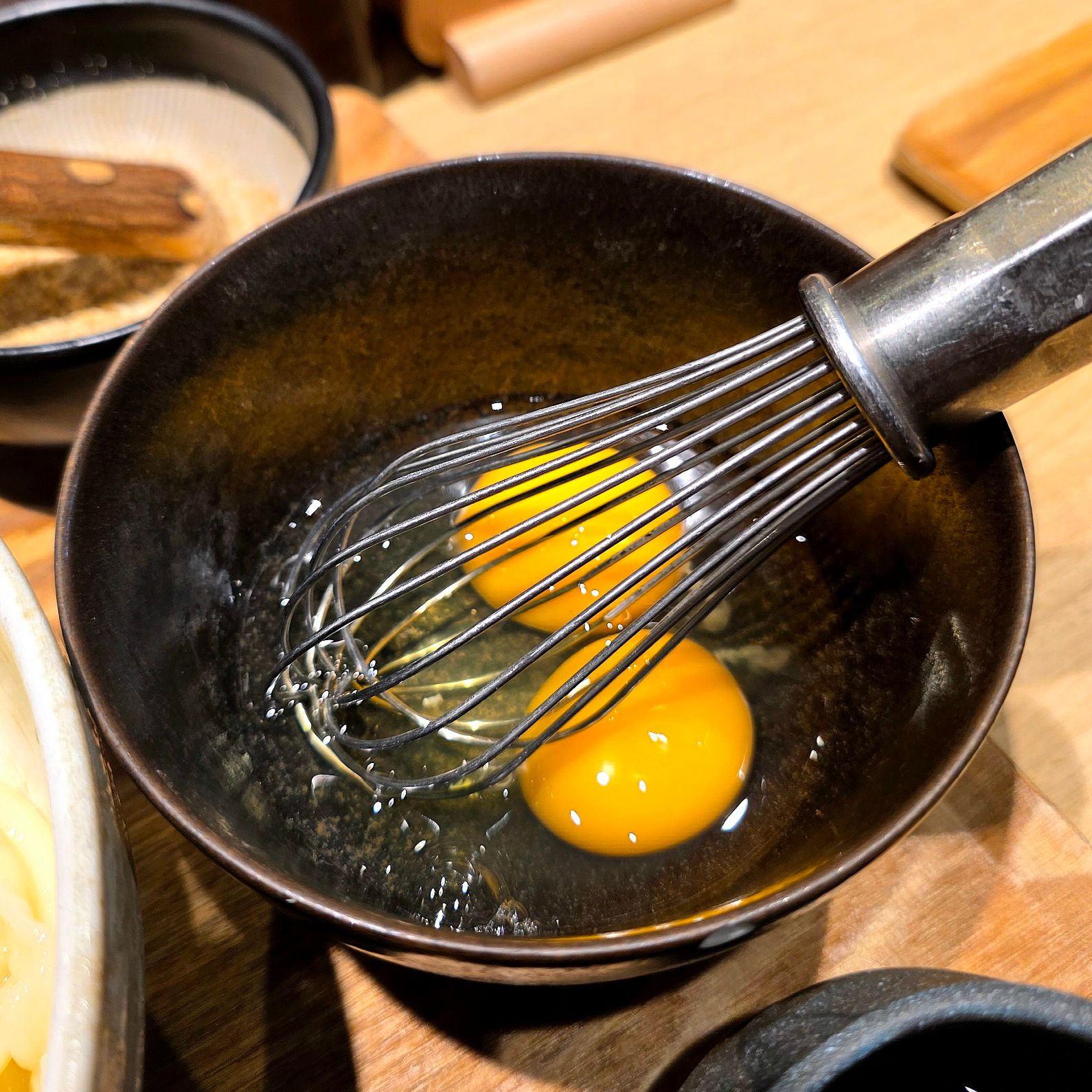 卵をかき混ぜて、出汁つゆと一緒にうどんに投入。