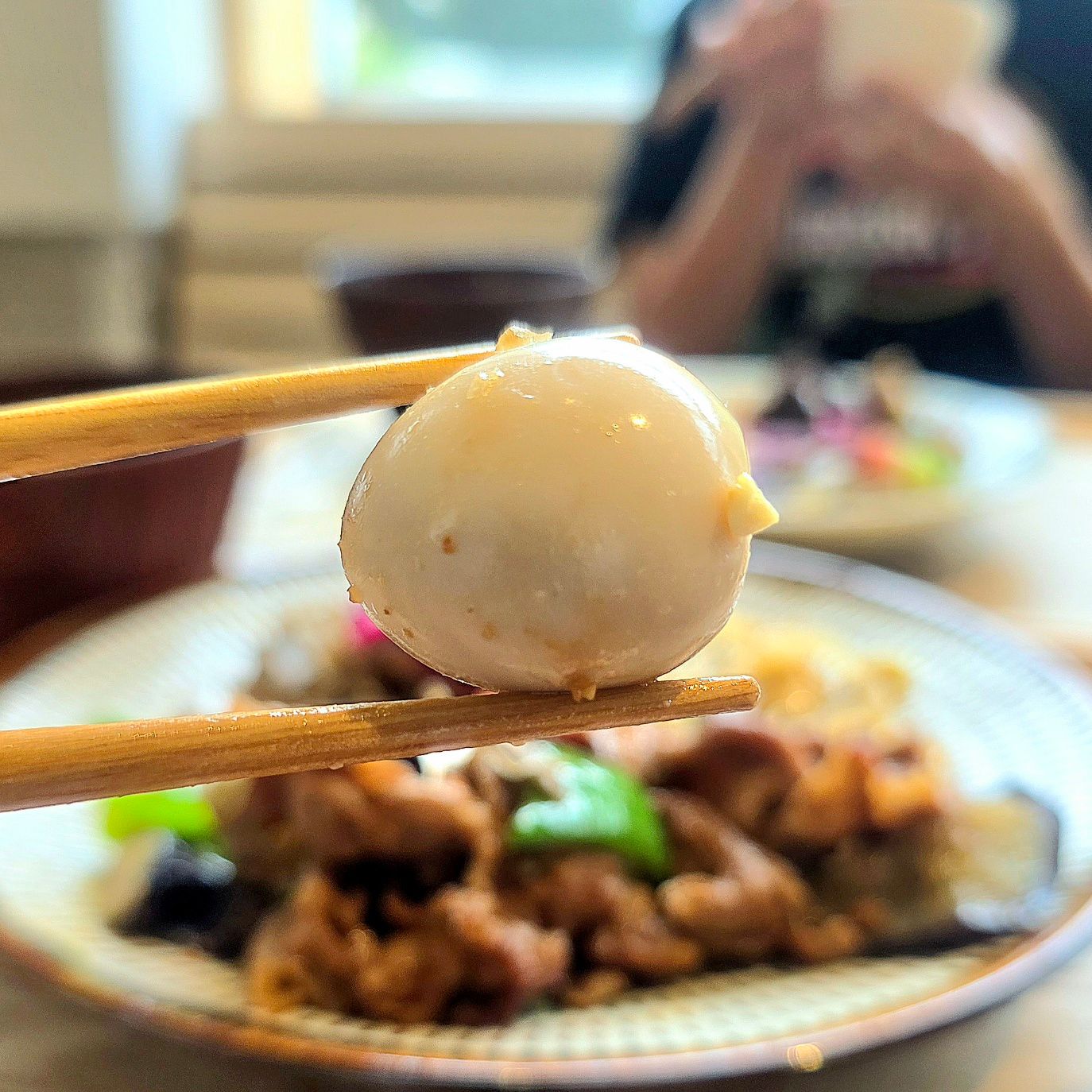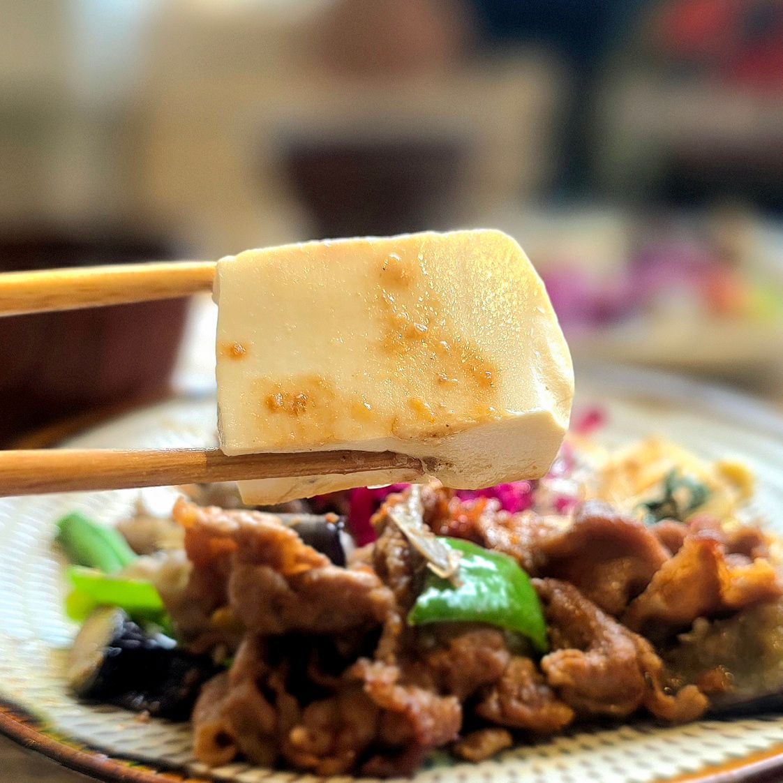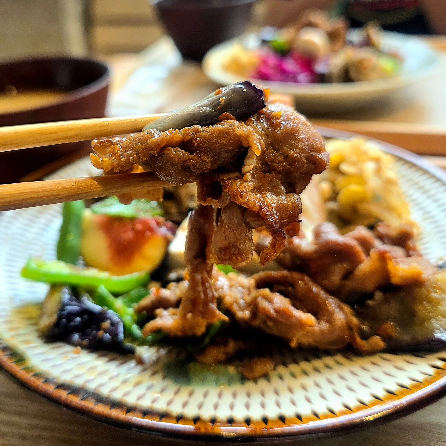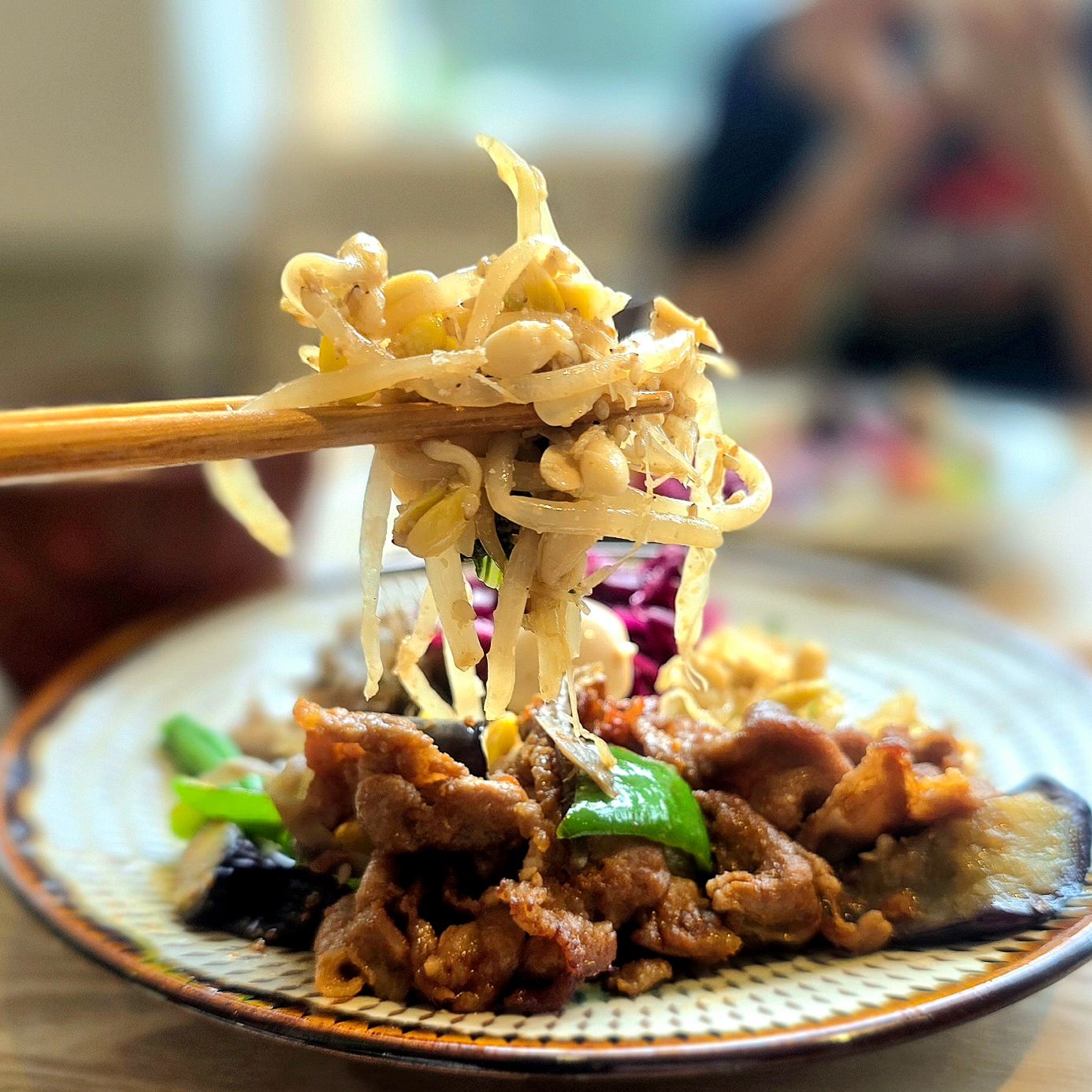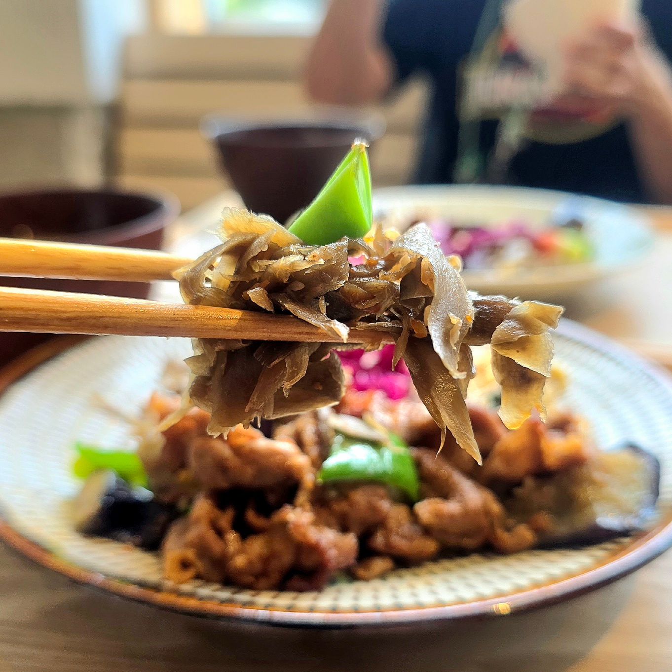 今日の日替わり定食は「茄子とピーマンの回鍋肉」。運ばれてきたとき、まずその見た目に驚きました。想像していた“普通の定食“の枠を超えて、野菜がたっぷり、彩りが美しく、盛り付けが丁寧。