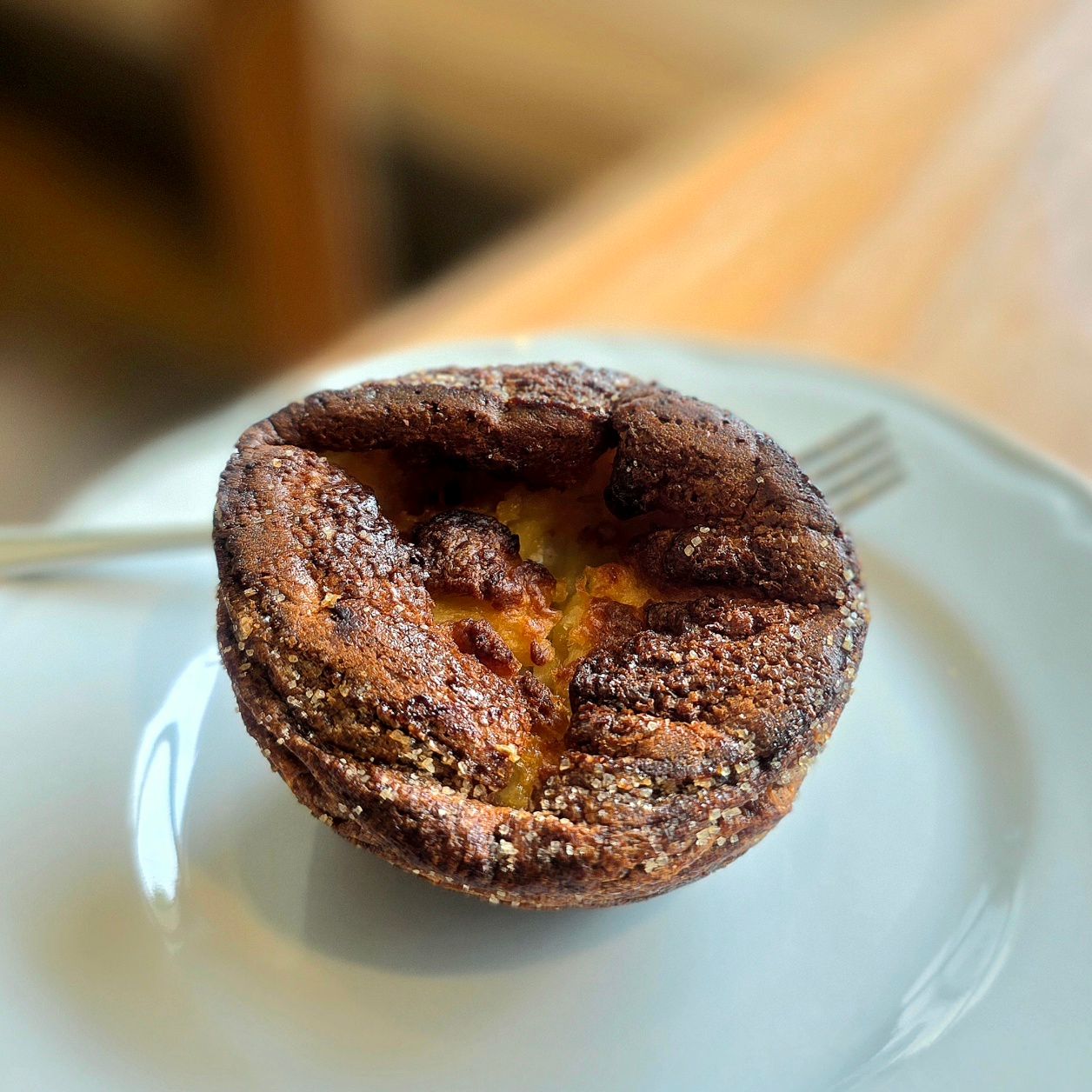 スイーツコーナーを見ていたら、どうしても気になってしまった「ファーブルトン(482円)」を追加注文。丸い形の焼き菓子で、表面はこんがりと香ばしく、フォークを入れると中はぷるんとした弾力。食感はプリンとカヌレの中間のような、なんとも言えない心地よさです。