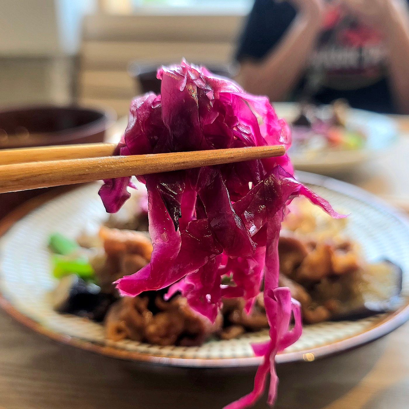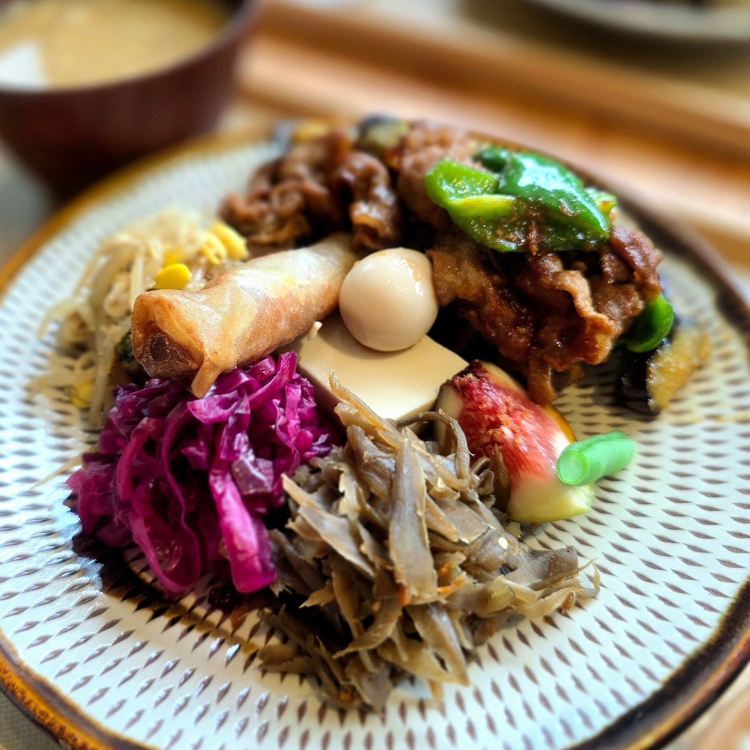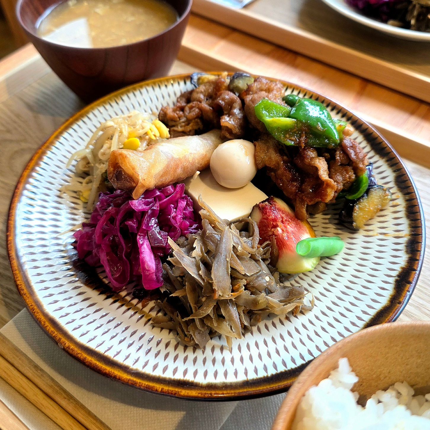 紫キャベツの酢漬けの酸味がいい具合に全体を引き締め、きんぴらの甘みとか豆腐のまったり具合とか…最後まで飽きずに楽しめました。栄養バランスも非常に優れているなという印象です。