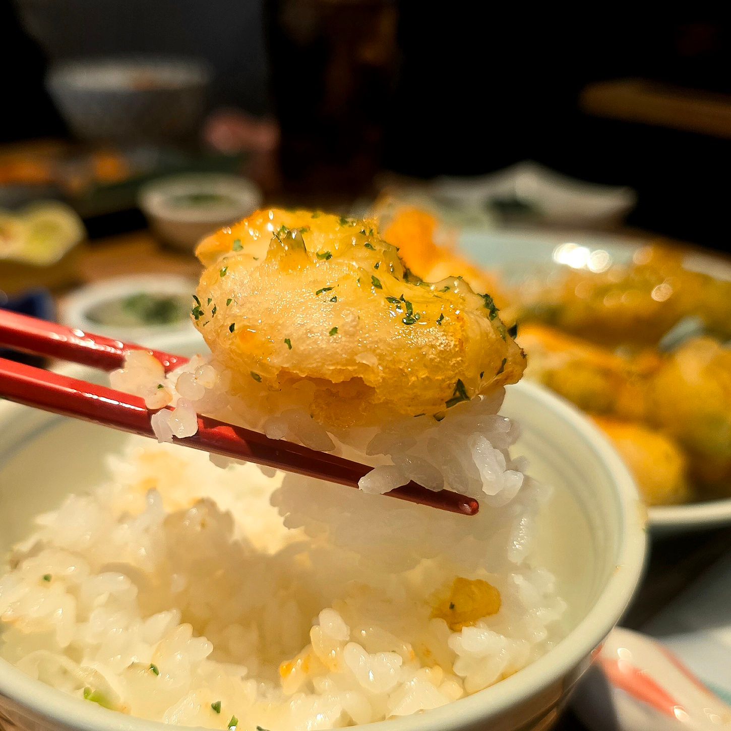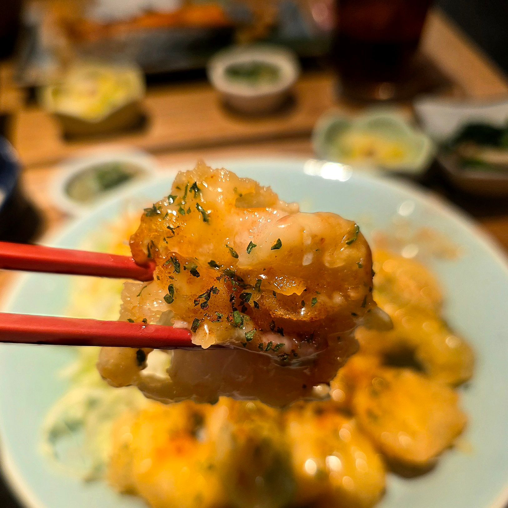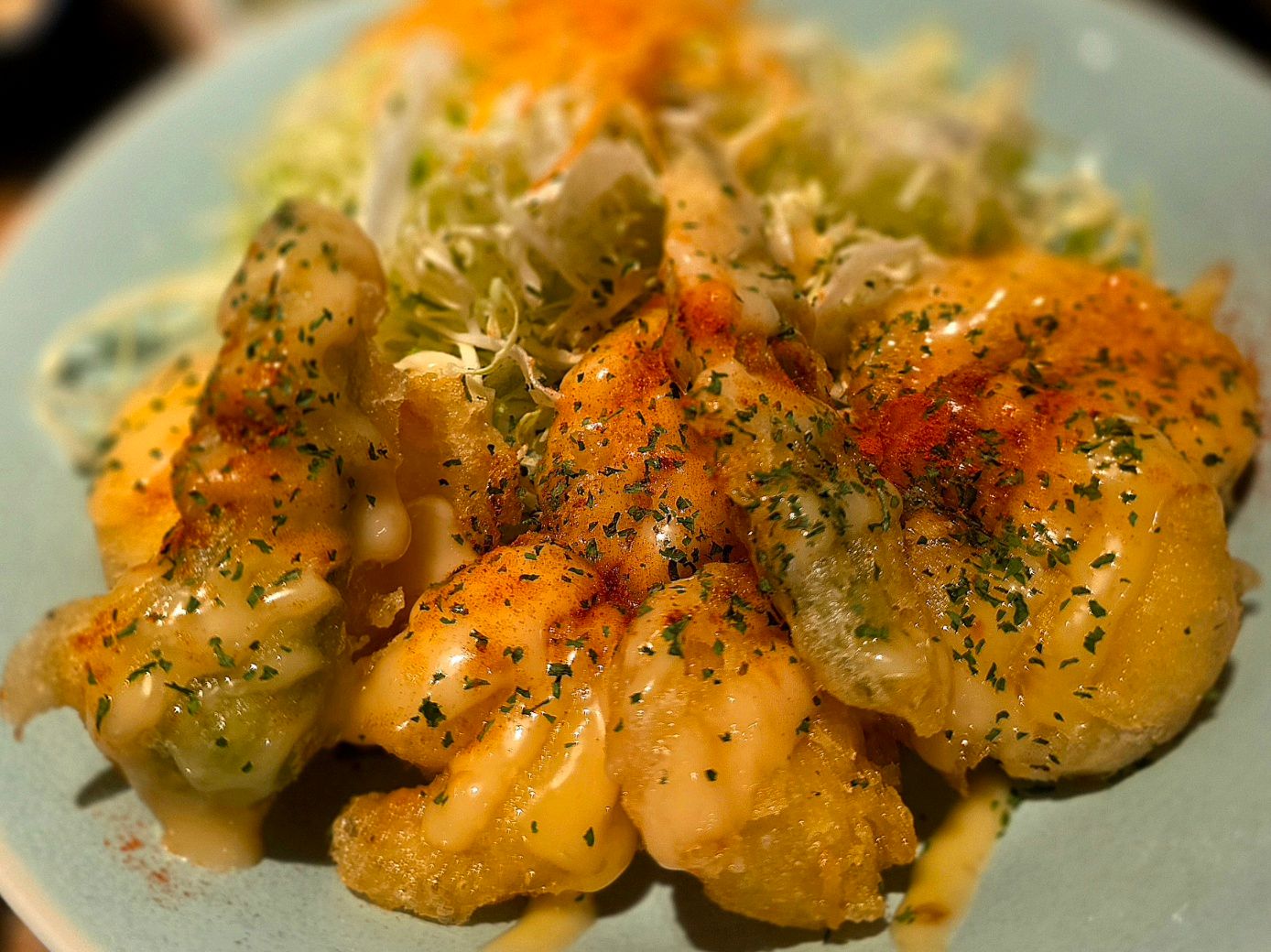 大エビが7尾にオクラが2本。衣はサクッと軽く、中の海老はぷりっぷり。揚げたての香ばしさに、クリーミーでほんのり甘酸っぱい特製マヨソースが絡み、食欲を容赦なく刺激してきます。