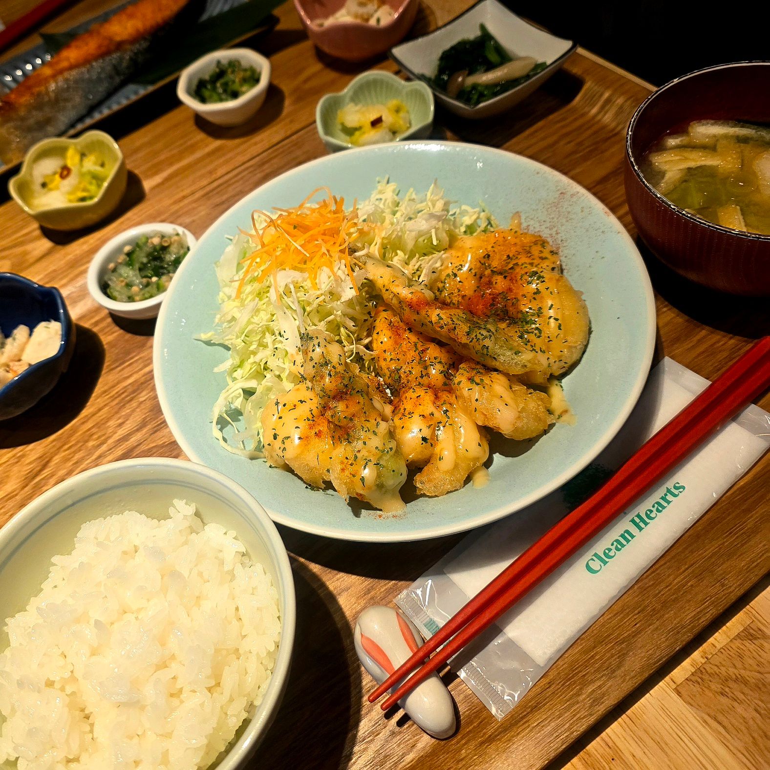 注文したのは「エビマヨ定食(1,500円)」。メインのエビマヨに加えて、小鉢が4つ、さらに具沢山のお味噌汁まで付く充実の内容で、配膳された瞬間から期待値が一気に上がります。