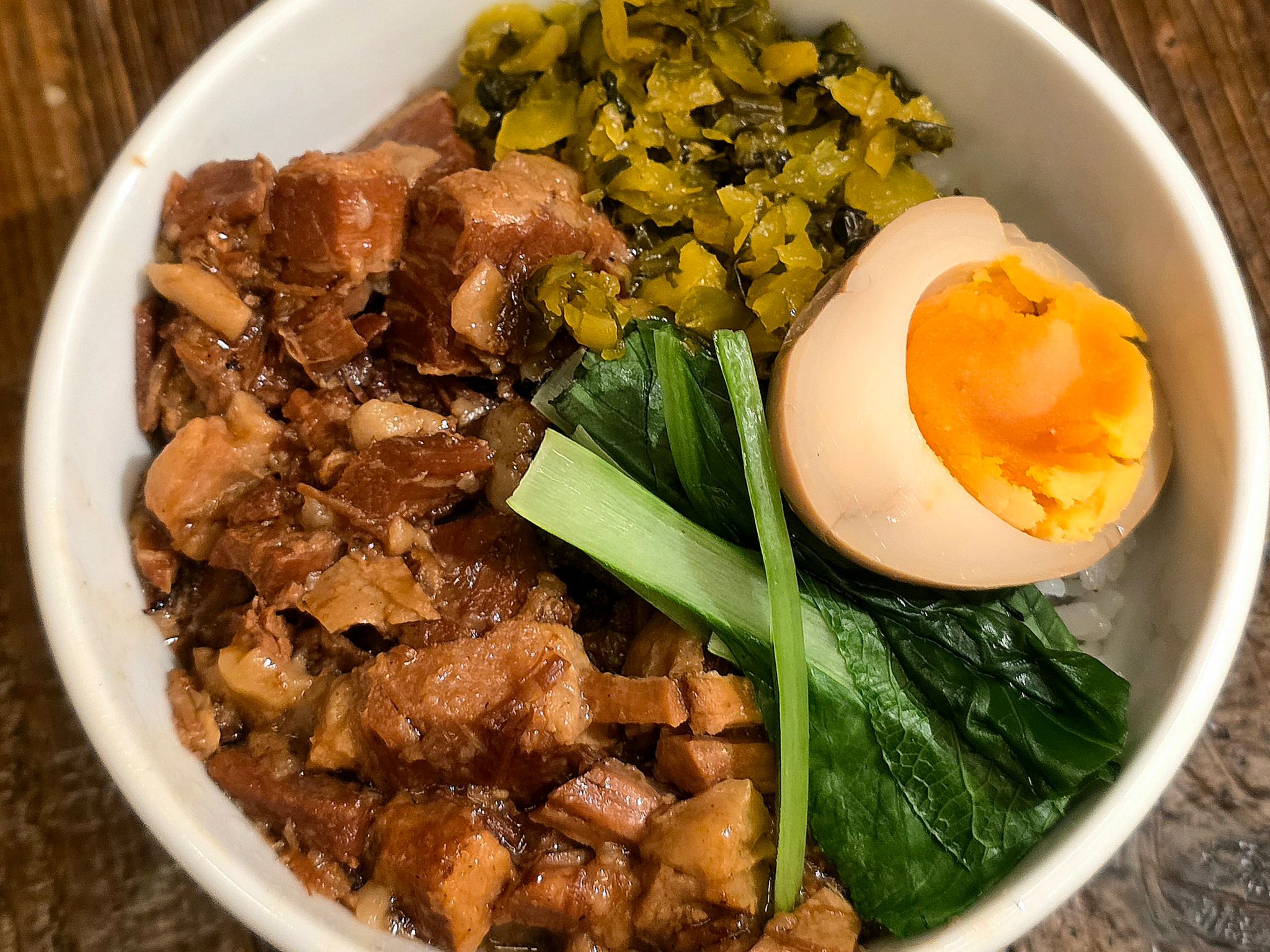 煮込まれた豚肉とご飯、タレが絡みつき、八角の香りが控えめに残る台湾らしい味わい。