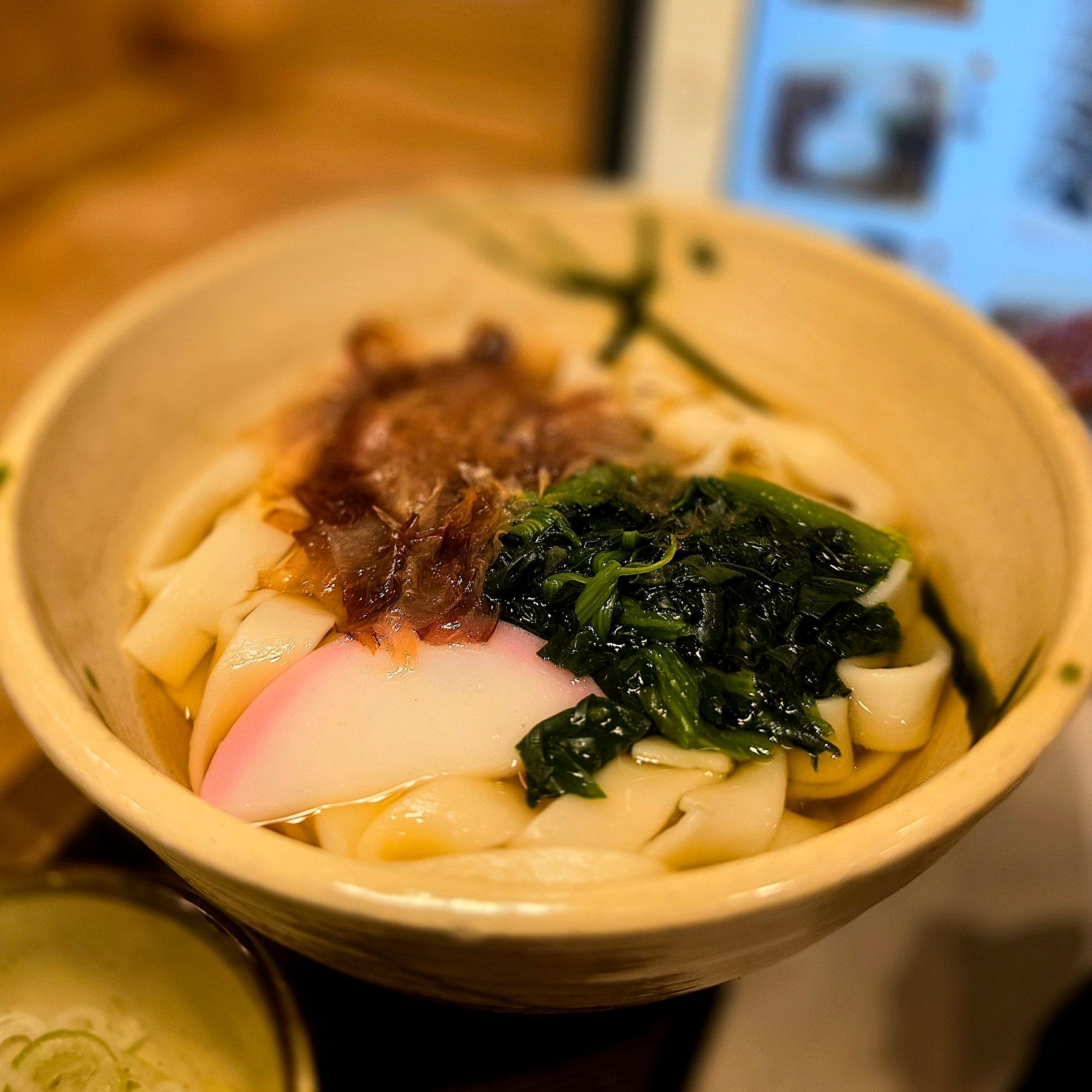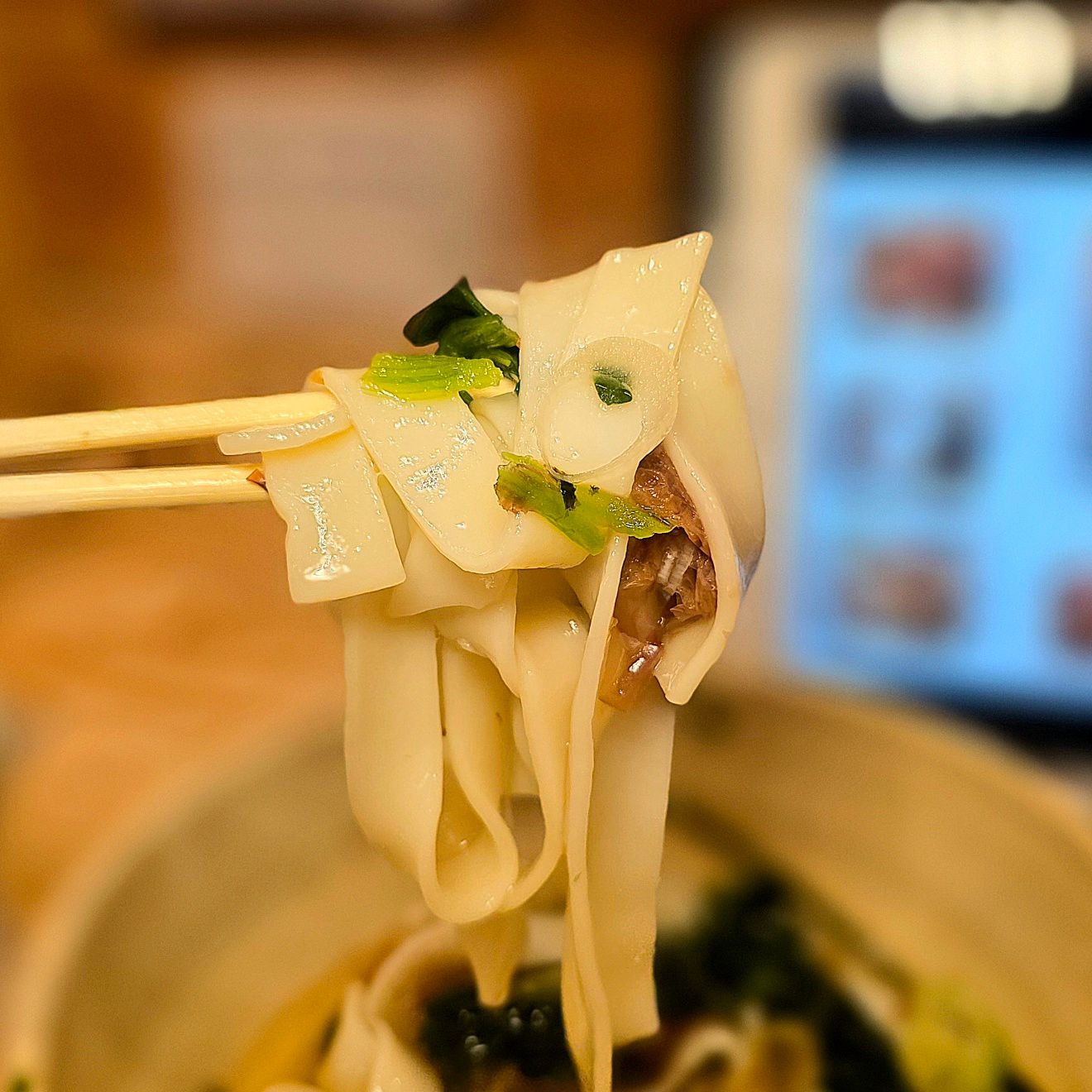 平打ちの麺がふるふるとスープの中に優しく漂い、出汁はとてもあっさり。
