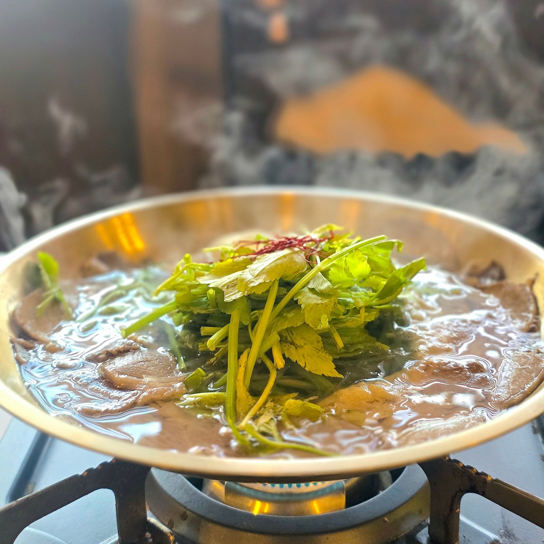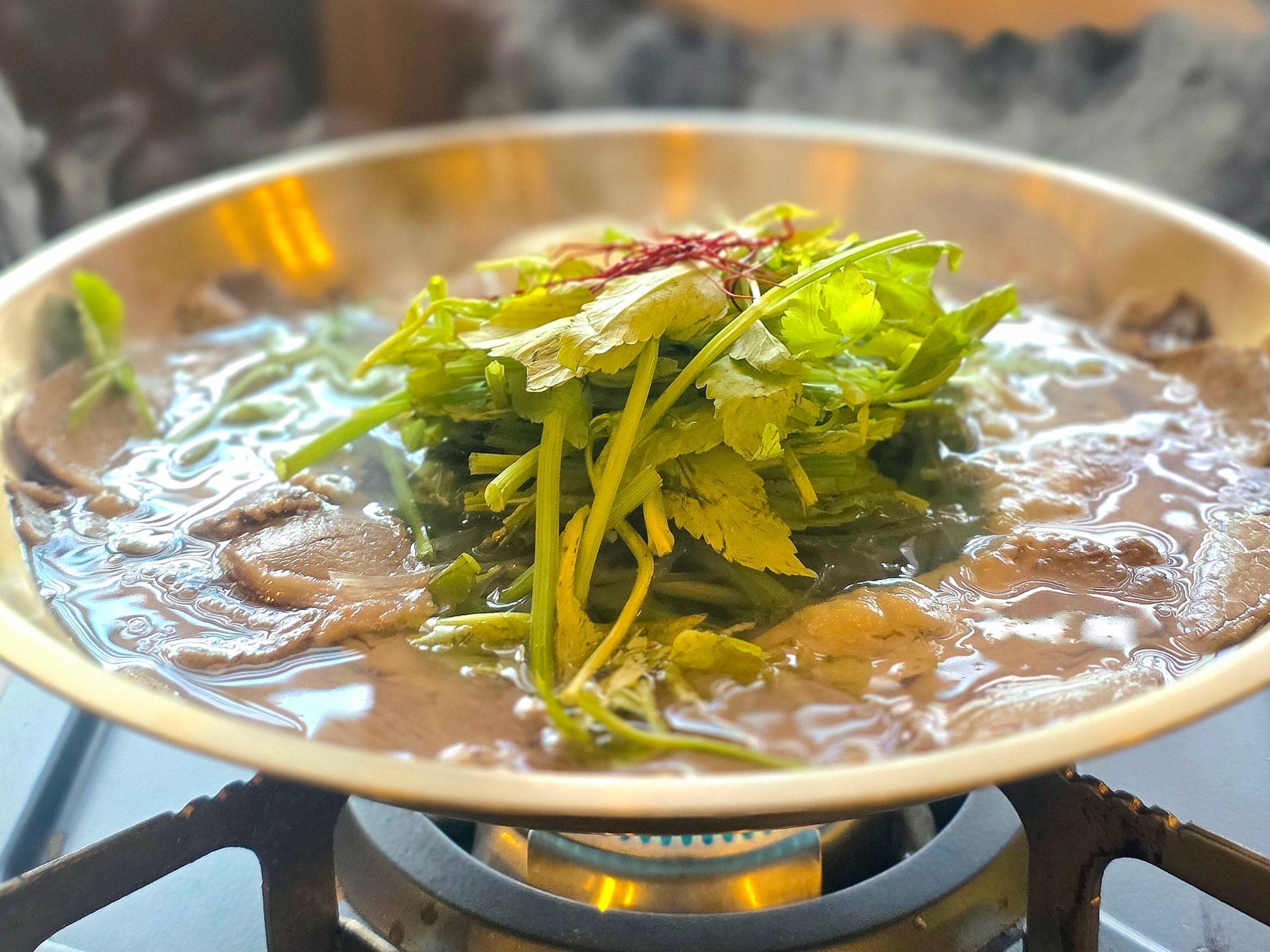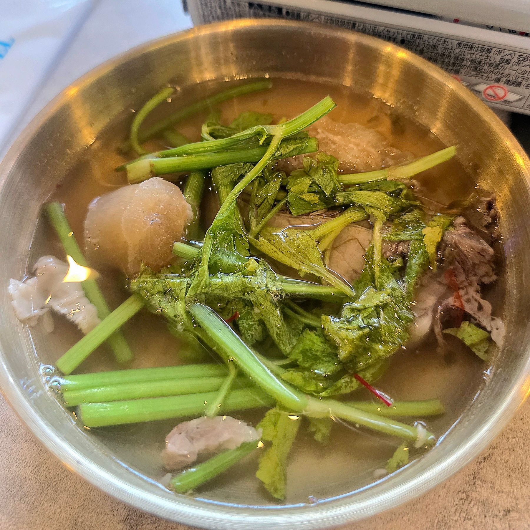 そこにたっぷりのミナリ(韓国のセリ)がアクセント。シャキッと爽やかな香りが広がります。