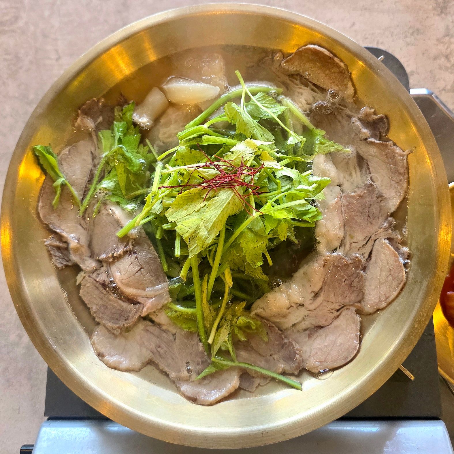 グツグツ煮立った熱々のスユク鍋に、茹でた牛肉がたっぷり。