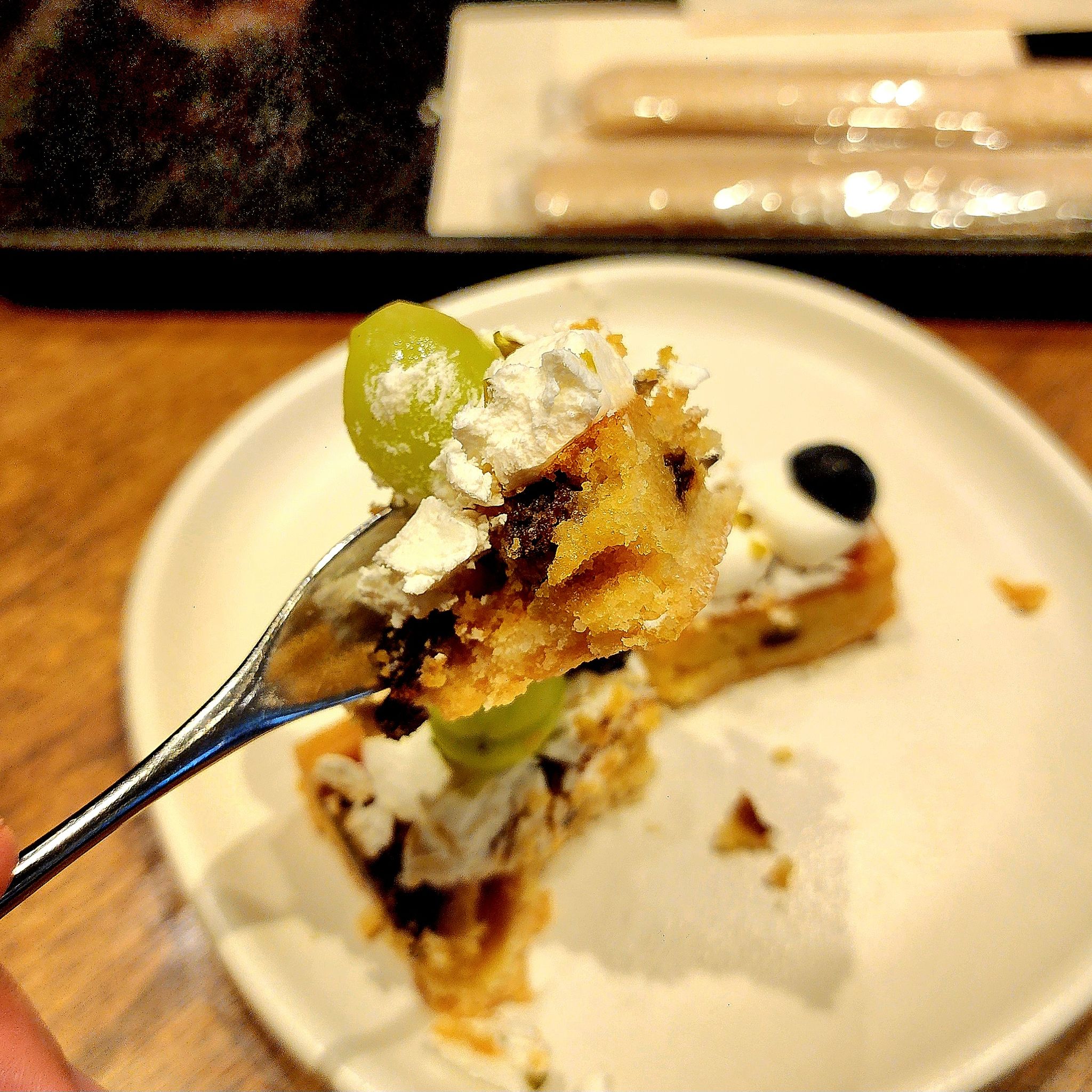 マスカットを使った季節のタルトはラムの香りが効いた大人の味わい。小ぶりなサイズなので、妻と半分に分けて楽しみました。