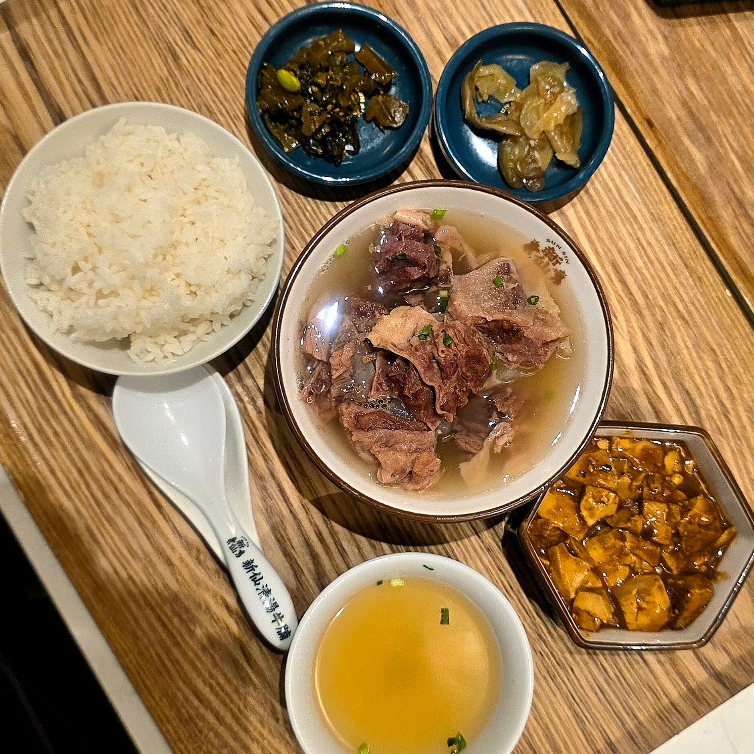 内容は、前菜2種、ご飯、スープ、牛肉煮込み、麻婆豆腐という豪華なセット。名物料理をスタンダードな清湯(チンタン)味で選びました。