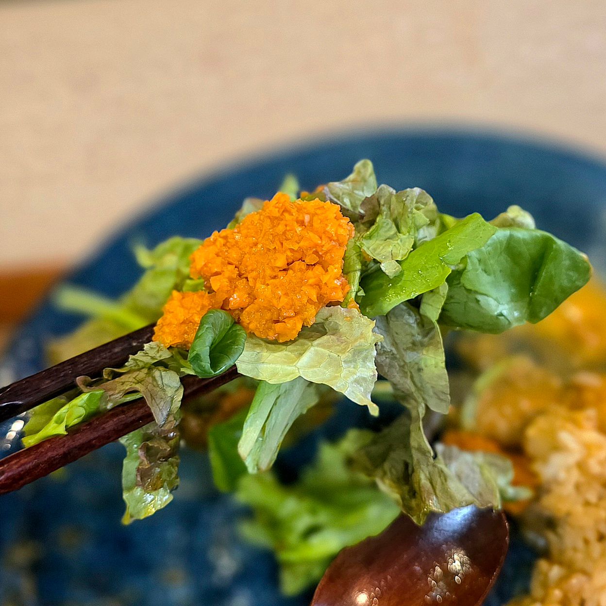 サラダには人参ドレッシングがかかっていて、野菜全体のバランス感が素晴らしかったです。