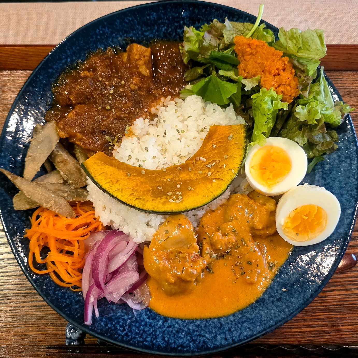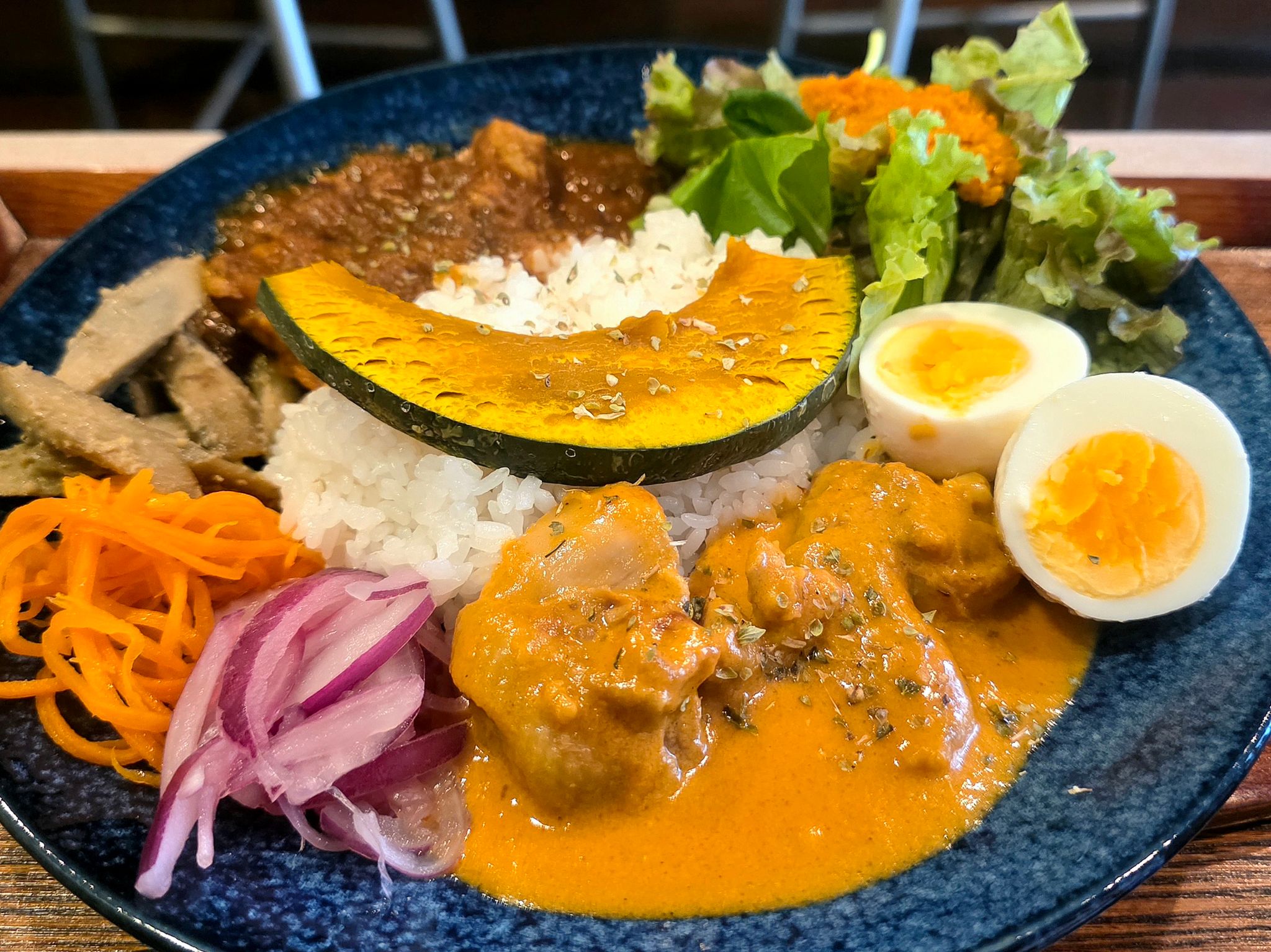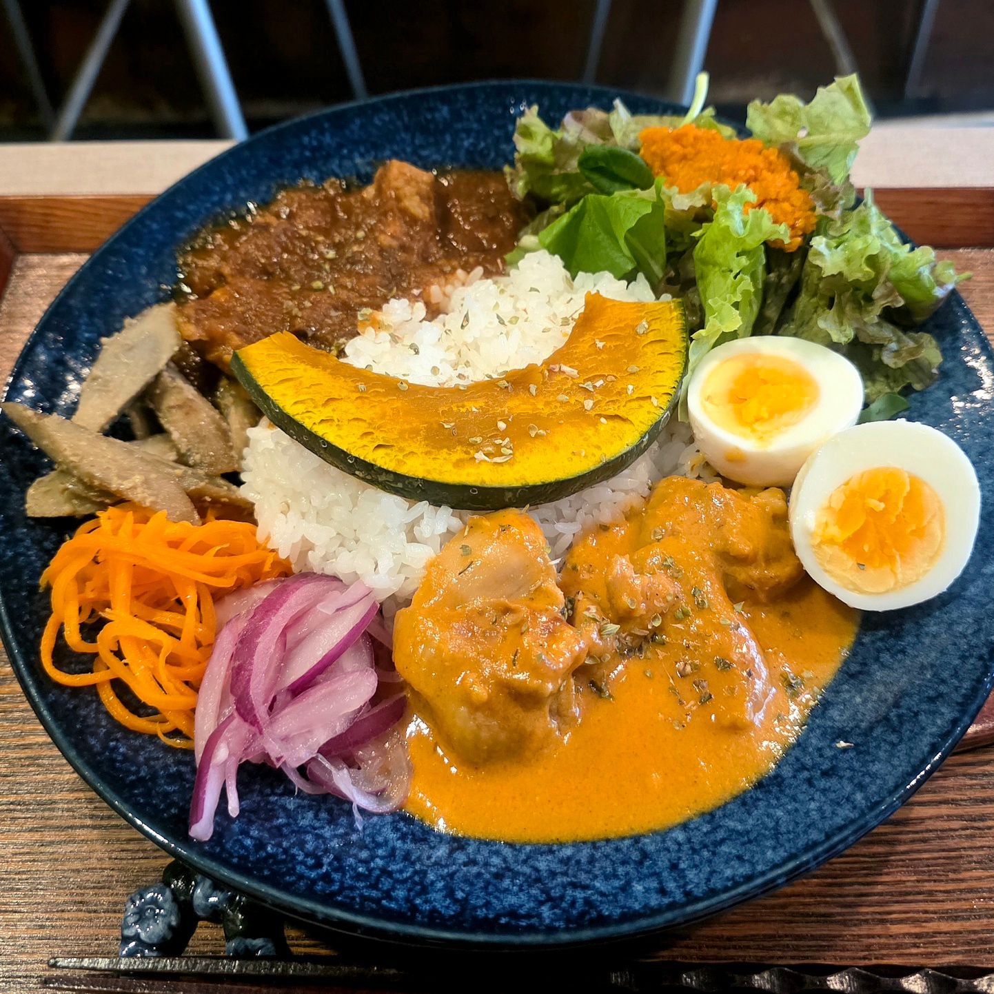 内容は、2種のカレー(ポークビンダルー&バターチキン)に、野菜を中心とした副菜3種、塩こうじ漬け卵、サラダ、そしてドリンク付きという充実ぶり。さらに嬉しいのは、グルテンフリー対応ということ。