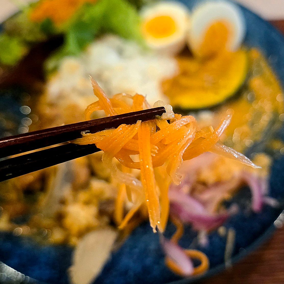 キャロットラペは人参本来の甘みを活かしつつもドレッシングがしっかり効いていて、カレーの合間に口をリセットしてくれます。