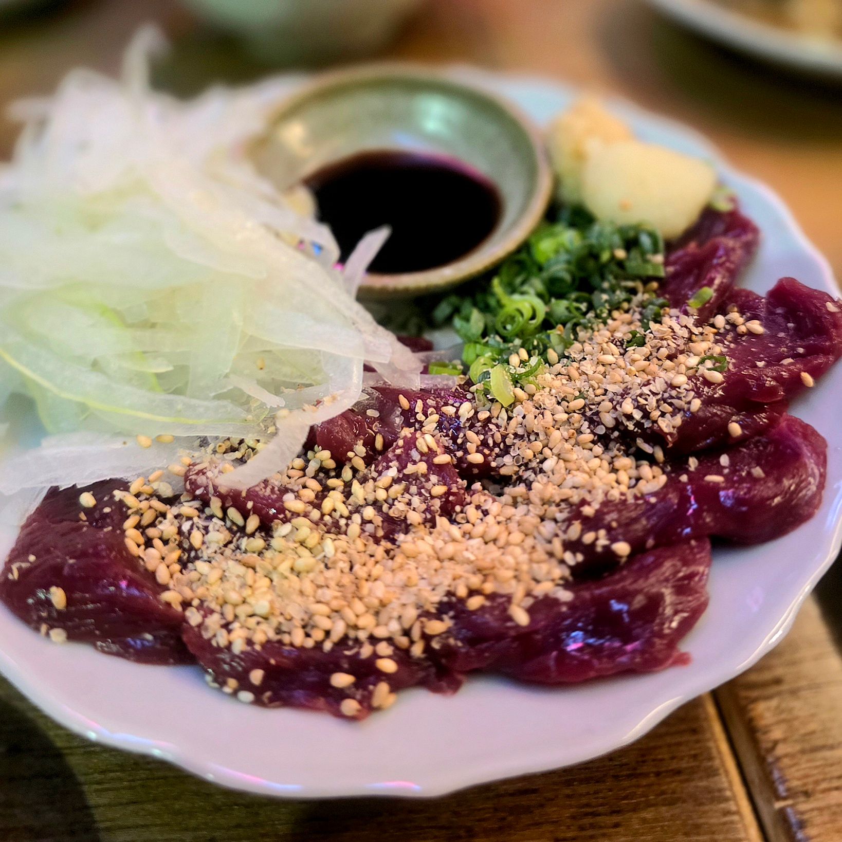 続いて「馬刺し(1,780円)」。こちらも非常に鮮度がよく、臭みがありません。脂が体温でほどけ、その甘みがふわっと広がるタイプです。