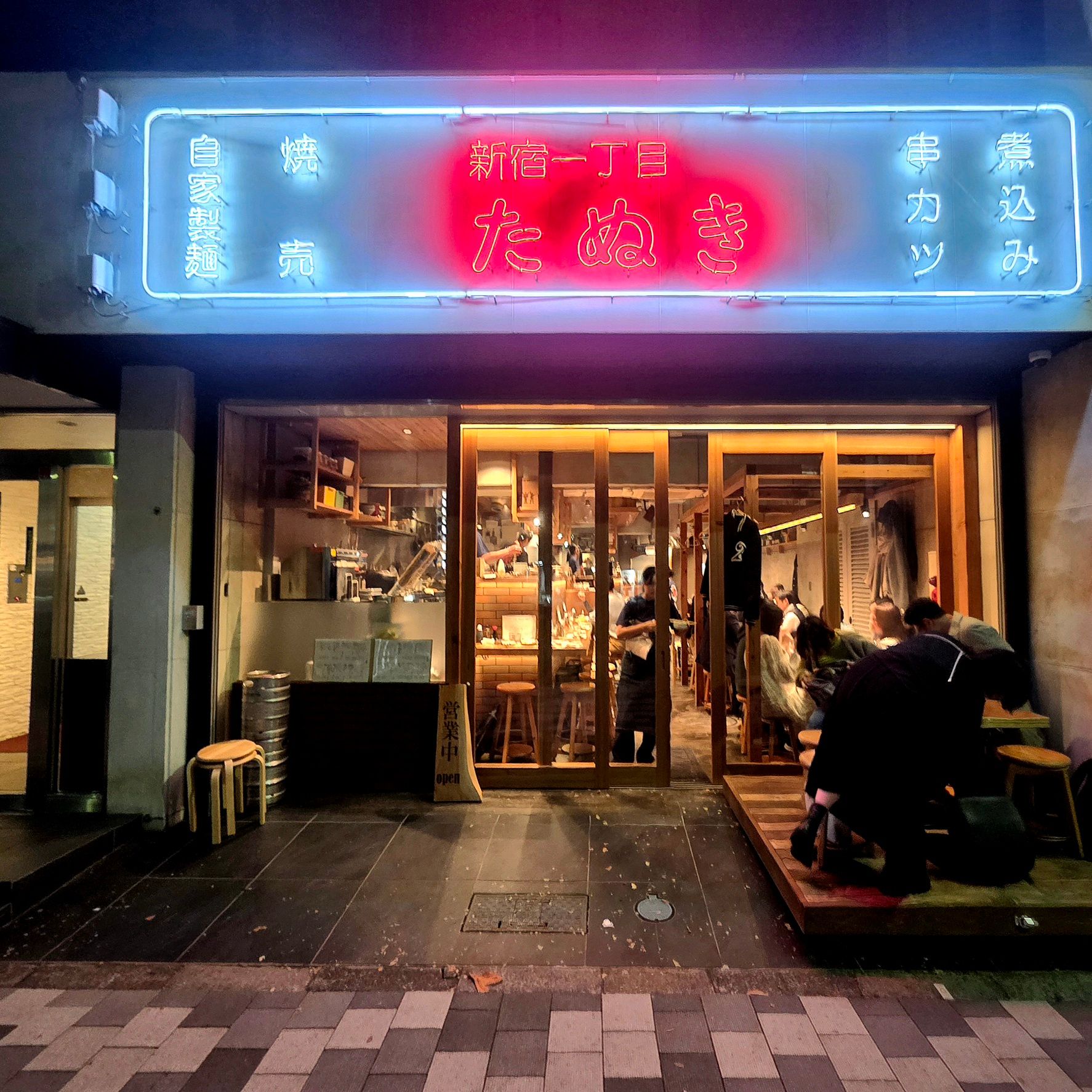 青山一丁目にある人気ネオ居酒屋「たぬき」の新店舗ということで、前から気になっていたお店です。夜の新宿一丁目は人通りもほどよく、店先の提灯の明かりに自然と惹かれます。