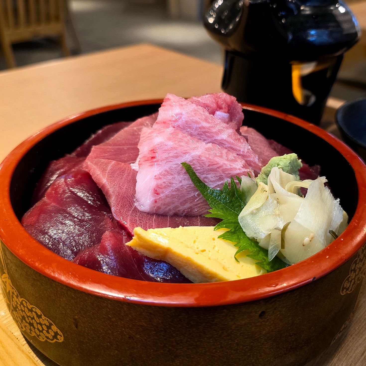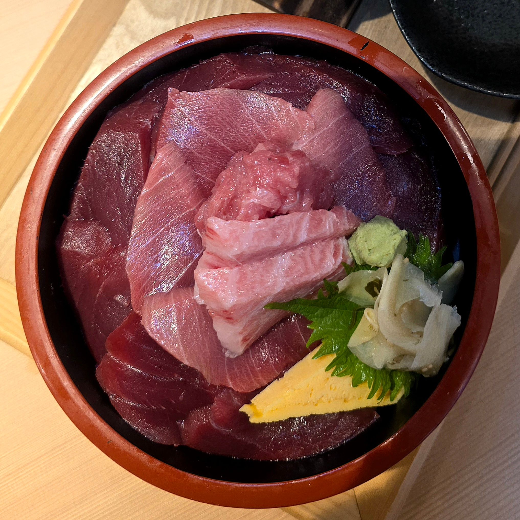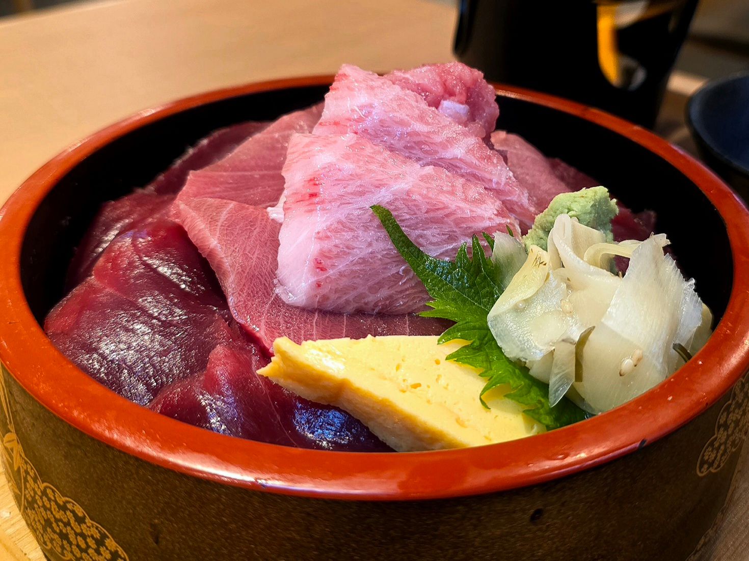 運ばれてきた瞬間に“勝ち確”のビジュアル。丼の中央に鎮座する大トロ、その周りを中トロ・中落ち・赤身が取り囲む構成で、まさにマグロのフルコース。
