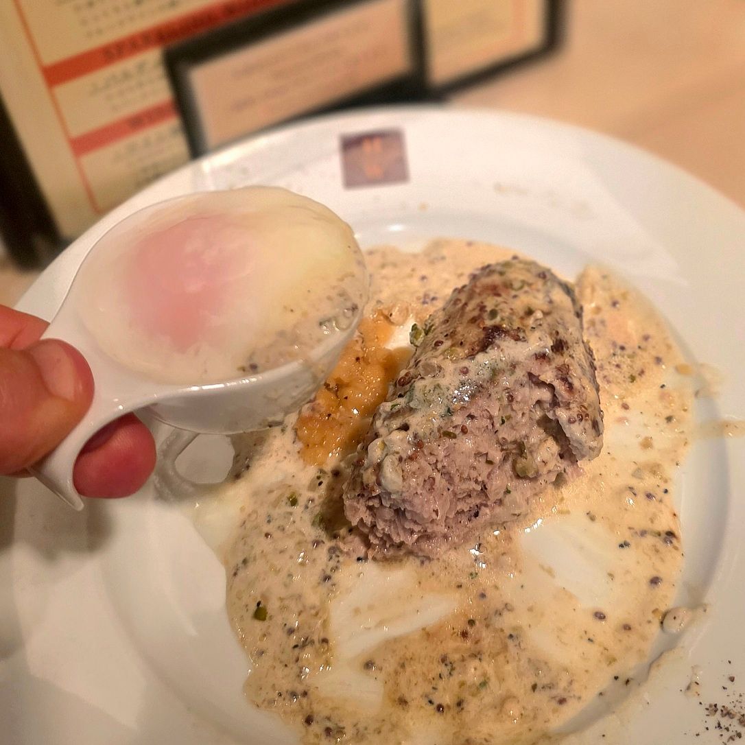 とろ〜り黄身が流れ出し、ソースと絡まることで、濃厚さが一段と増します。旨みの洪水。これは反則級。
